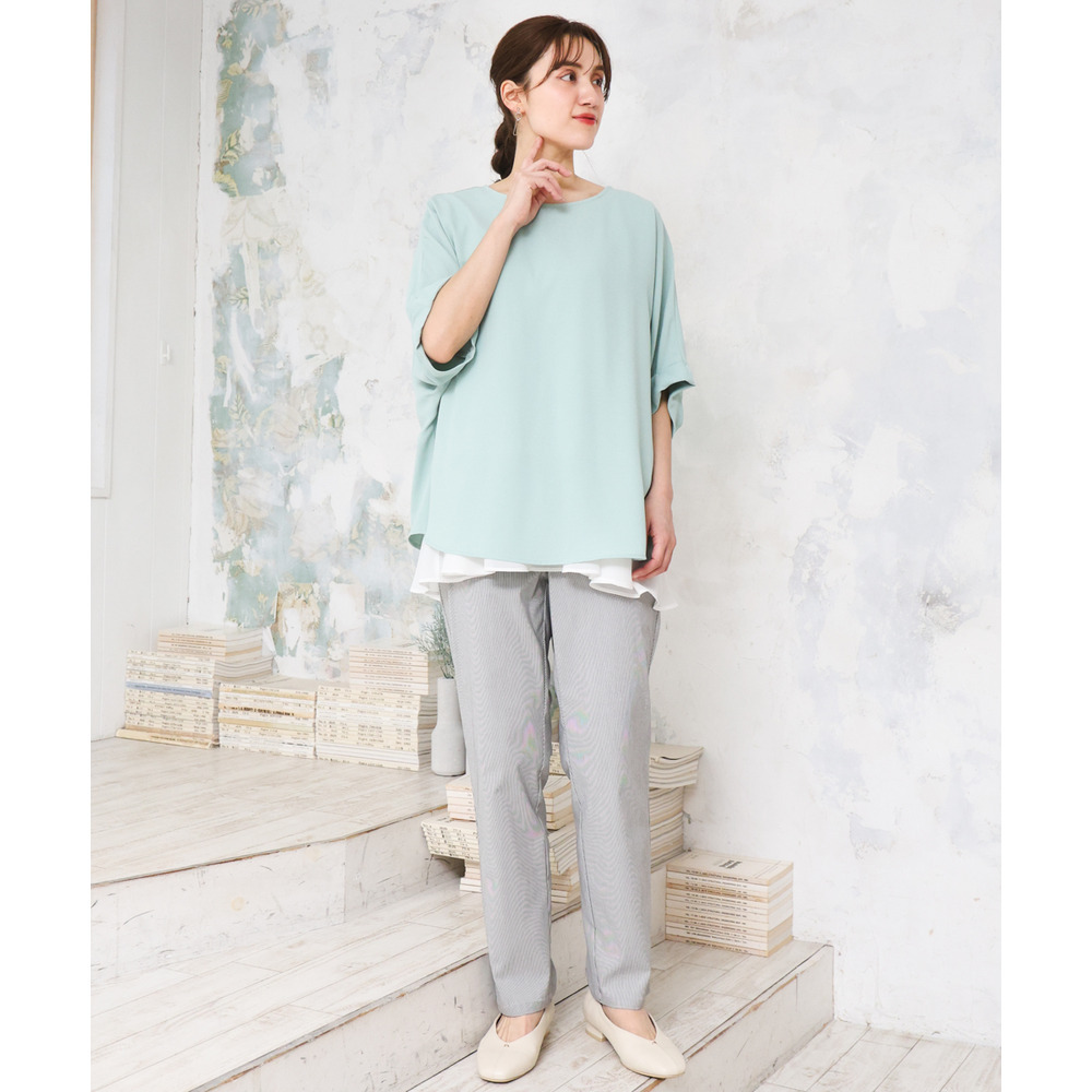 前身頃はシンプルなミニマルデザインなので、ワイドパンツやスリムボトムなど、どんなアイテムとも合わせやすく着回し力抜群です。