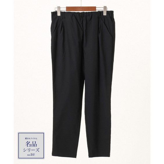 フロントウエストゴムのギャザーデザインが気になるお腹まわりを自然にカバーし、計算されたタック位置が縦ラインを強調してすっきり見せます。