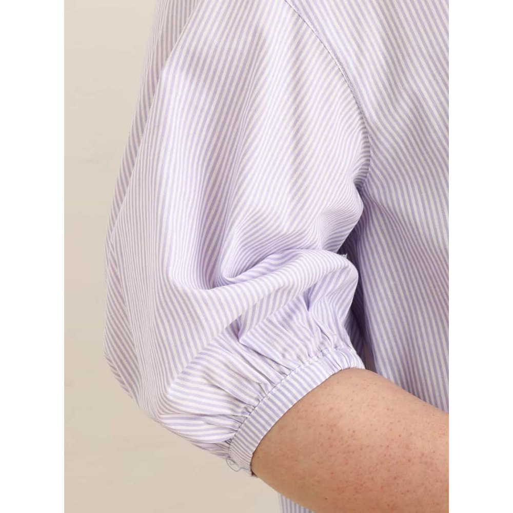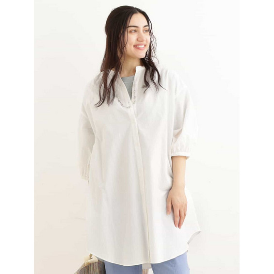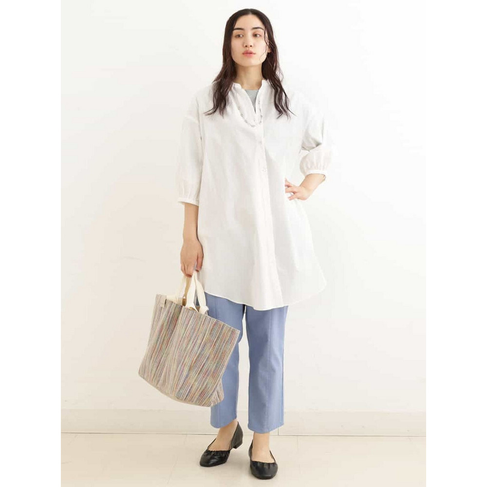 浅いVネックがすっきりとした、バンドカラーのチュニック丈のブラウス。