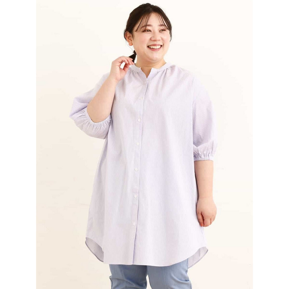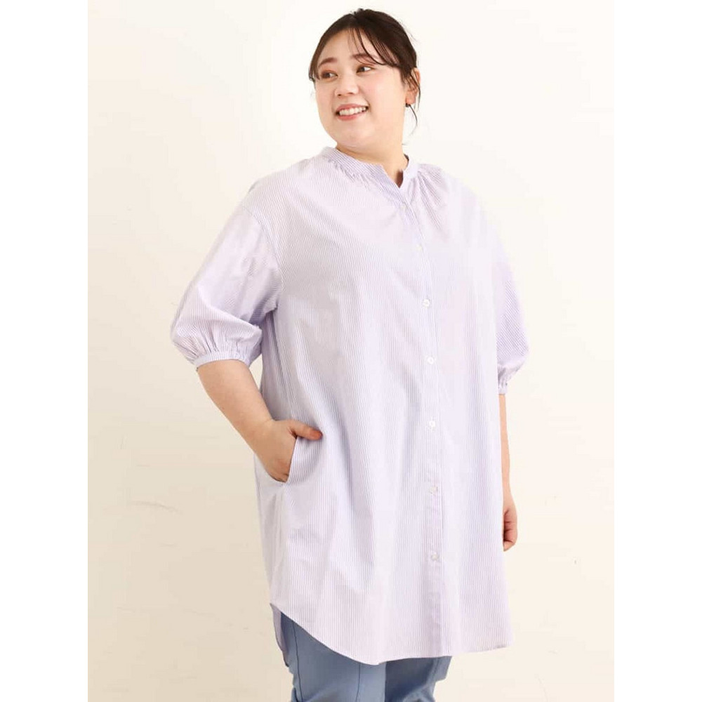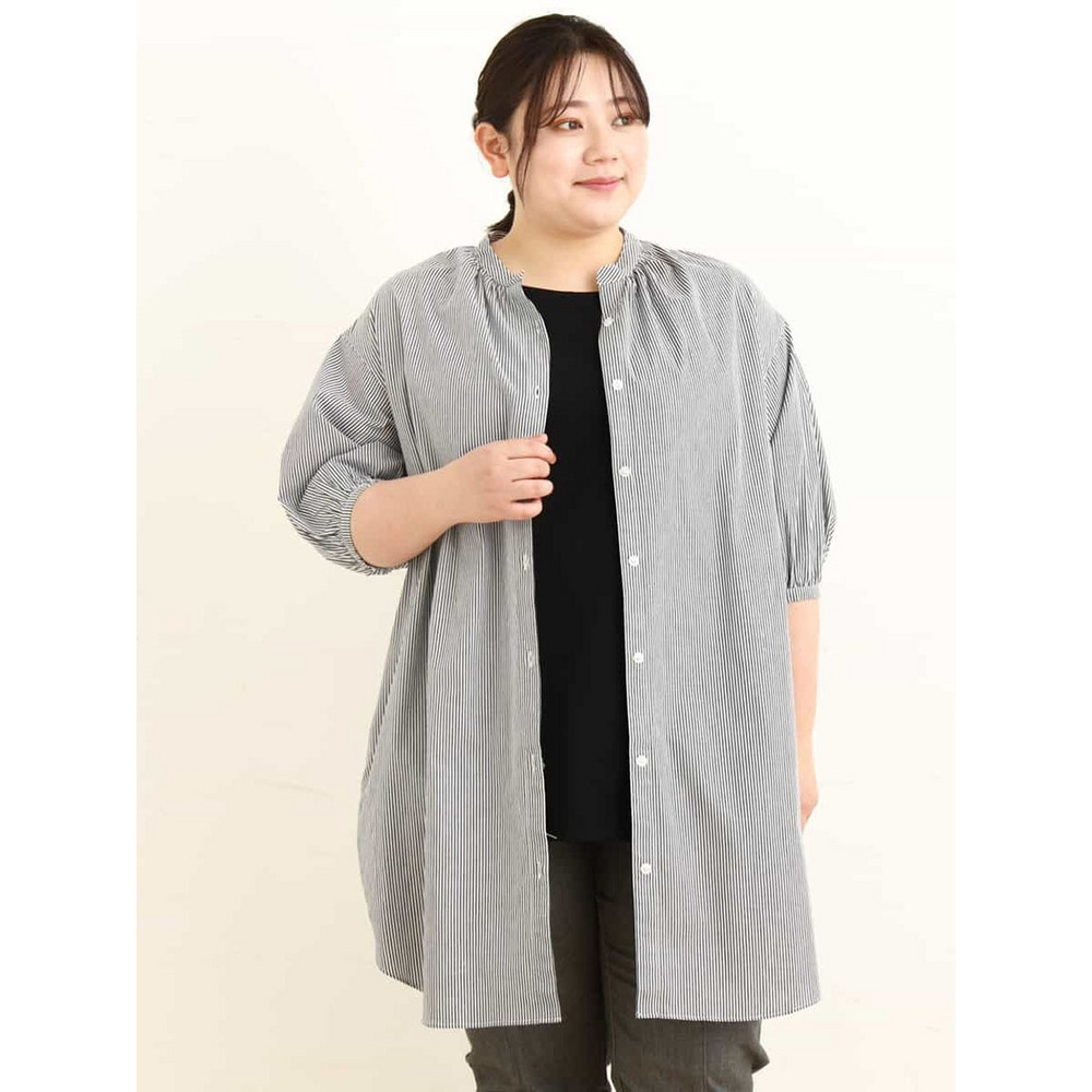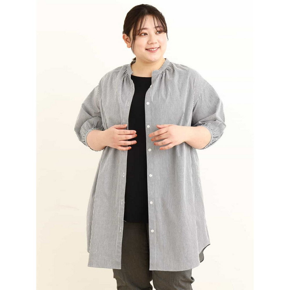 • 【大きいサイズ】バンドカラーストライプシャツチュニック1