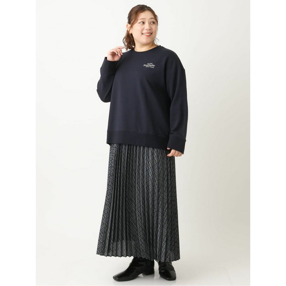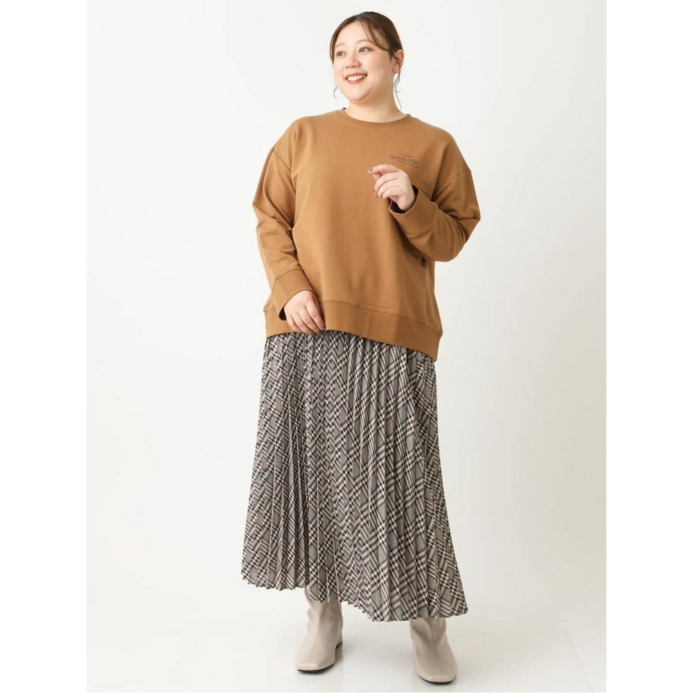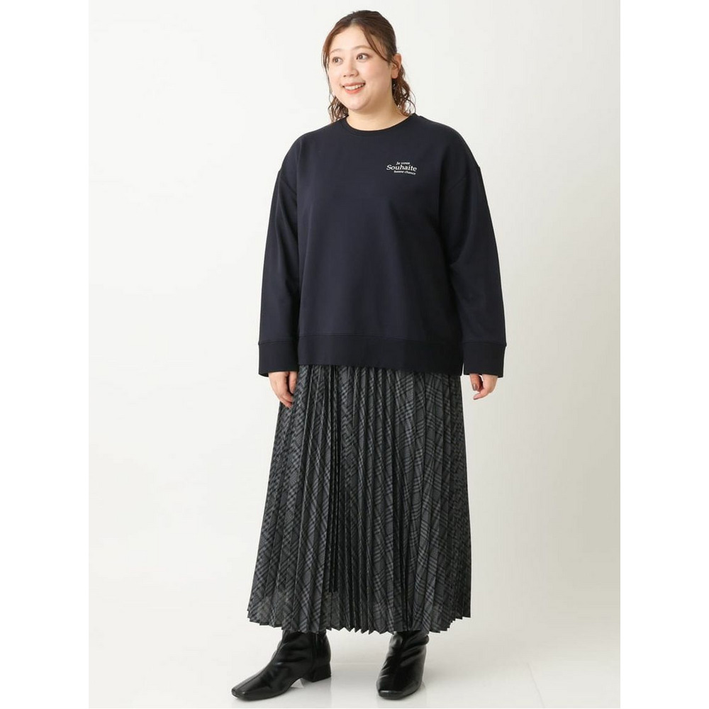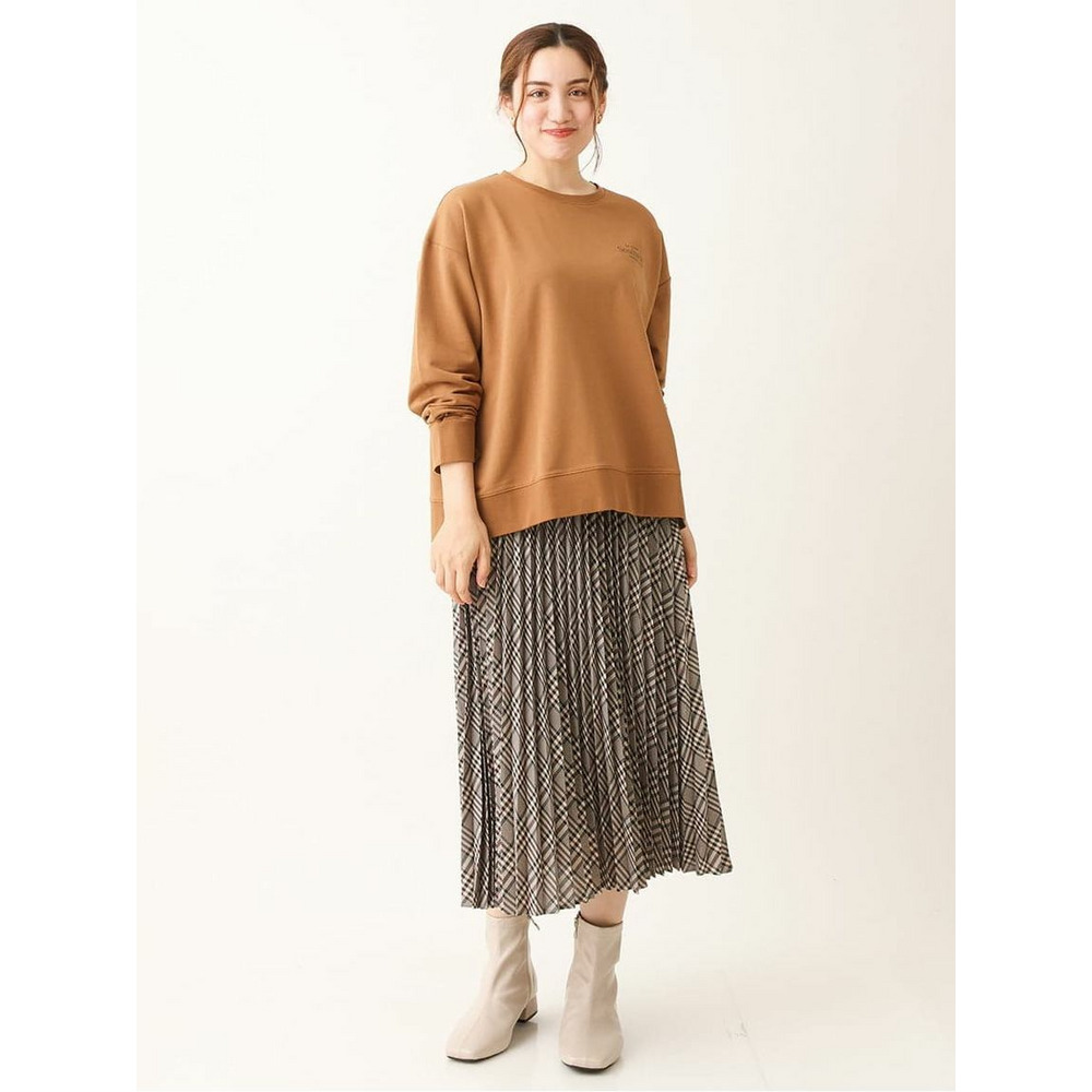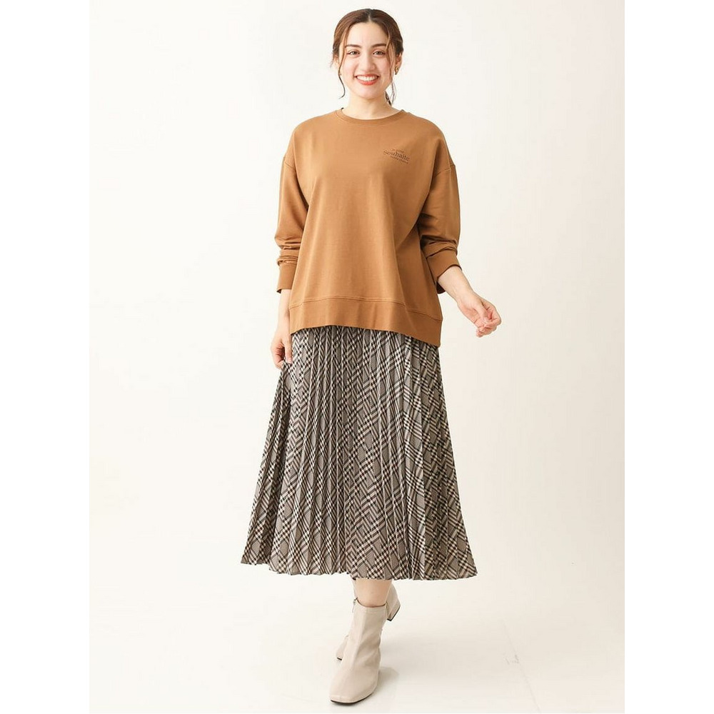 さりげないロゴプリント入りでスカート合わせの抜け感を出した着こなしもおすすめ。