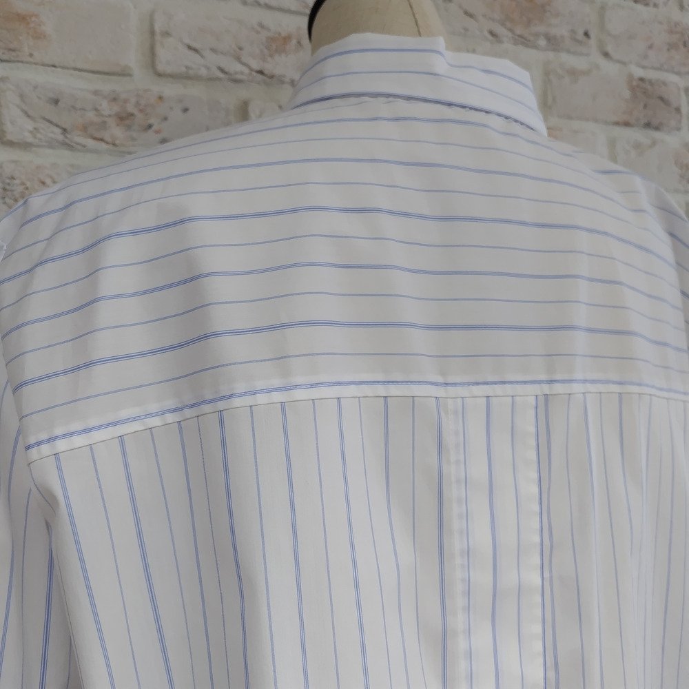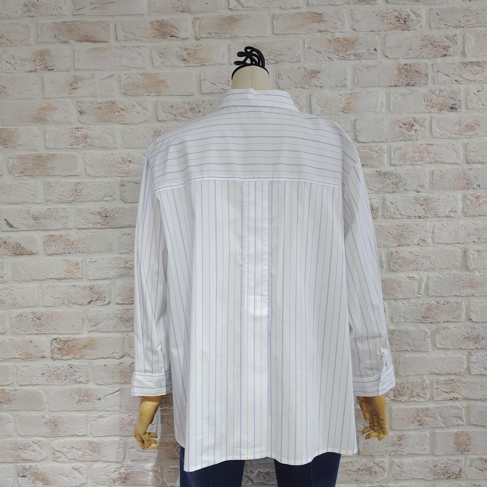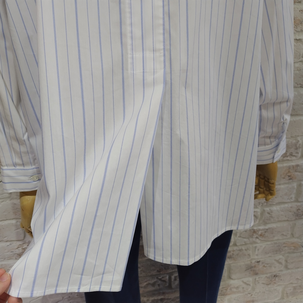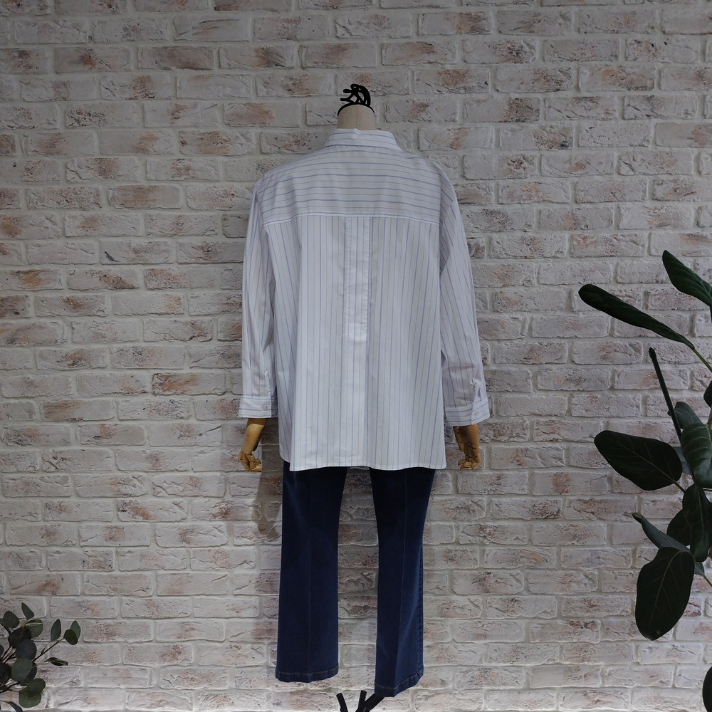 スッキリとした印象を与えるストライプデザインが特徴の、スタイリッシュな一着です。後中心はベンツあきになっており、動きやすさを実現しながら、ゆったりしたお腹回りで快適な着心地を提供します。どんなボトムスとも相性が良く、一着で多彩なコーディネートを楽しむことができます。
