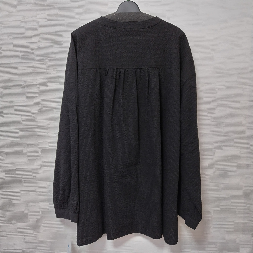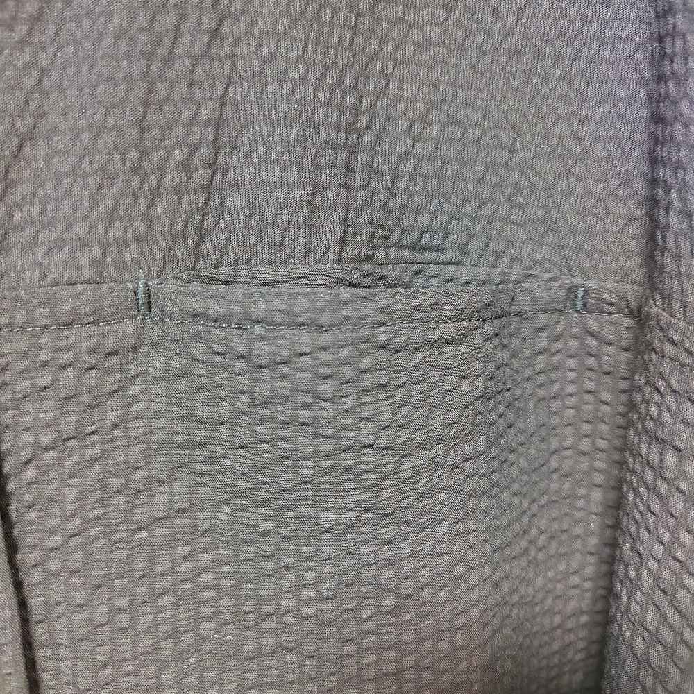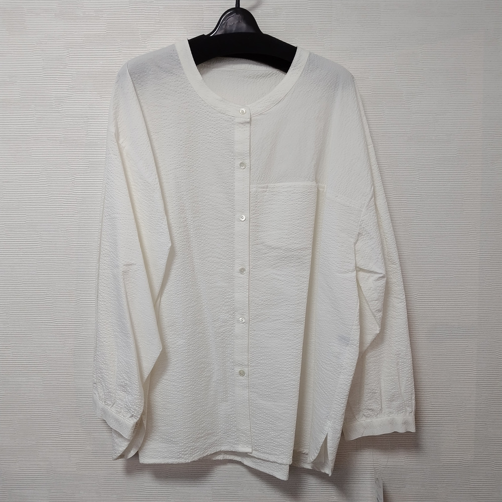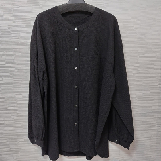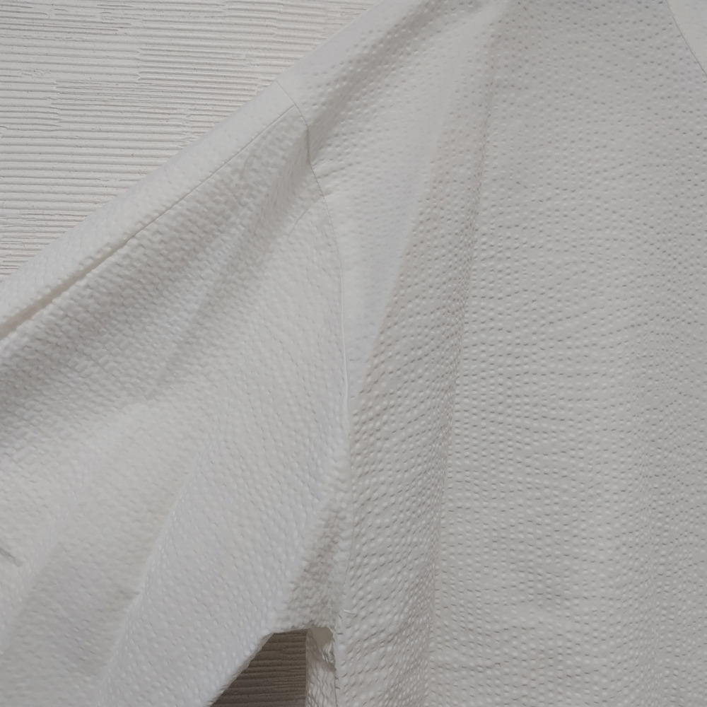 凹凸感が特徴のミラクルウエーブ生地を使用しており、独特の素材感が魅力の一着です。タックとギャザー入りの袖がほどよいボリューム感を演出し、左右のコーディネートによって異なる印象を楽しむことができます。左胸に施された切替ポケットも実用的であり、デザインのアクセントとなっています。