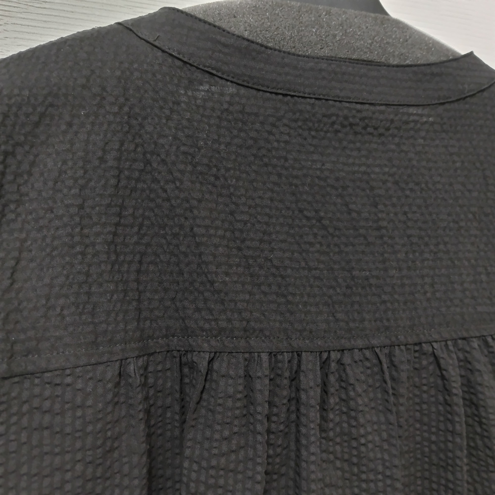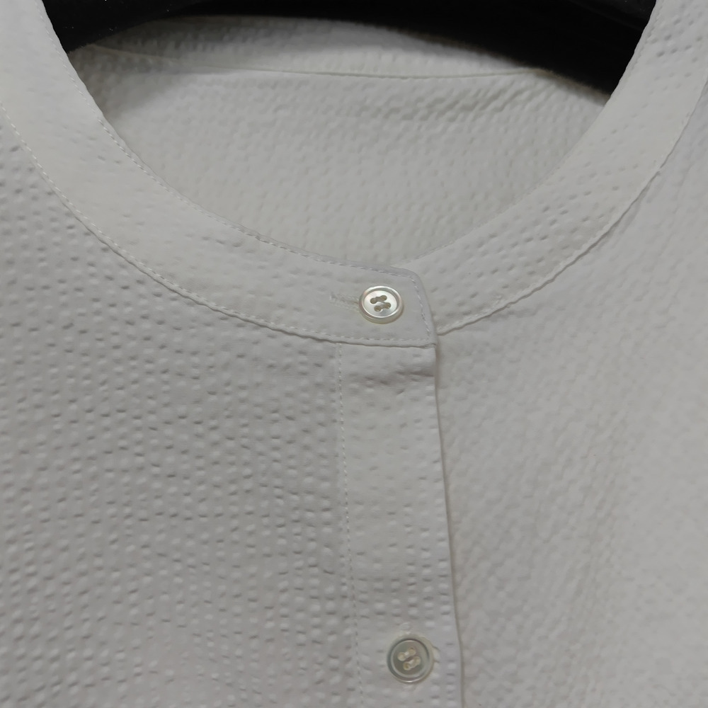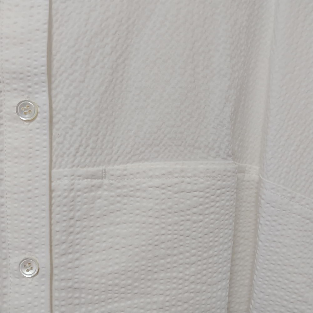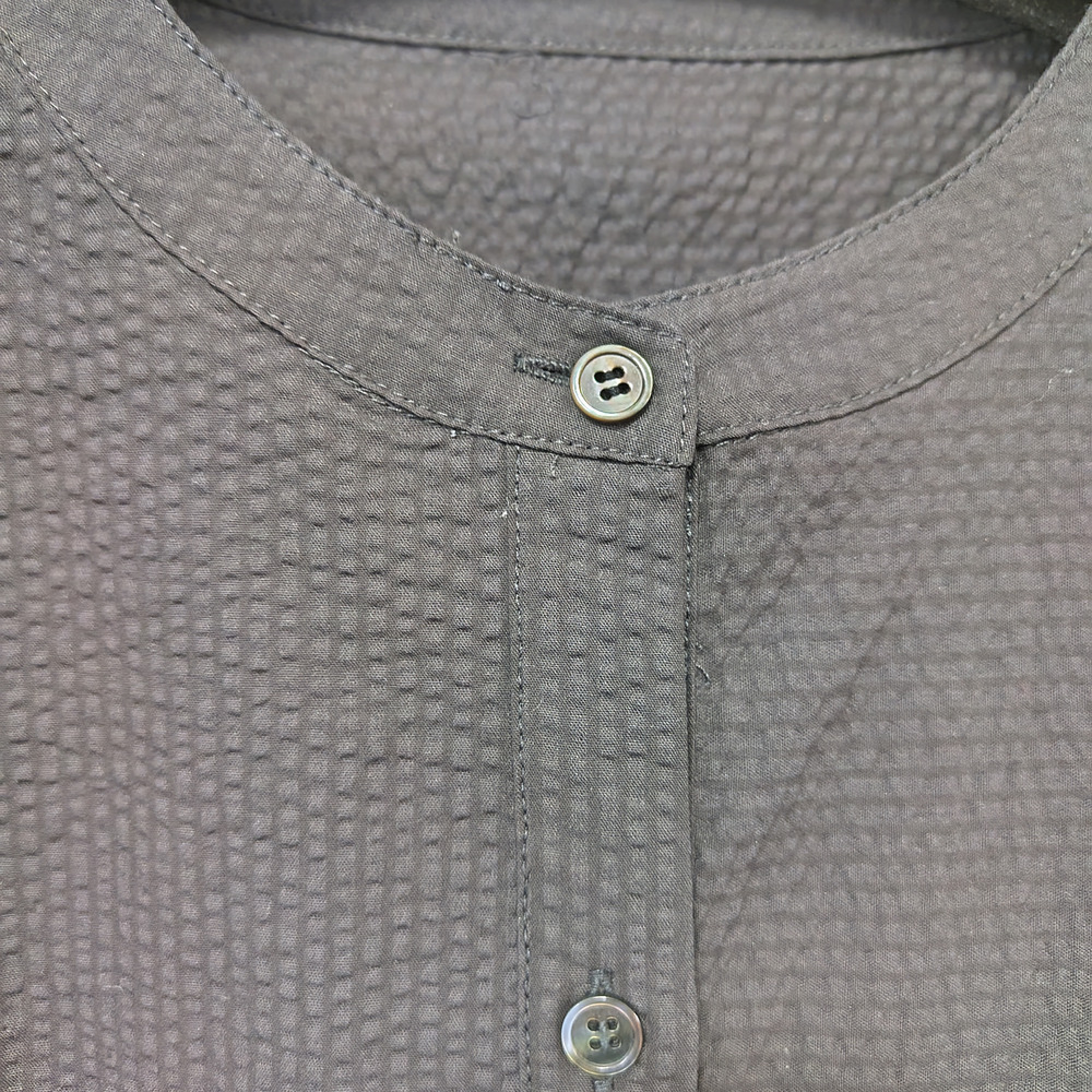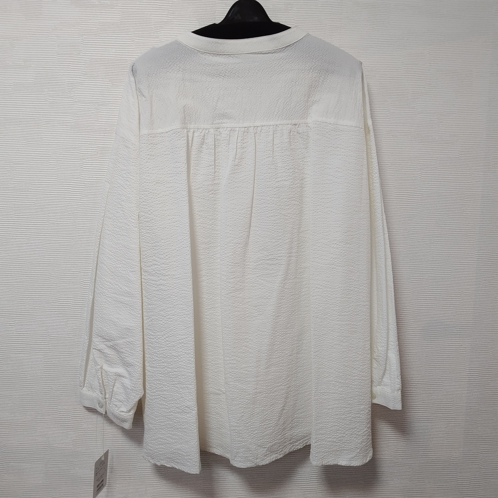 凹凸感が特徴のミラクルウエーブ生地を使用しており、独特の素材感が魅力の一着です。タックとギャザー入りの袖がほどよいボリューム感を演出し、左右のコーディネートによって異なる印象を楽しむことができます。左胸に施された切替ポケットも実用的であり、デザインのアクセントとなっています。