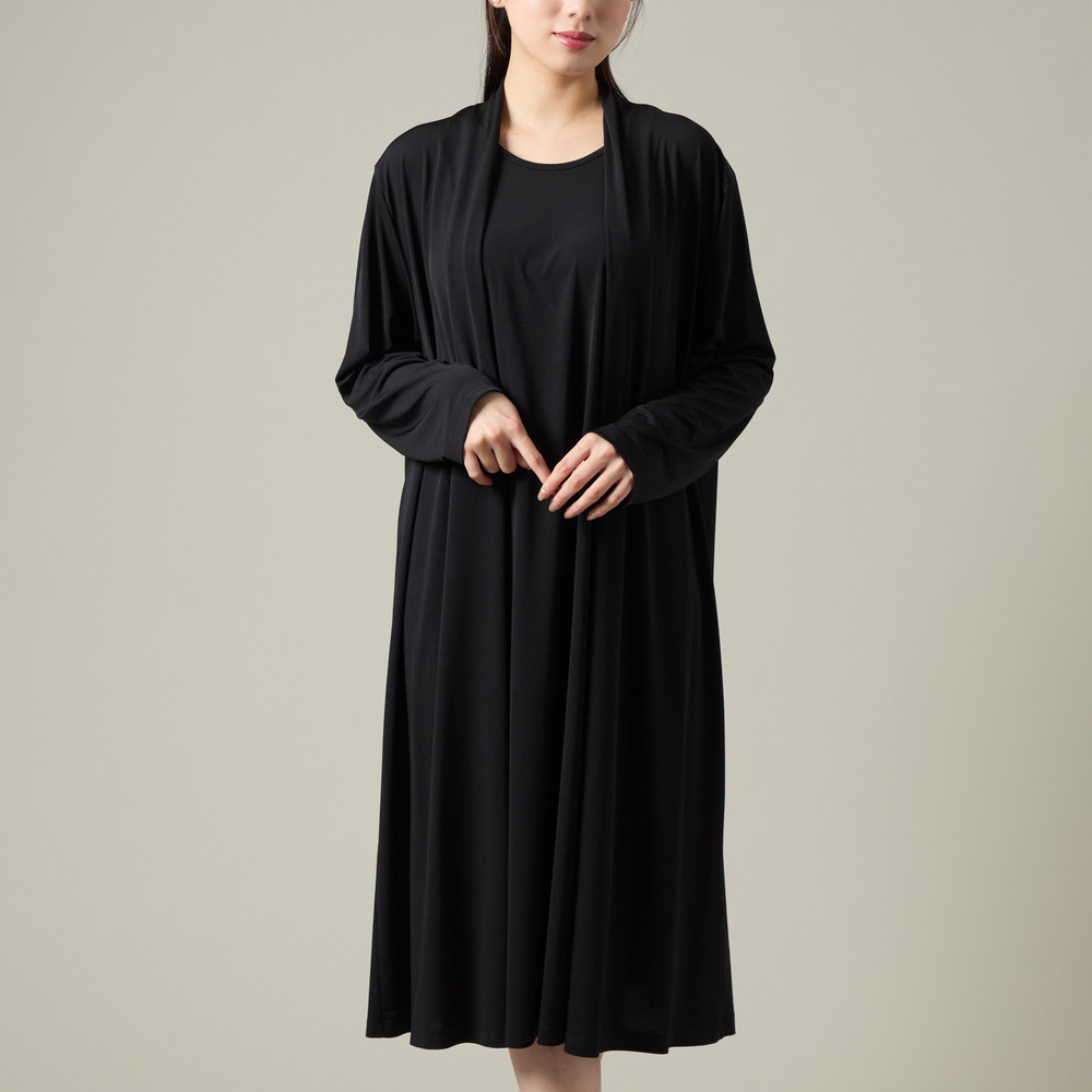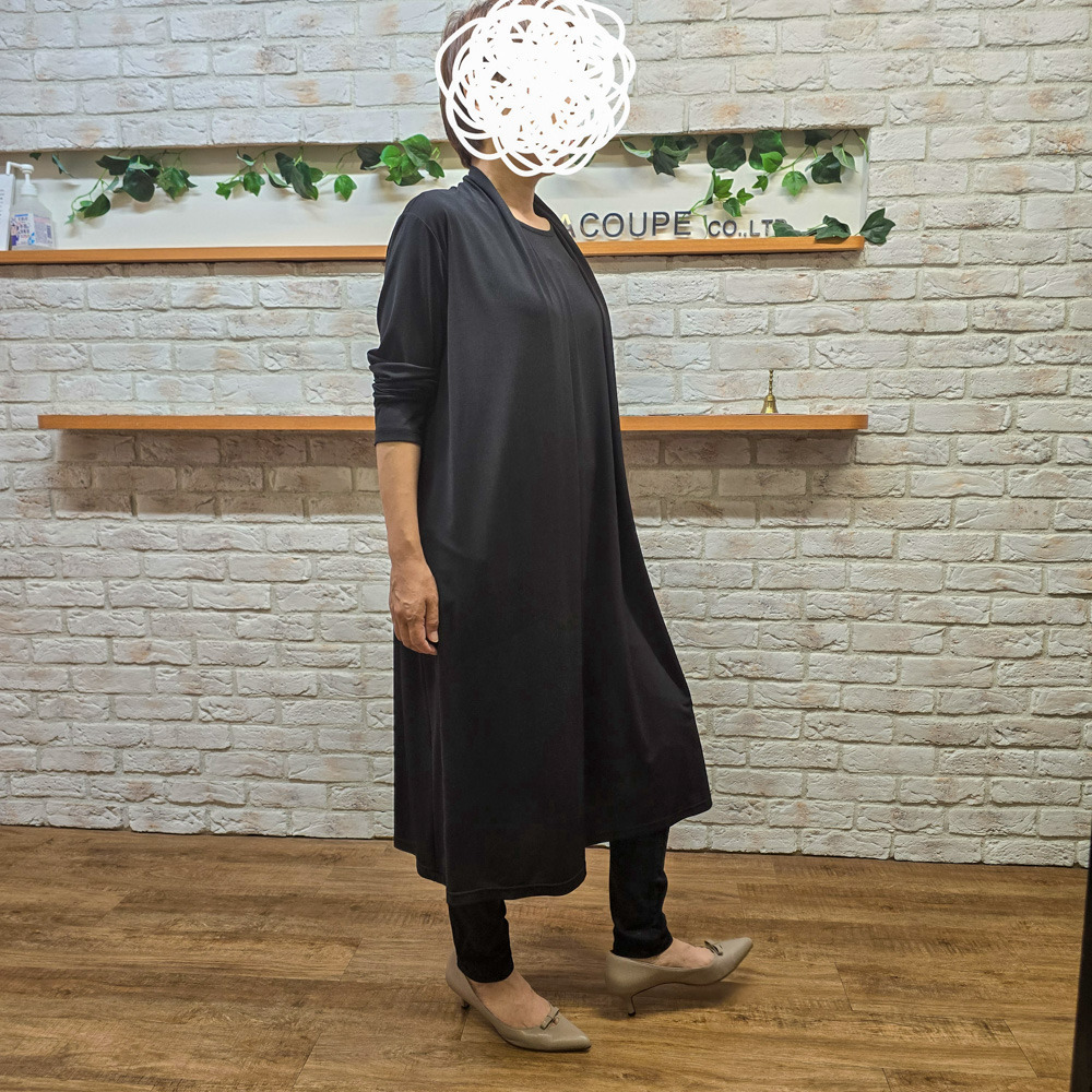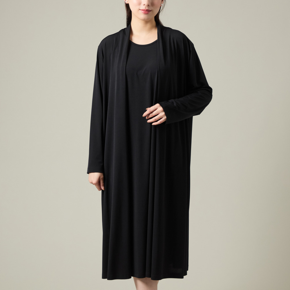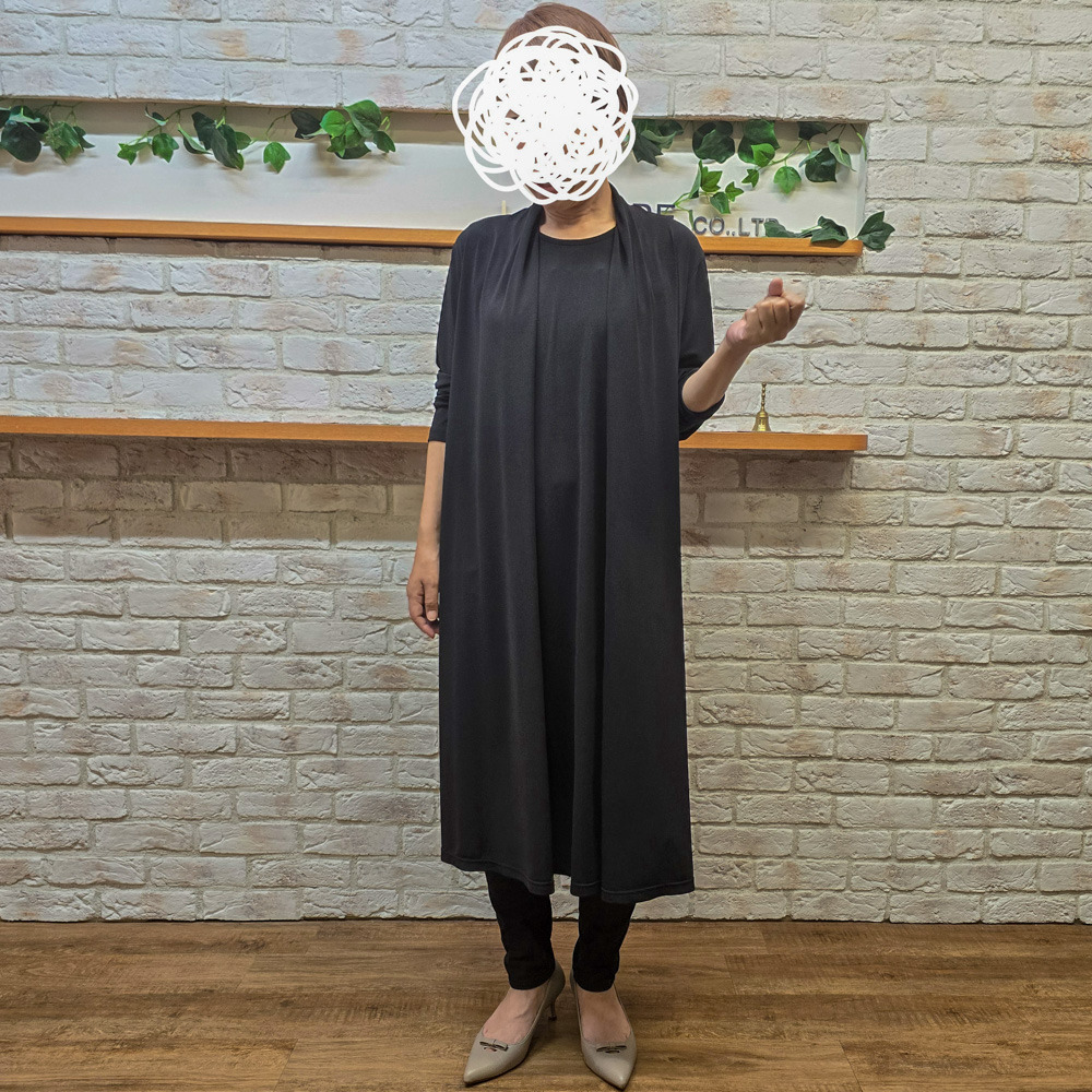 このワンピースは、羽織を着ているようなドレープをデザインとしてカットソー素材を使用して作られました。