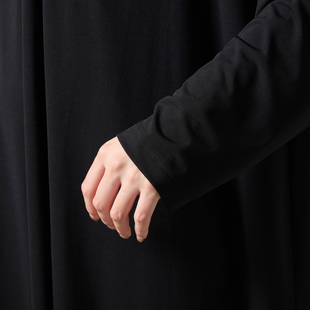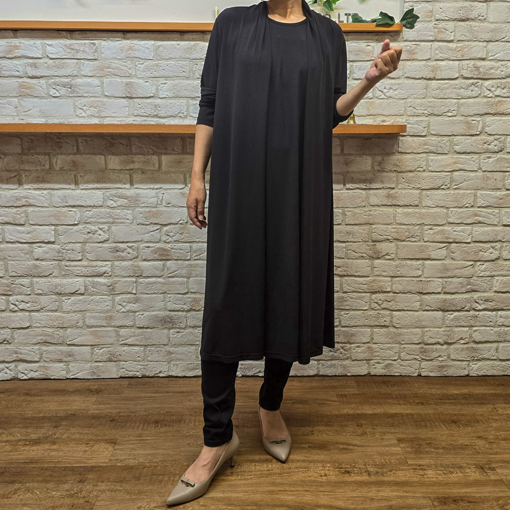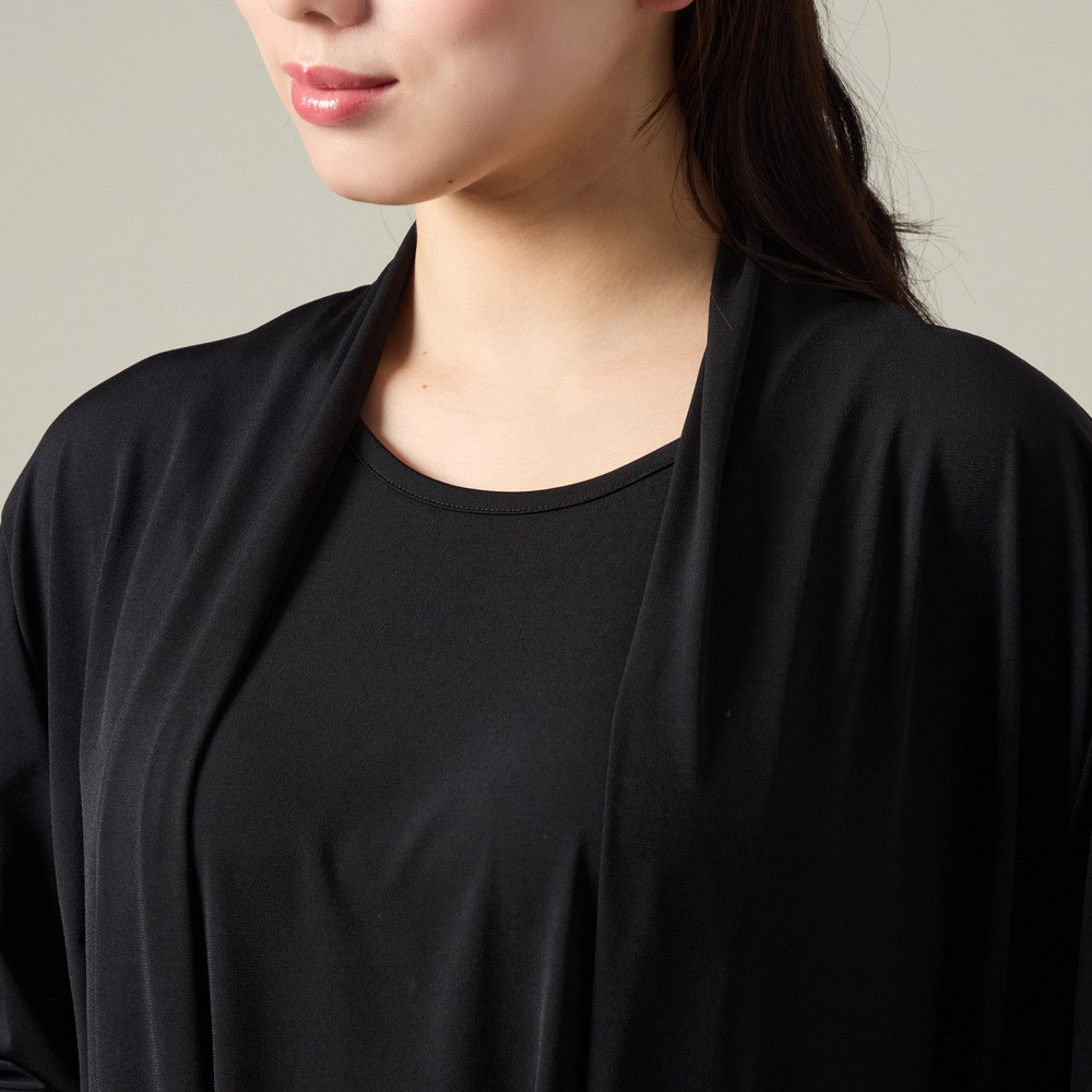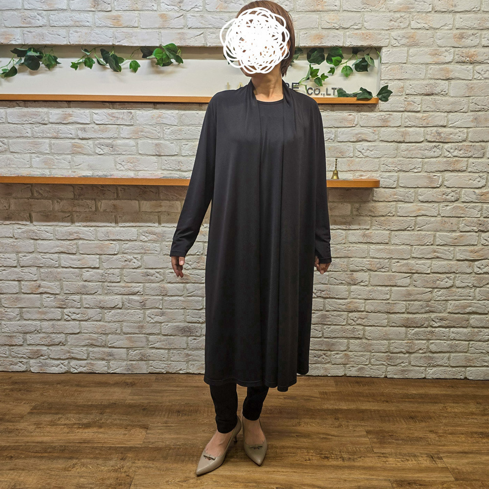 このワンピースは、羽織を着ているようなドレープをデザインとしてカットソー素材を使用して作られました。
