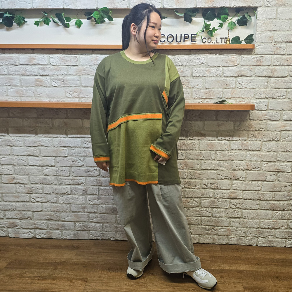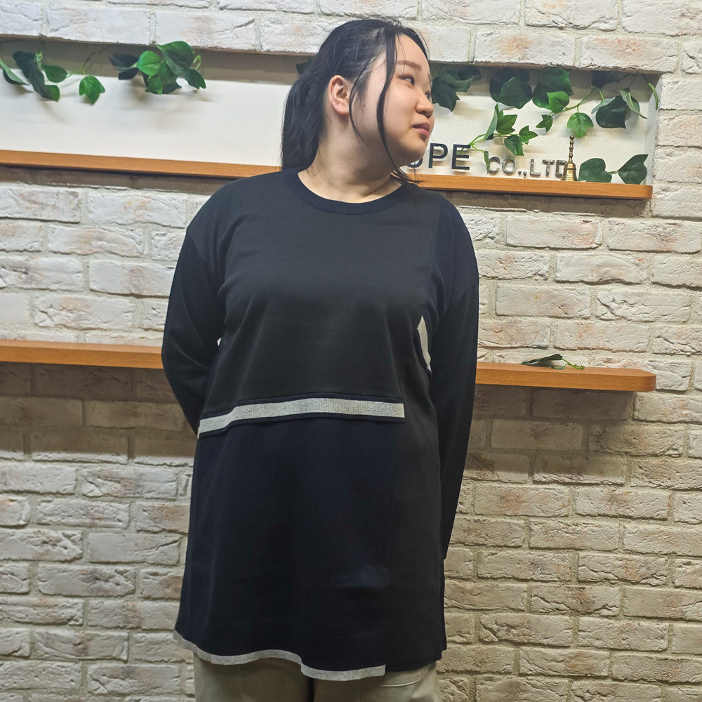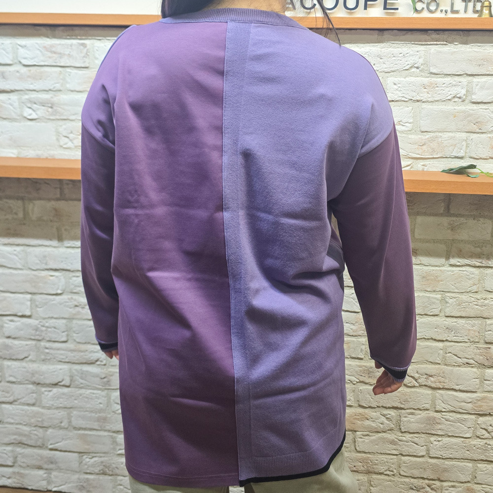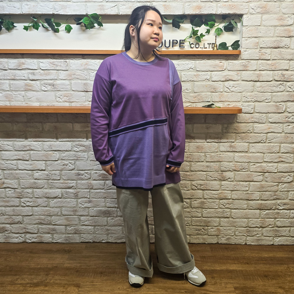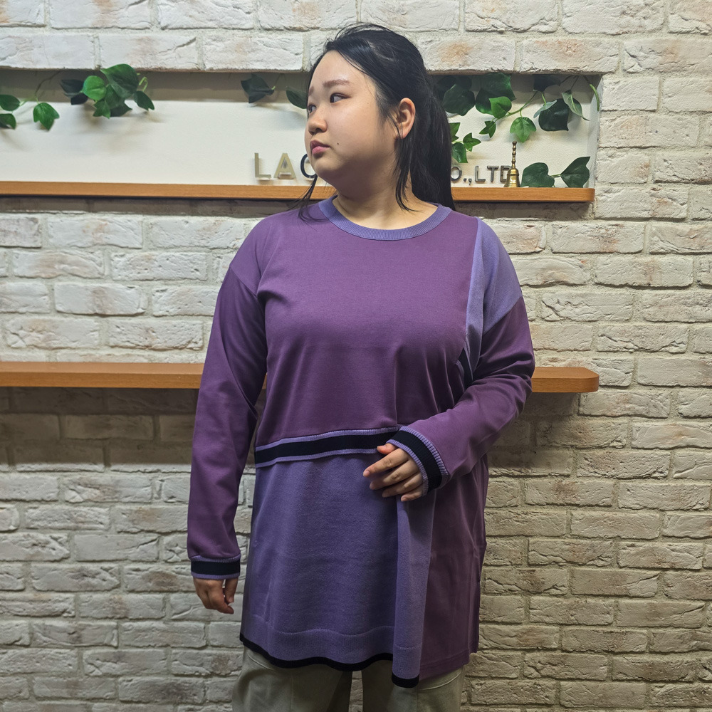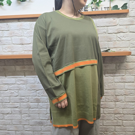 [型番:7254802]秋の始まりにピッタリなニットのチュニックを作りました。ニット地とジャージ生地をパッチワークした特別なテクニックを使って仕上げた遊び心のあるデザインです。カジュアル過ぎない、大人の女性でも上品見えする配色にこだわりました。ニットの編地で入れたラインの配色がシンプルモダンなデザインポイントです。合わせるボトムスはストレートやスリムのデニムやテーパードパンツ、またトレンド色の強いバレルカットのデニムでも合わせやすい丈感になっているので、コーディネイトが楽しめるチュニックです。ほど良い厚み感のある綿のニット×ジャージーなので寒い冬はインナーにタートルをレイアードしてコートインに、役立つ1枚です。