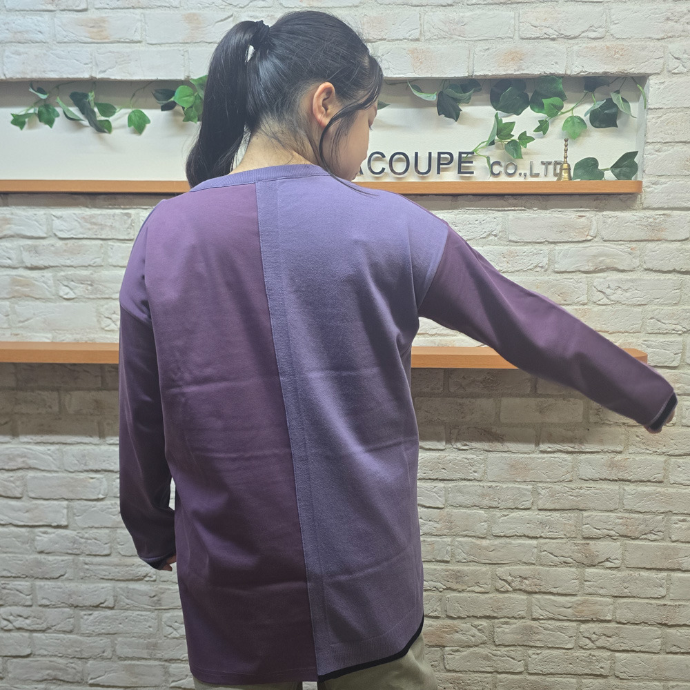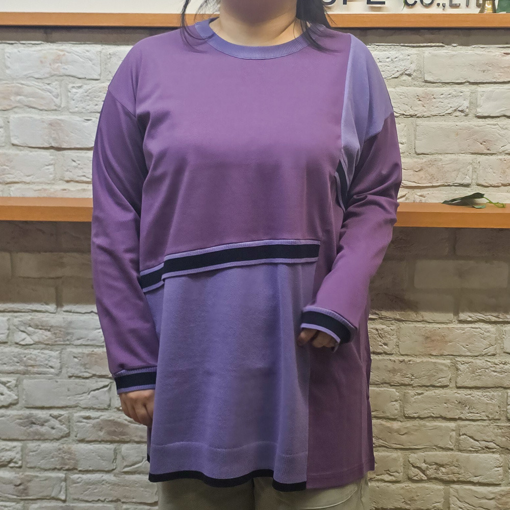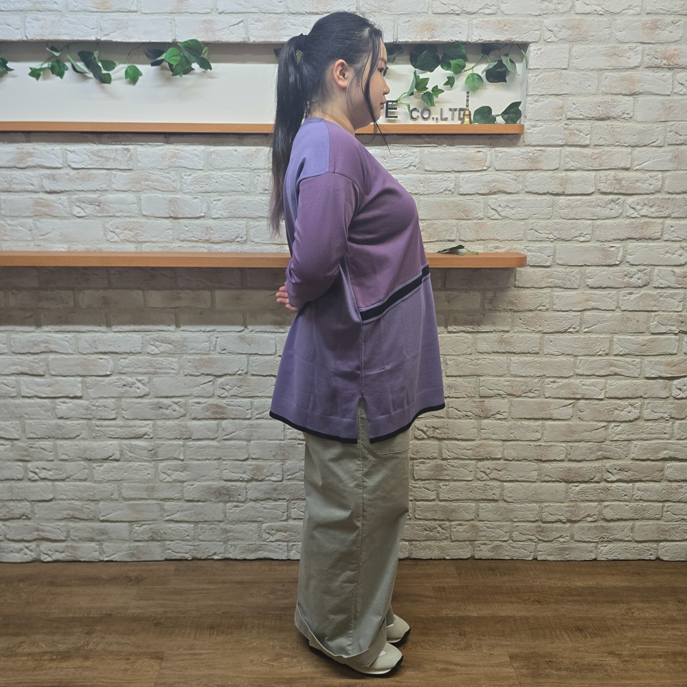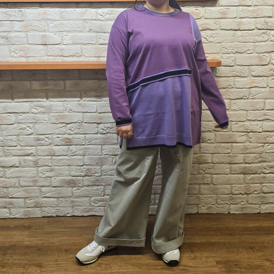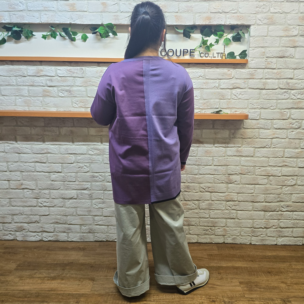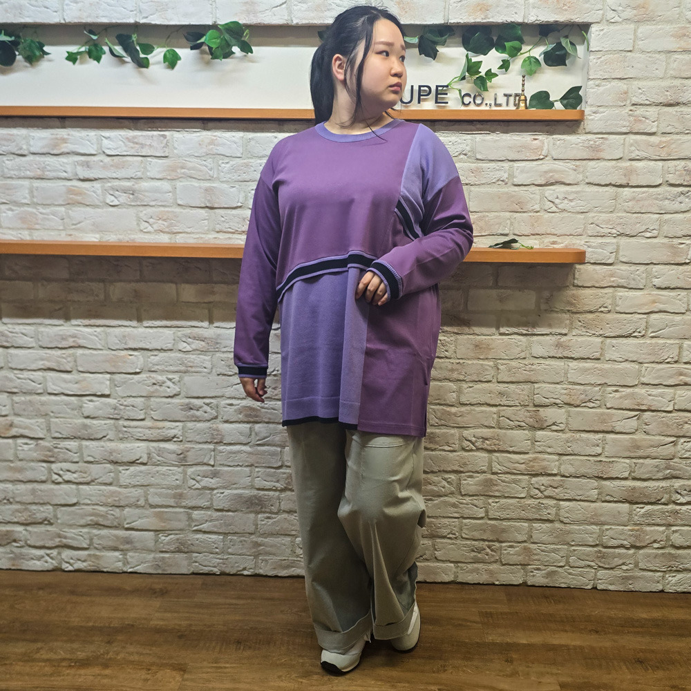 [型番:7254802]秋の始まりにピッタリなニットのチュニックを作りました。ニット地とジャージ生地をパッチワークした特別なテクニックを使って仕上げた遊び心のあるデザインです。カジュアル過ぎない、大人の女性でも上品見えする配色にこだわりました。ニットの編地で入れたラインの配色がシンプルモダンなデザインポイントです。合わせるボトムスはストレートやスリムのデニムやテーパードパンツ、またトレンド色の強いバレルカットのデニムでも合わせやすい丈感になっているので、コーディネイトが楽しめるチュニックです。ほど良い厚み感のある綿のニット×ジャージーなので寒い冬はインナーにタートルをレイアードしてコートインに、役立つ1枚です。