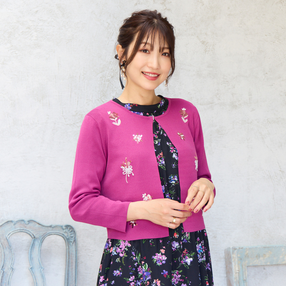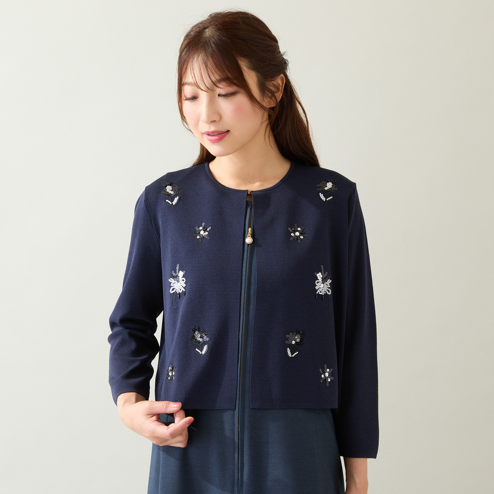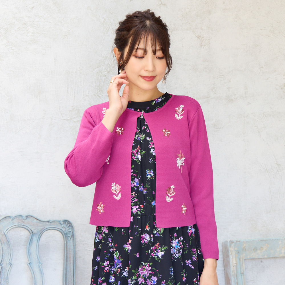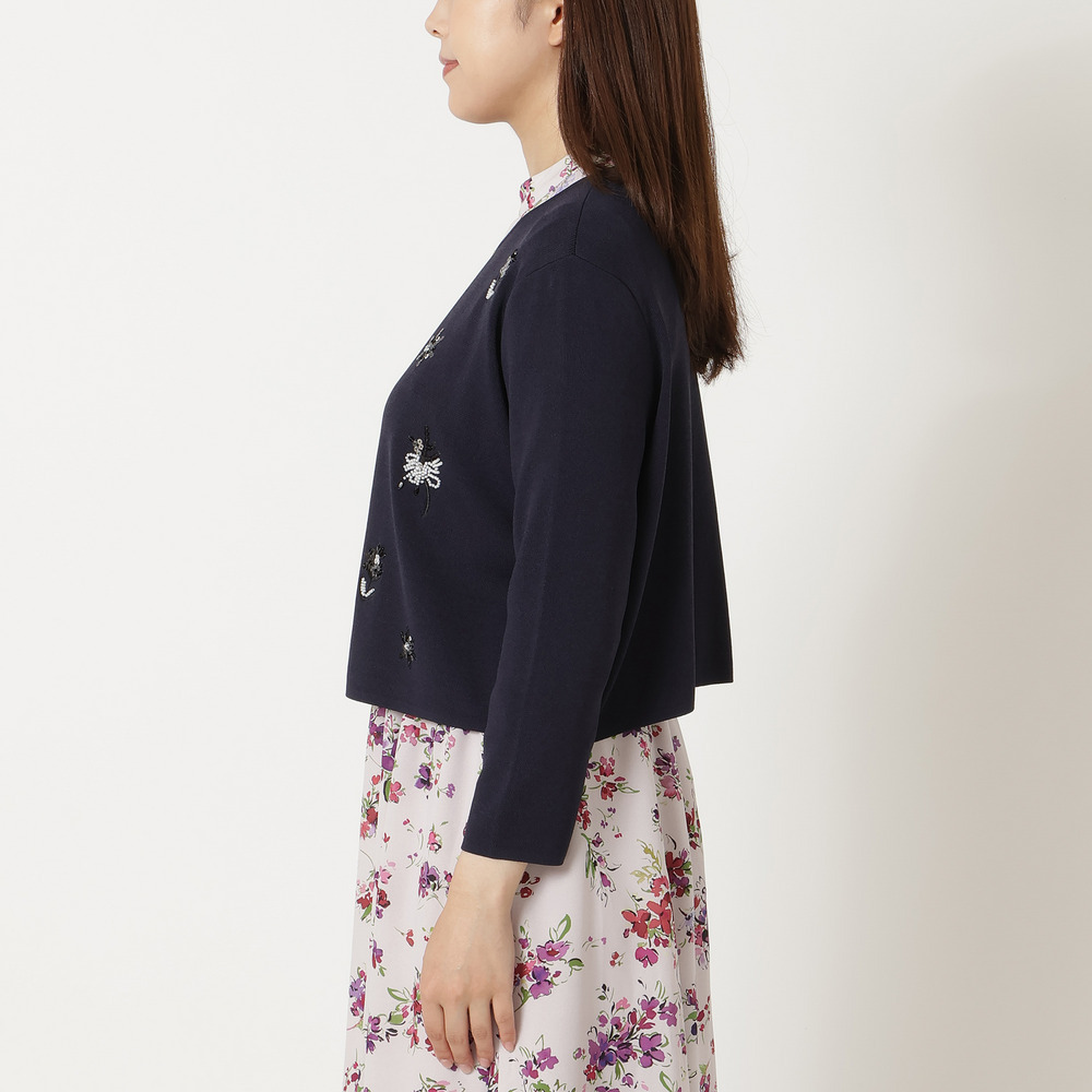 スパンコールやビーズと刺繍であしらったフラワーモチーフを前身ごろ全体にちりばめた上品で華やかなクロップド丈ニットカーディガン。