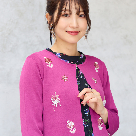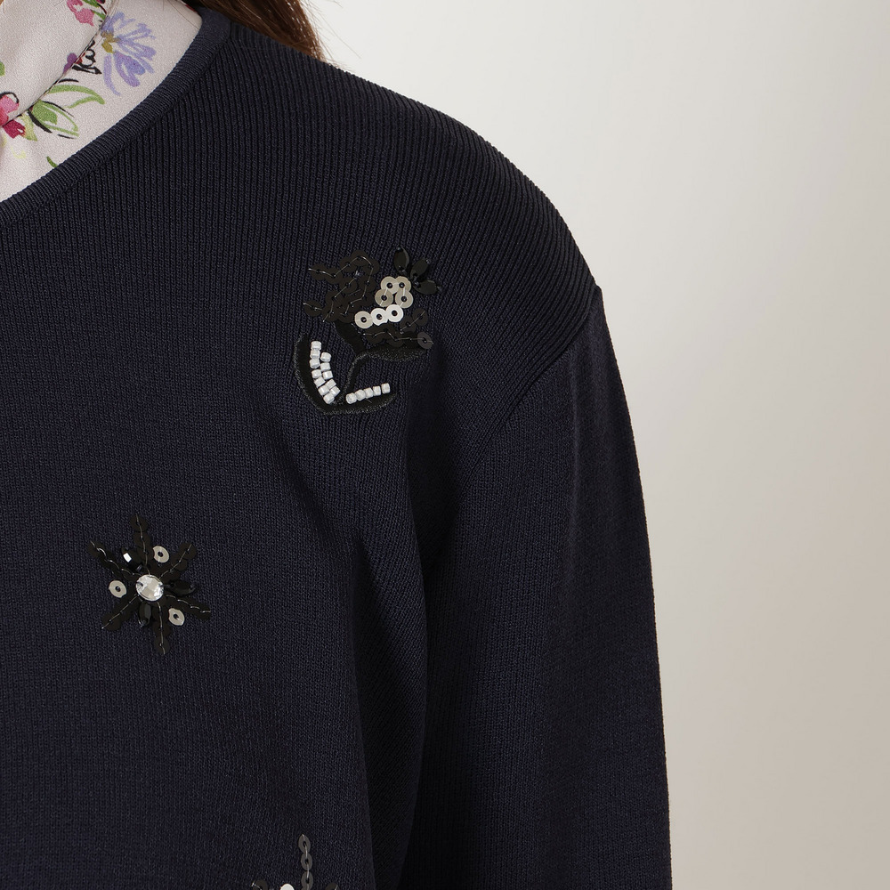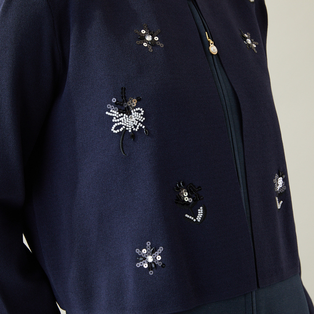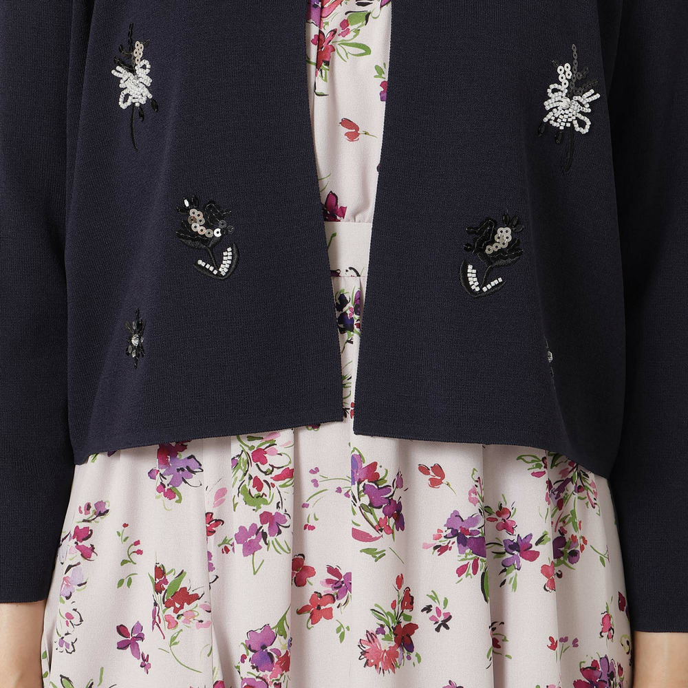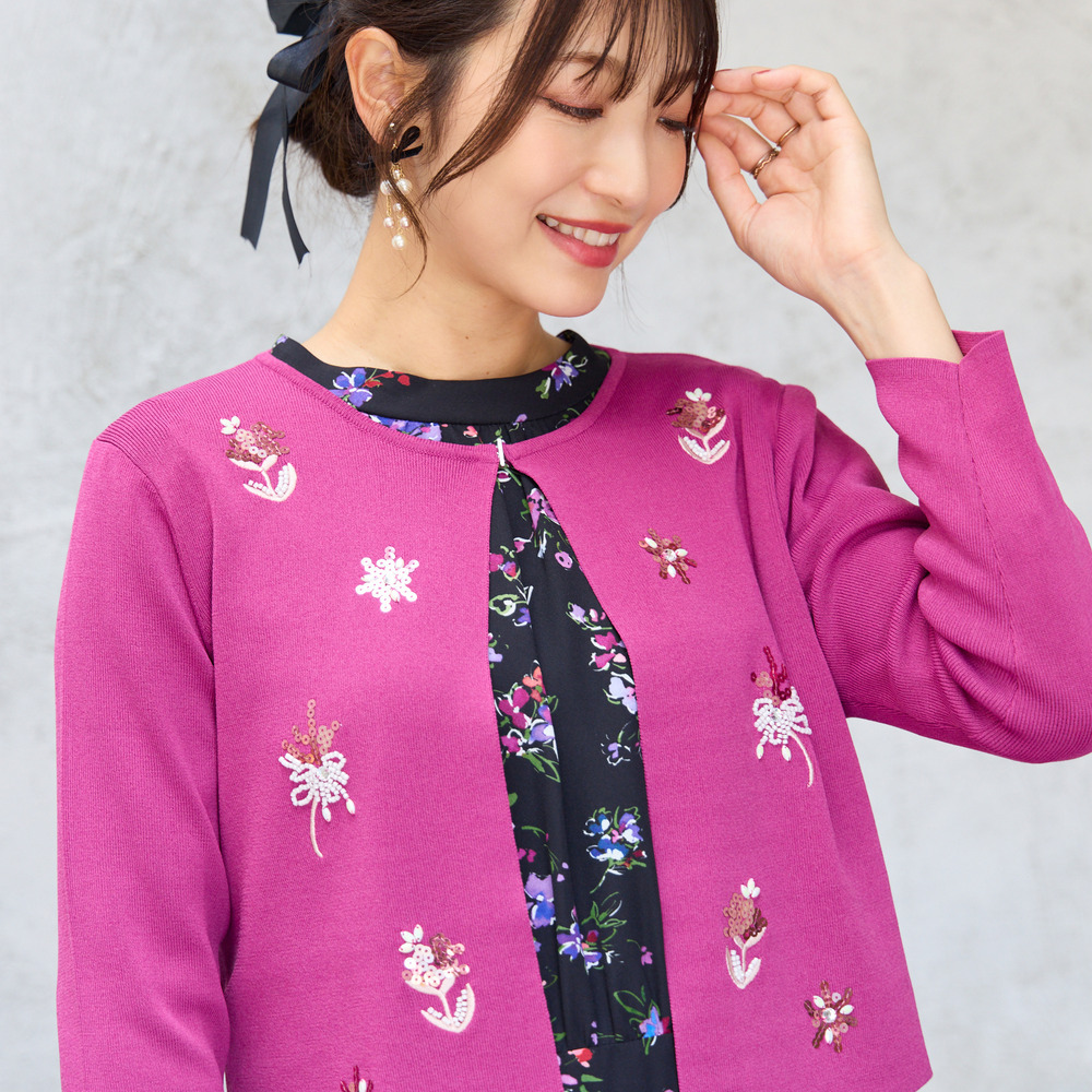 スパンコールやビーズと刺繍であしらったフラワーモチーフを前身ごろ全体にちりばめた上品で華やかなクロップド丈ニットカーディガン。