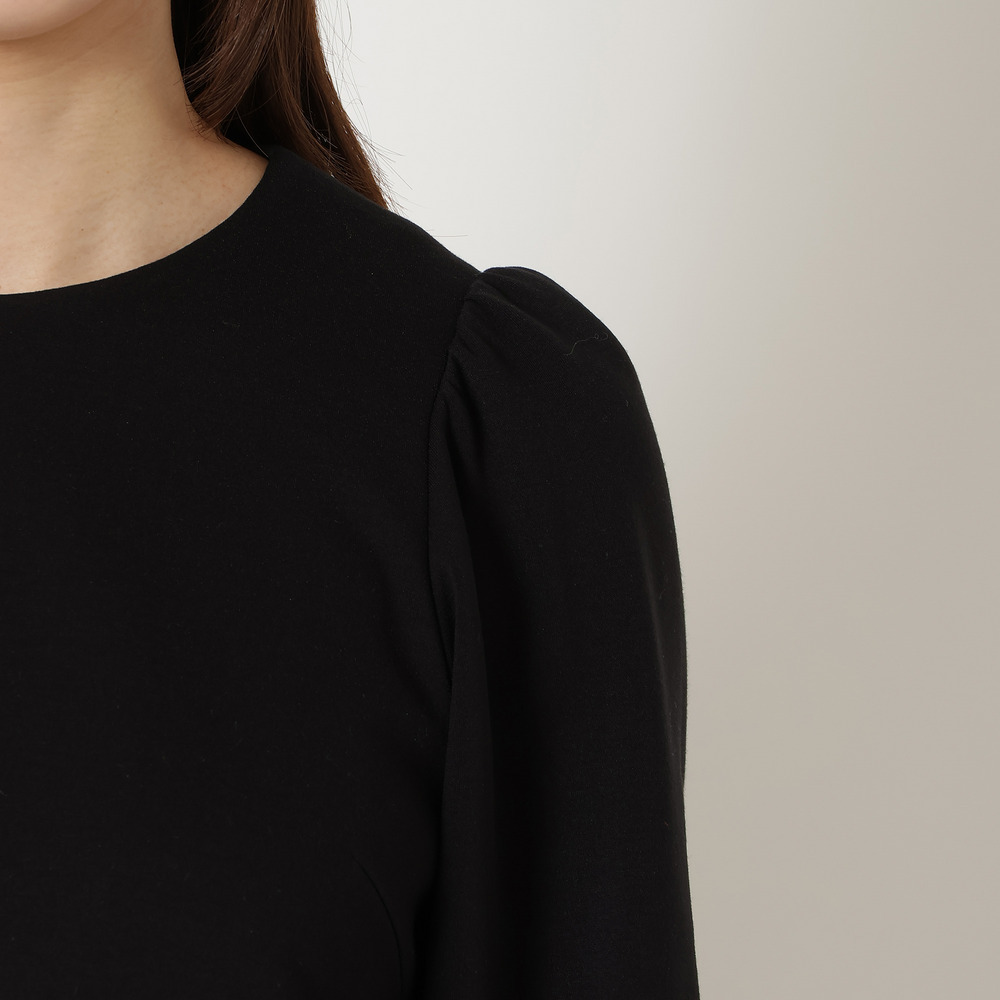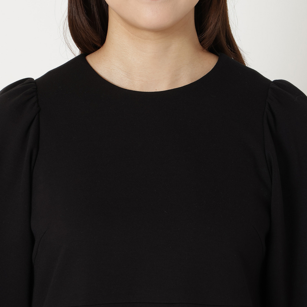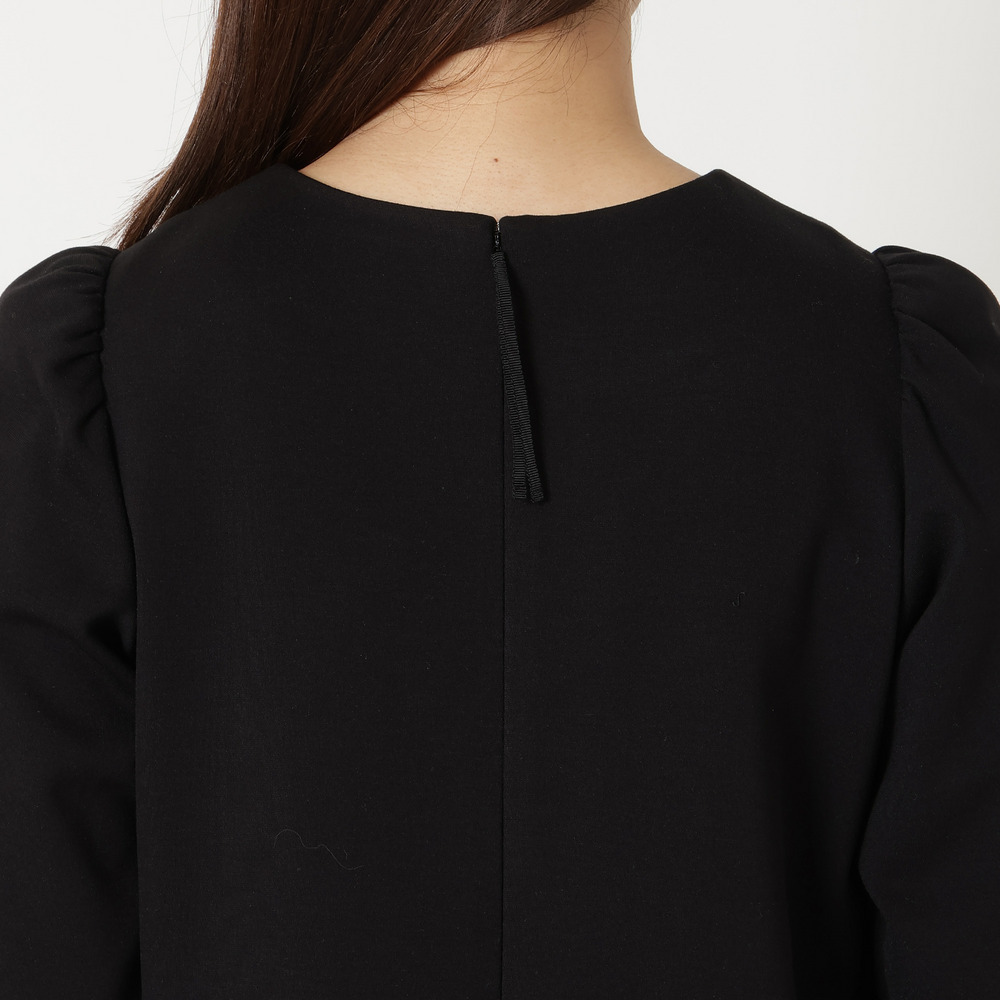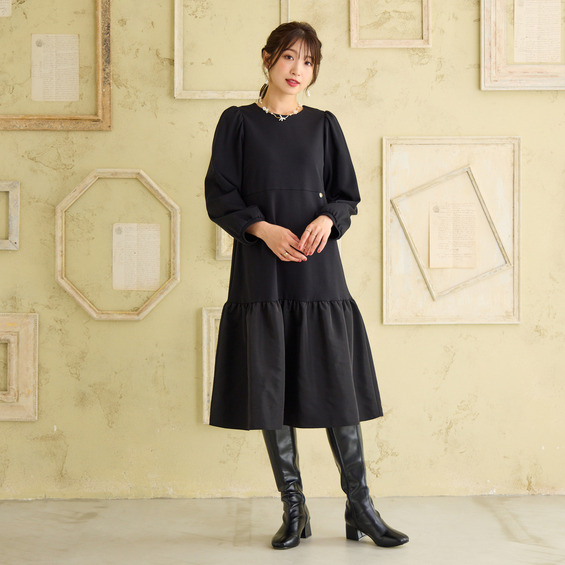 ・シンプルなブラックでふんわりとしたパフスリーブとティアード切替えがフェミニンなワンピース