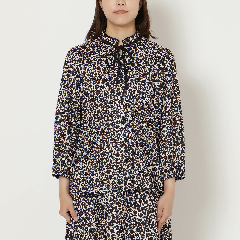・首元のタック襟とリボンが華やかな印象に