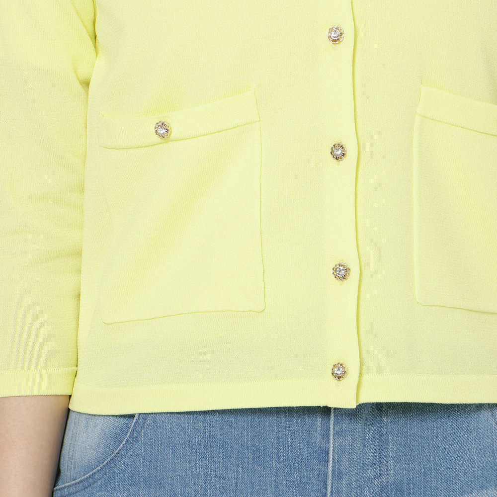 ・小さな花の形のボタンと両サイドのポケットが、さりげなく華やかさを添えるポイント