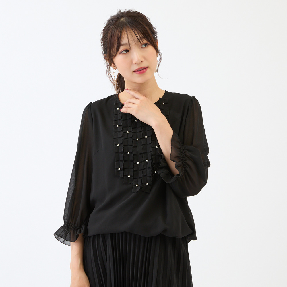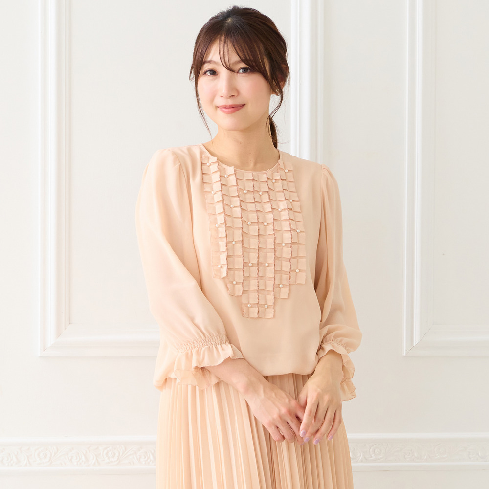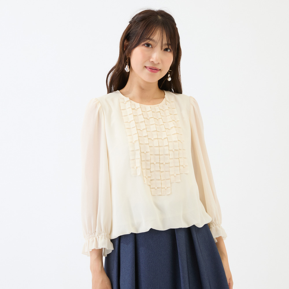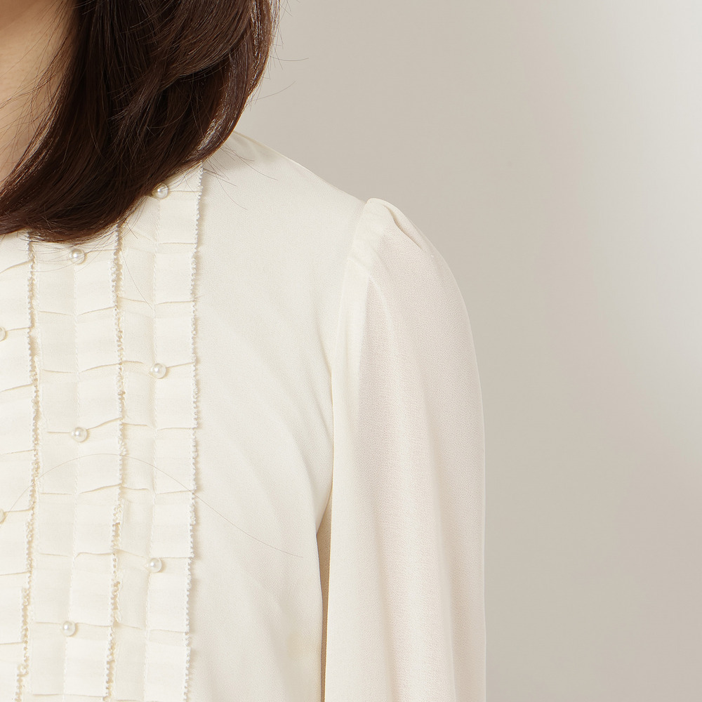 ・軽やかな透け感にタックプリーツとパールビーズの甘いディティールがおとな可愛い印象