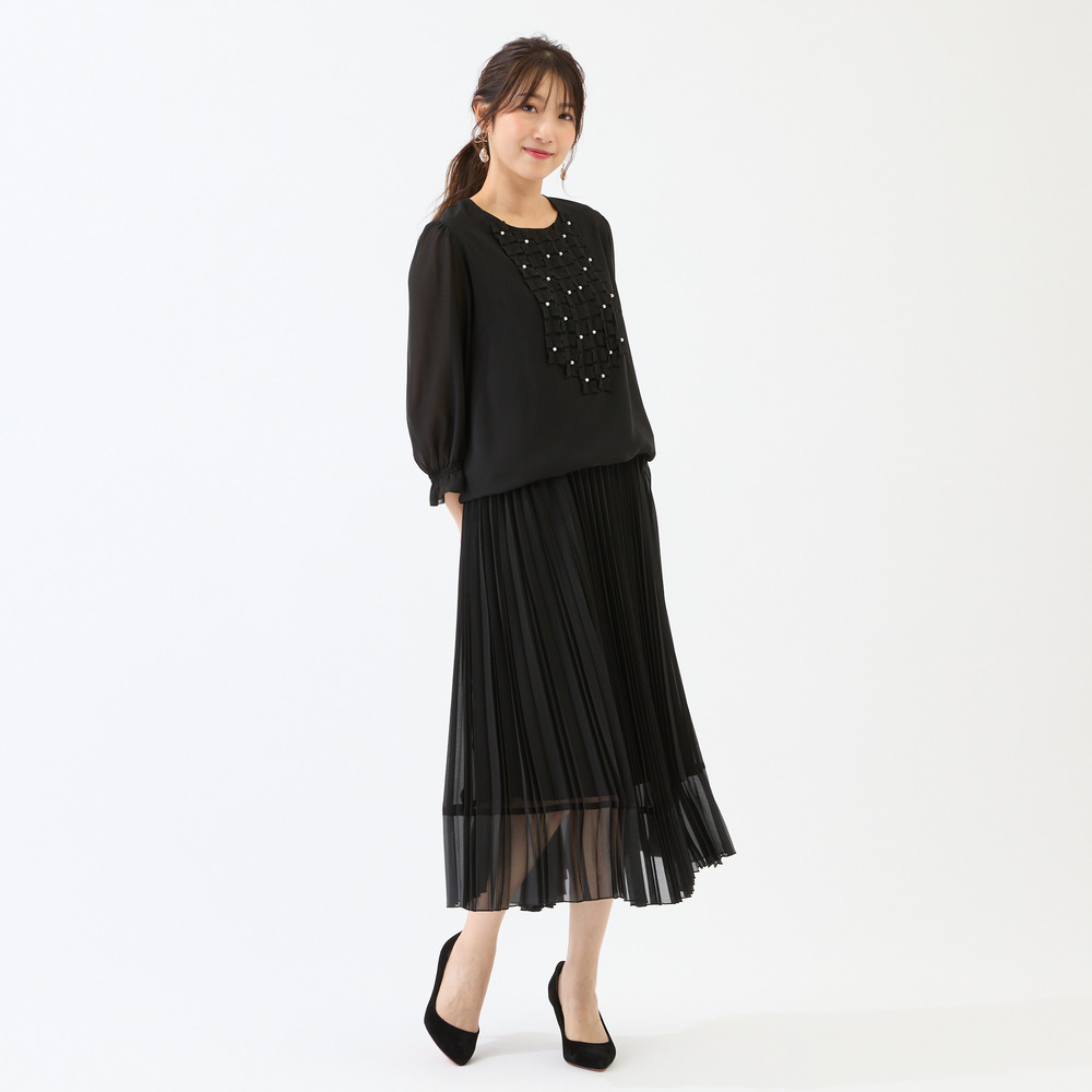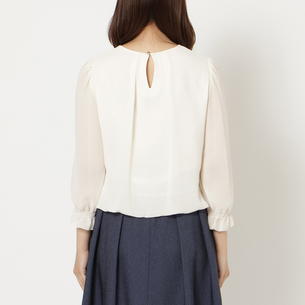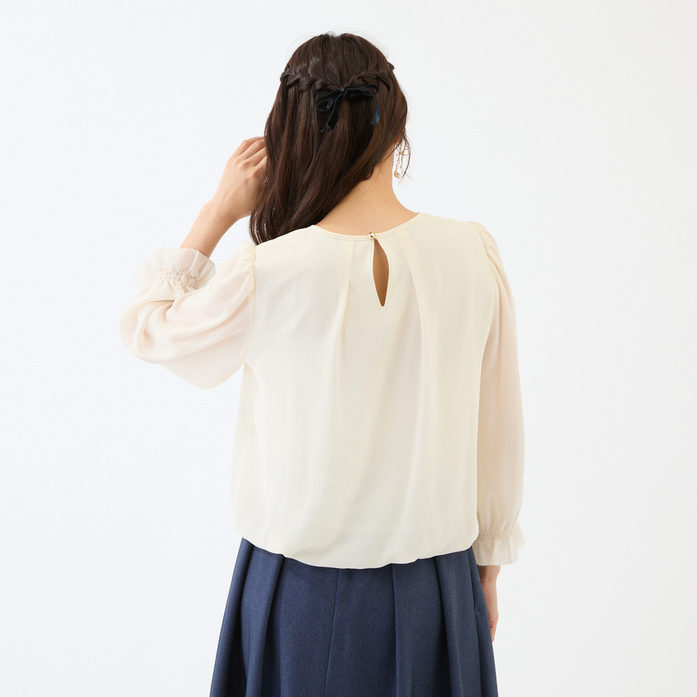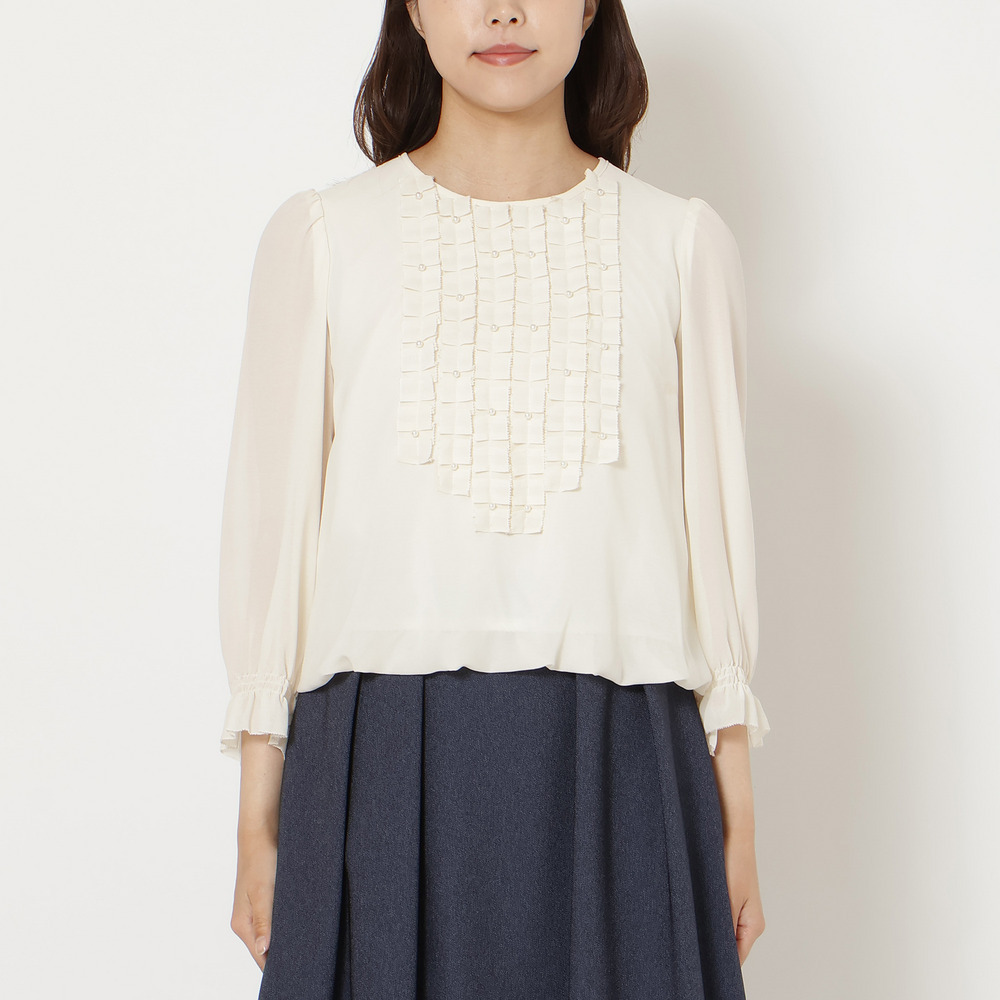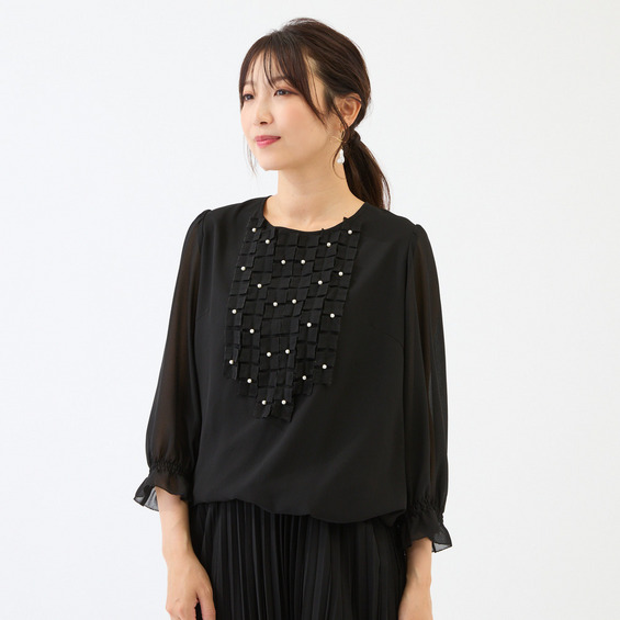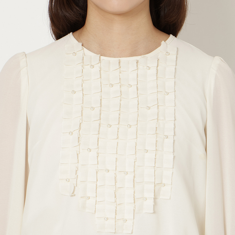 ・軽やかな透け感にタックプリーツとパールビーズの甘いディティールがおとな可愛い印象