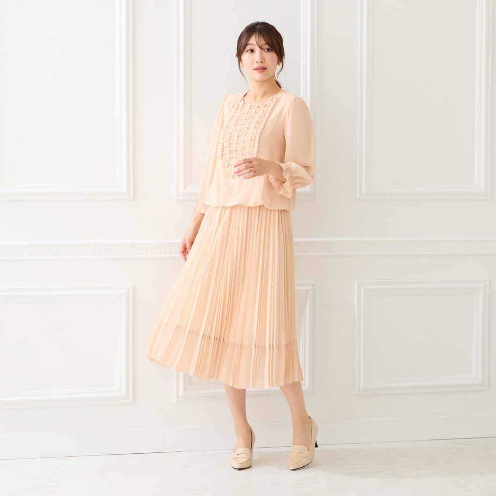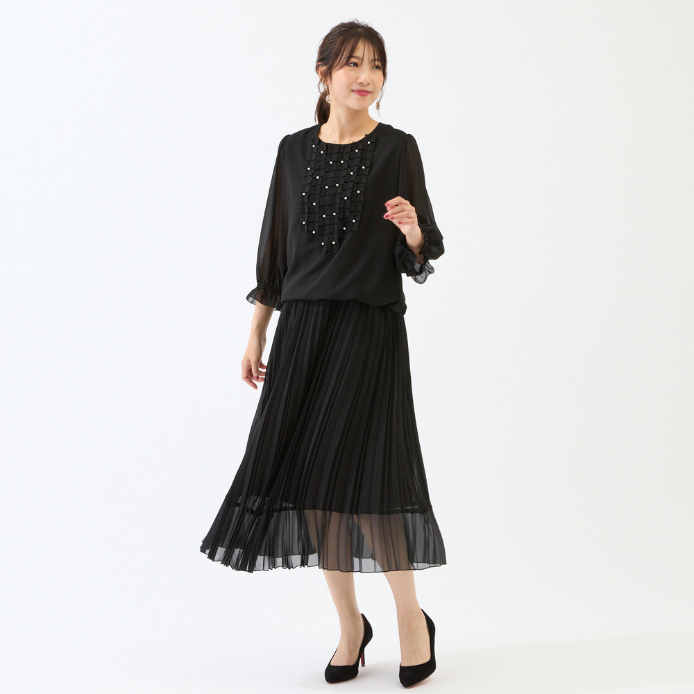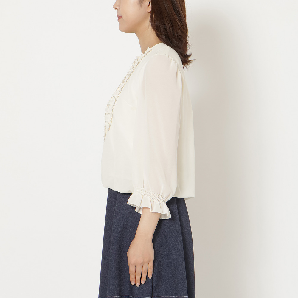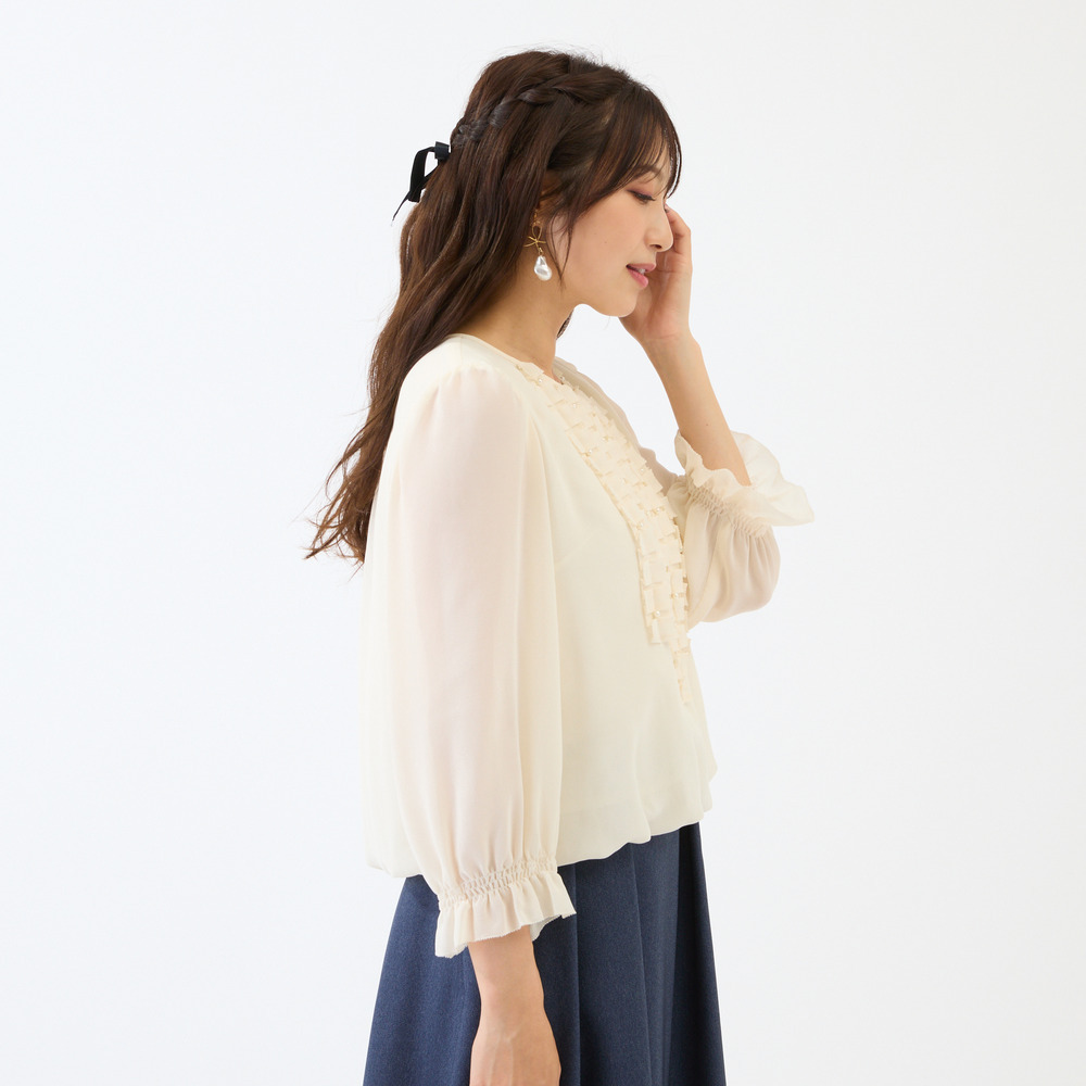 ・軽やかな透け感にタックプリーツとパールビーズの甘いディティールがおとな可愛い印象