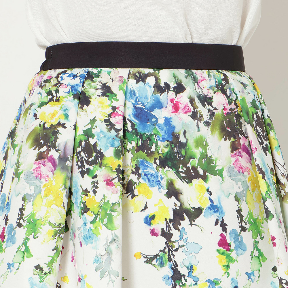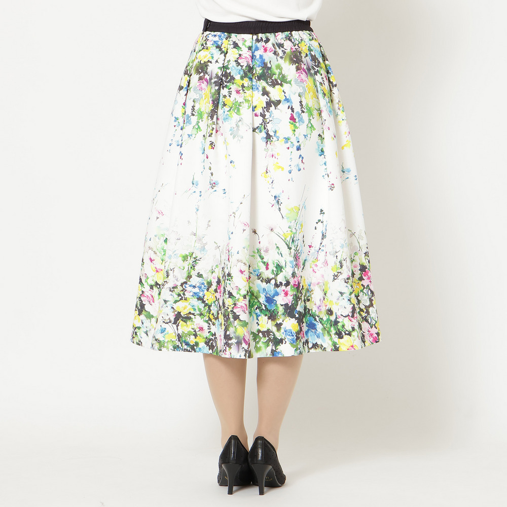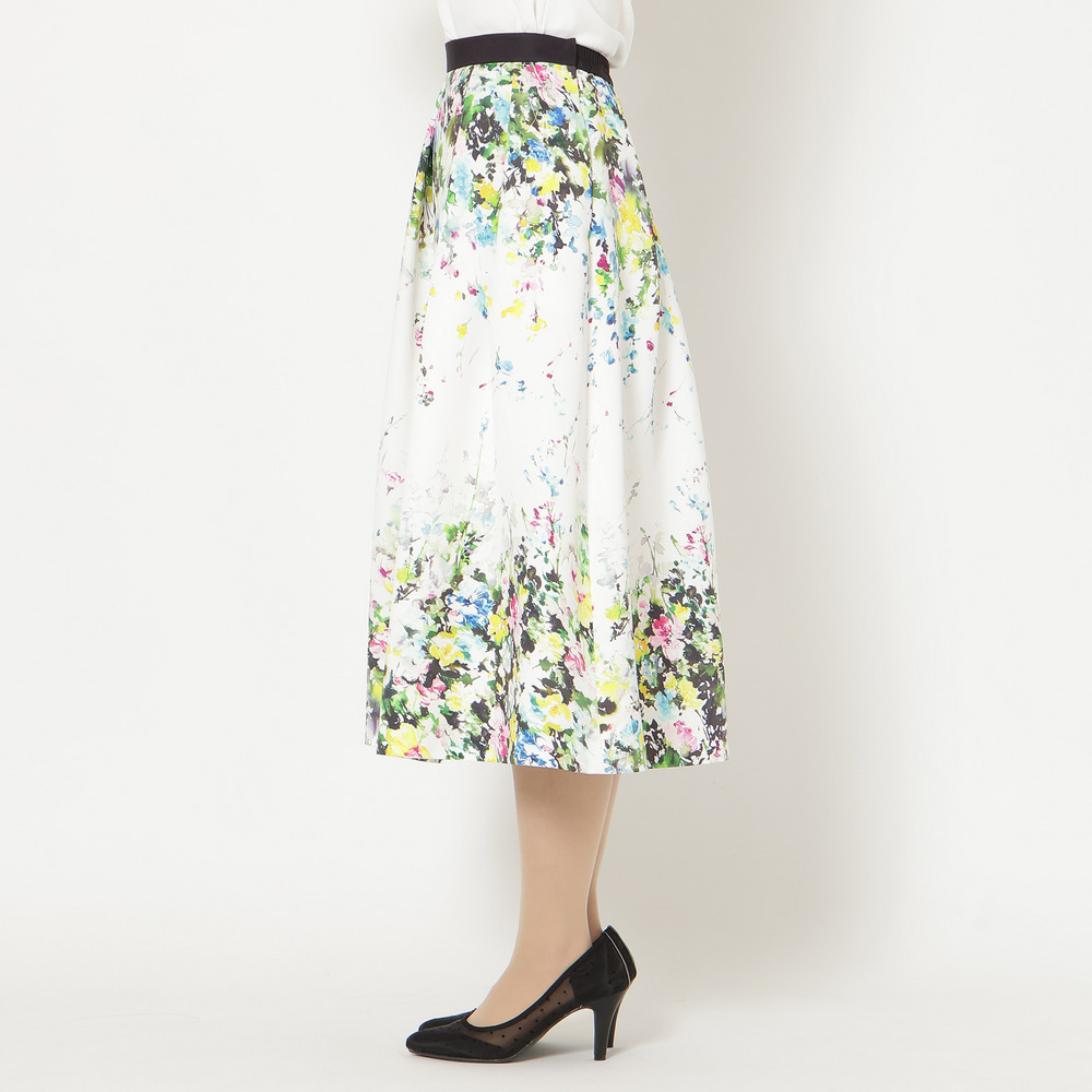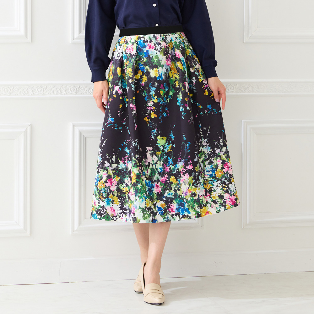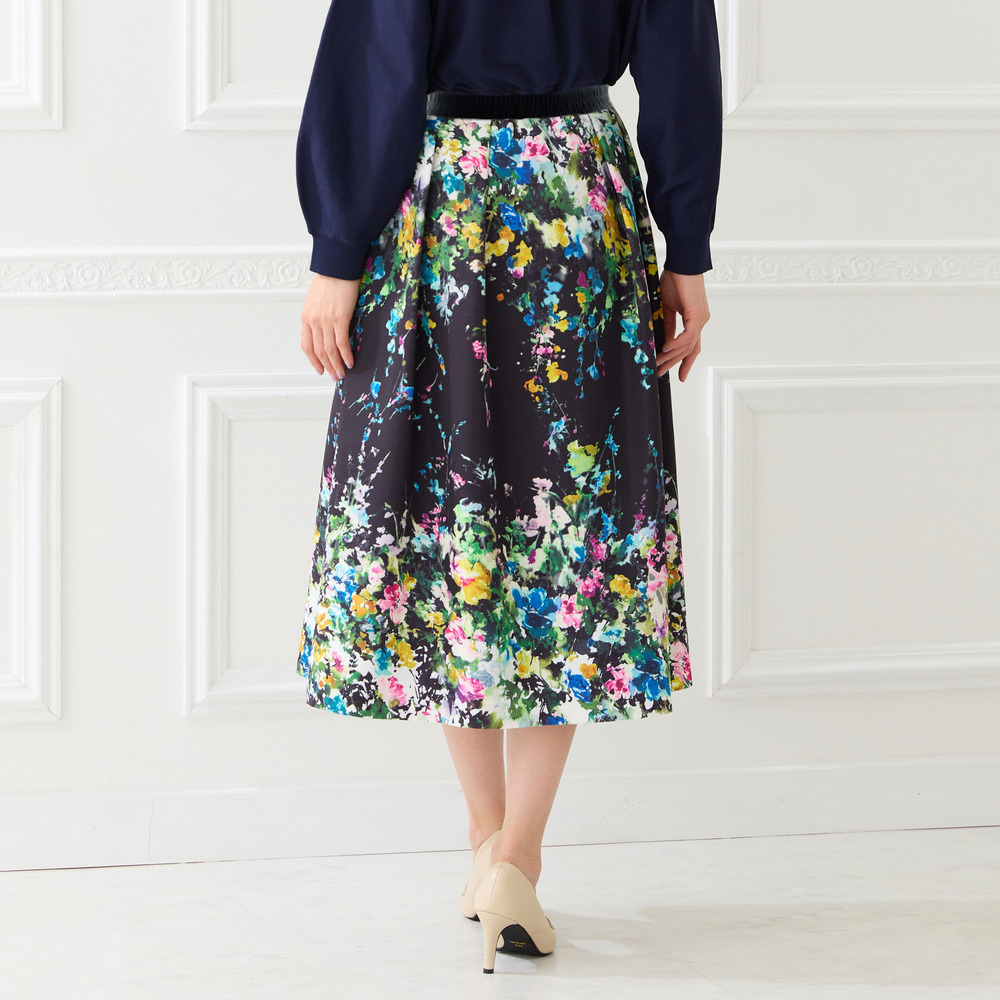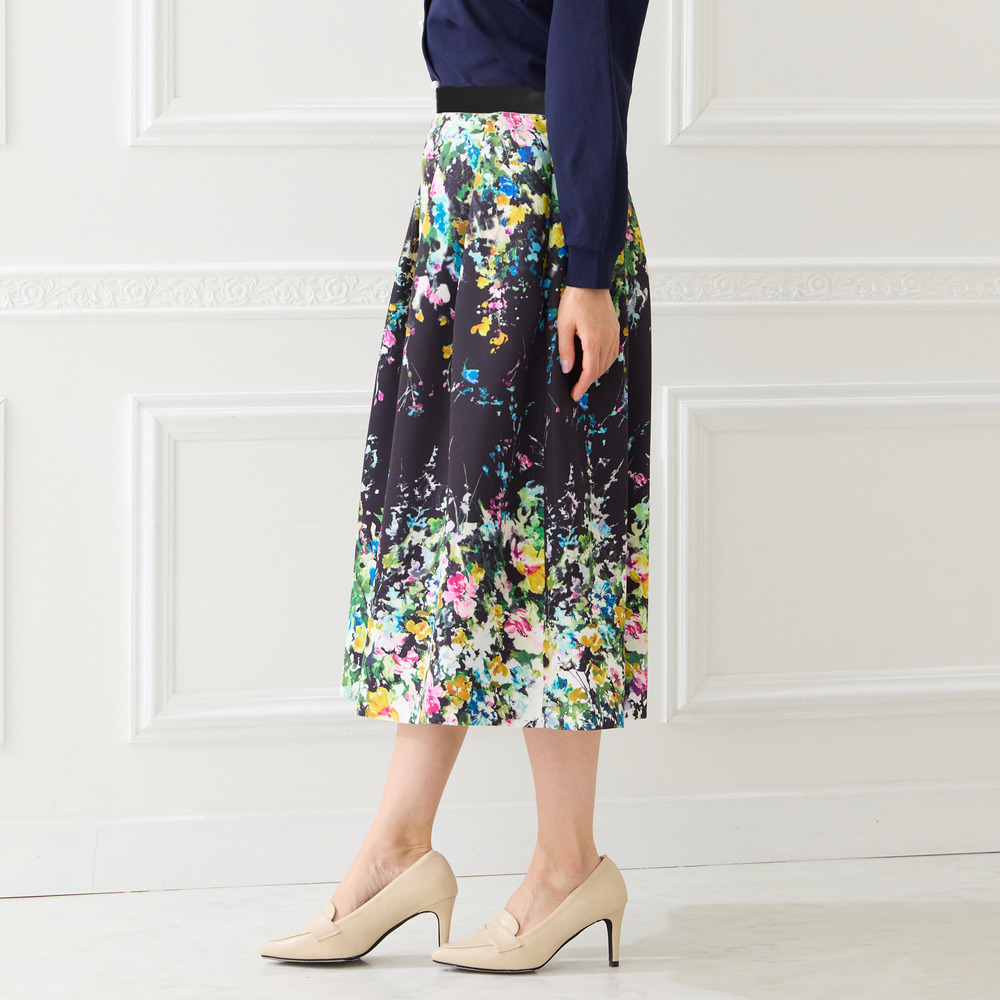 ・まるで絵画のように美しい、水彩タッチのフラワープリントが目を惹くフレアスカート