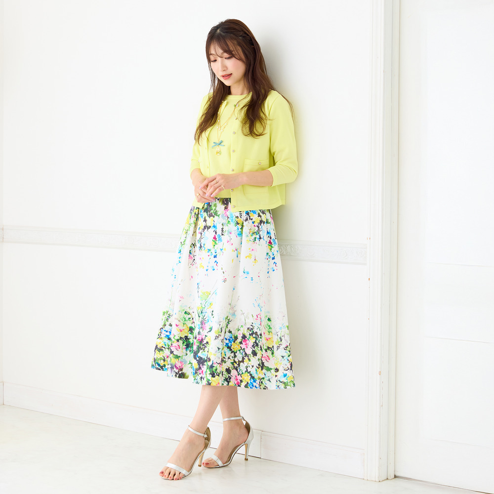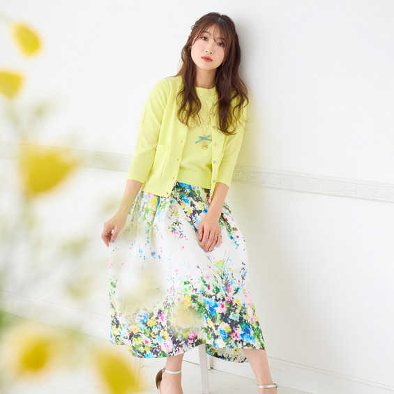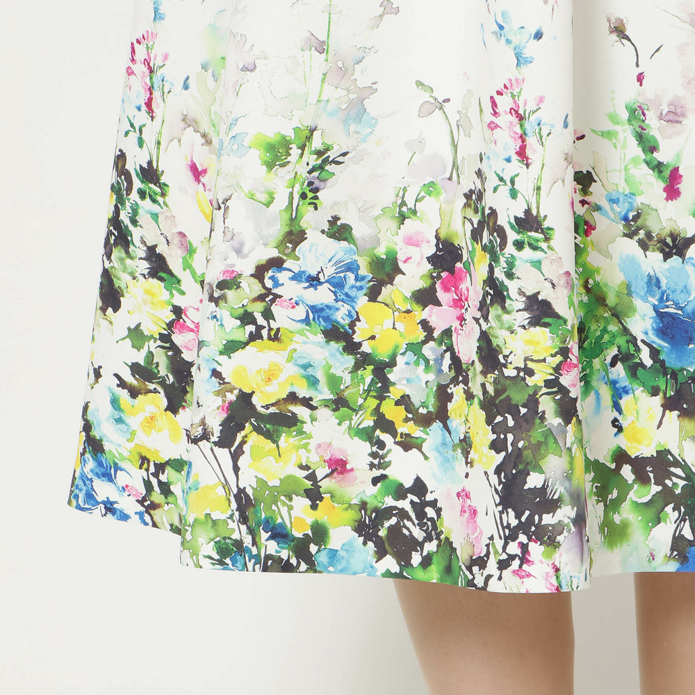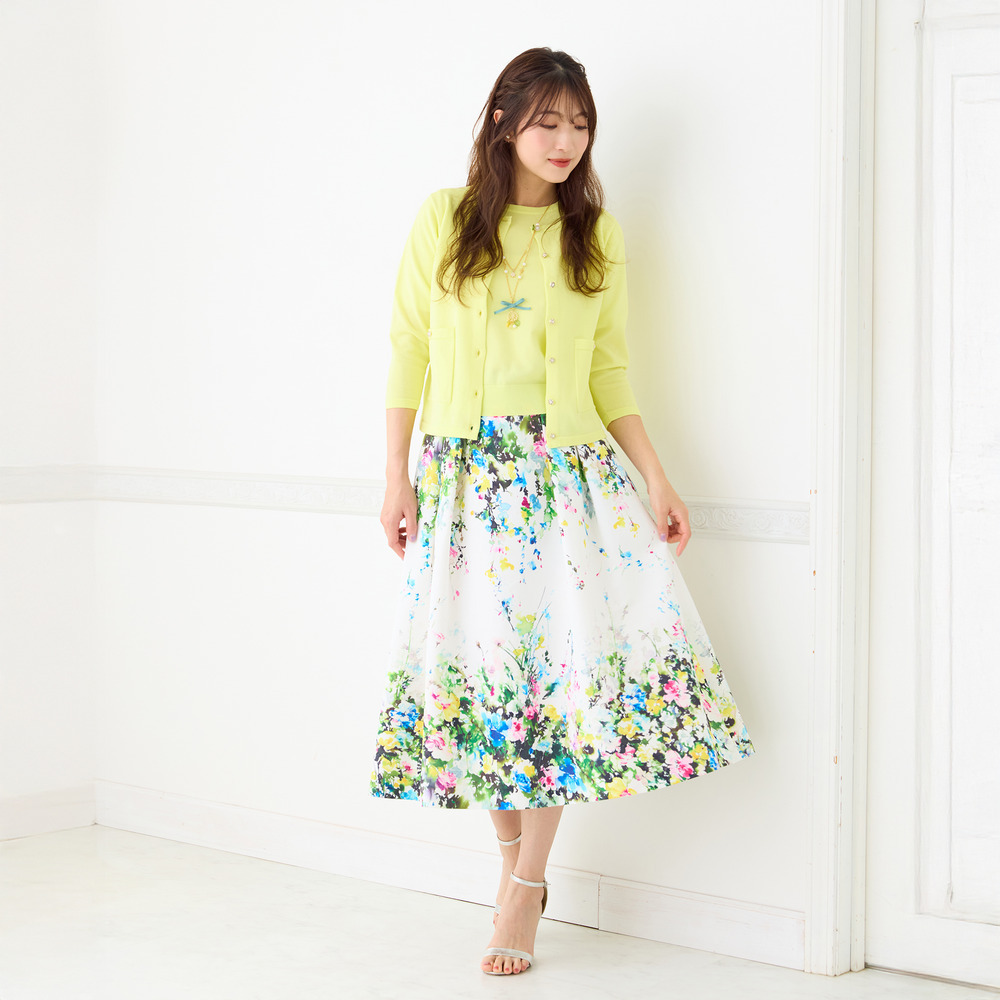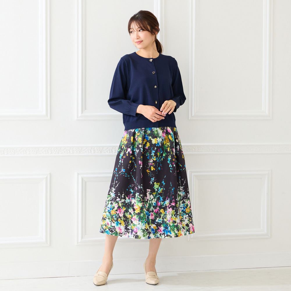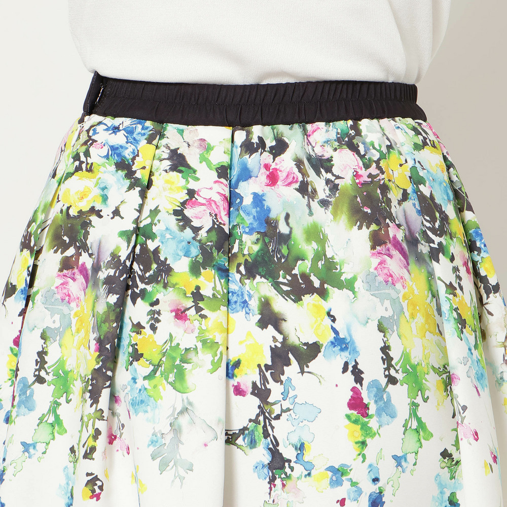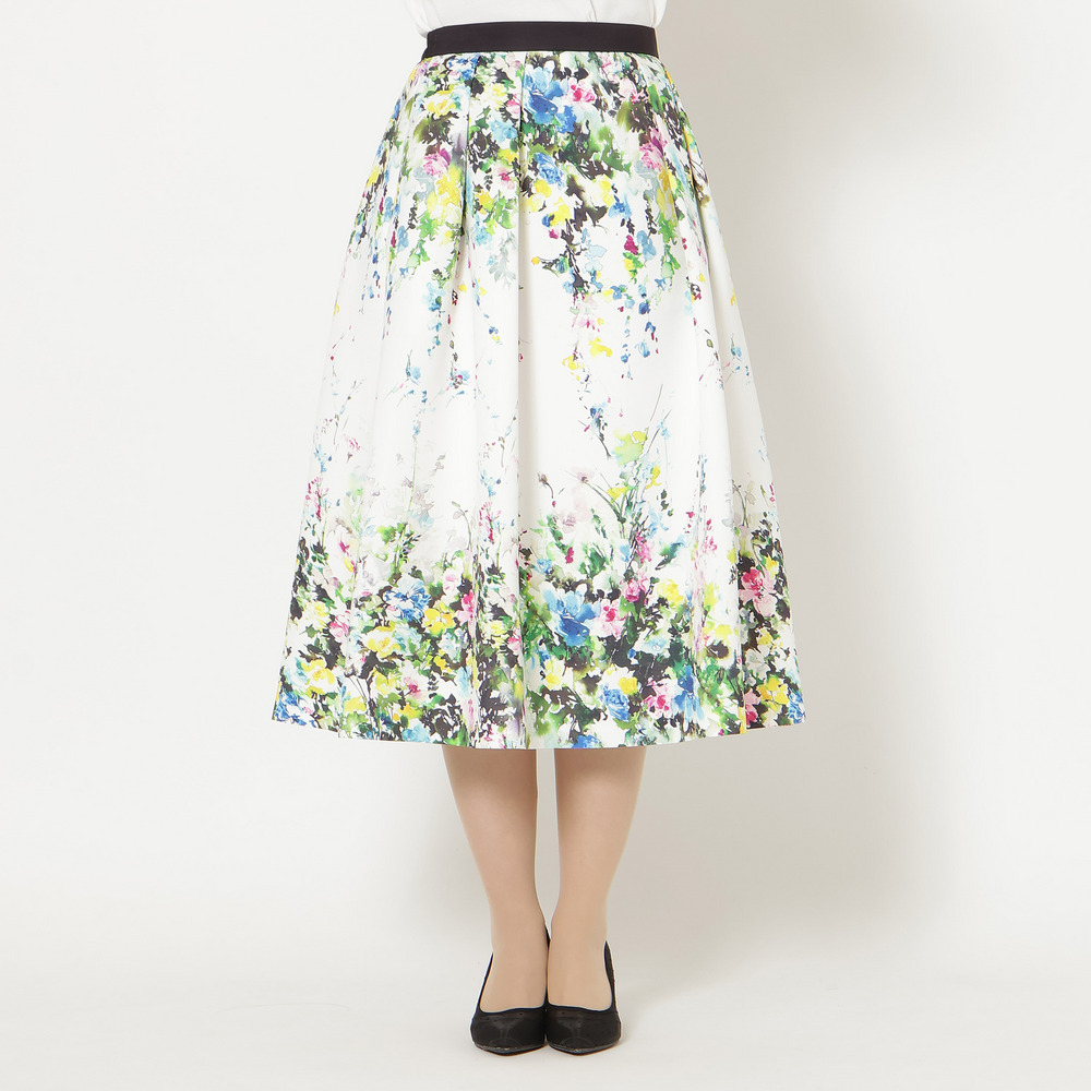 ・まるで絵画のように美しい、水彩タッチのフラワープリントが目を惹くフレアスカート