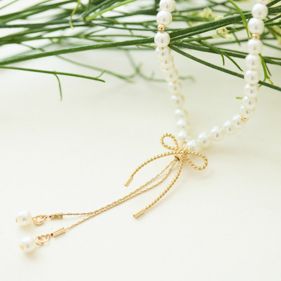 上品なパール調ビーズと小さなリボンがシンプルなネックレス。