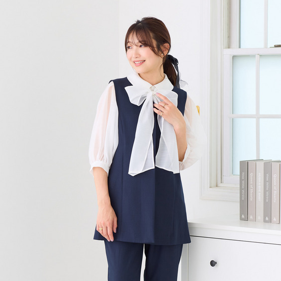 ・すっきりとしたクルーネックデザインに後ろリボンがシックな印象に