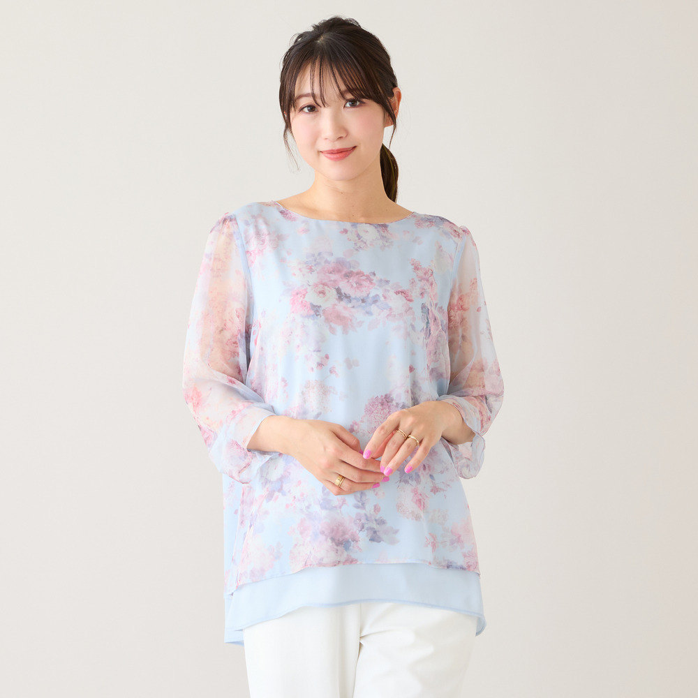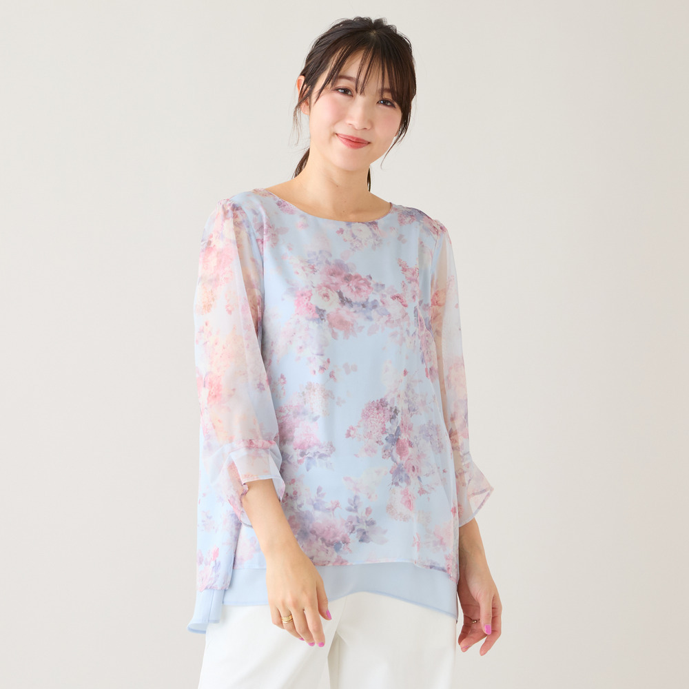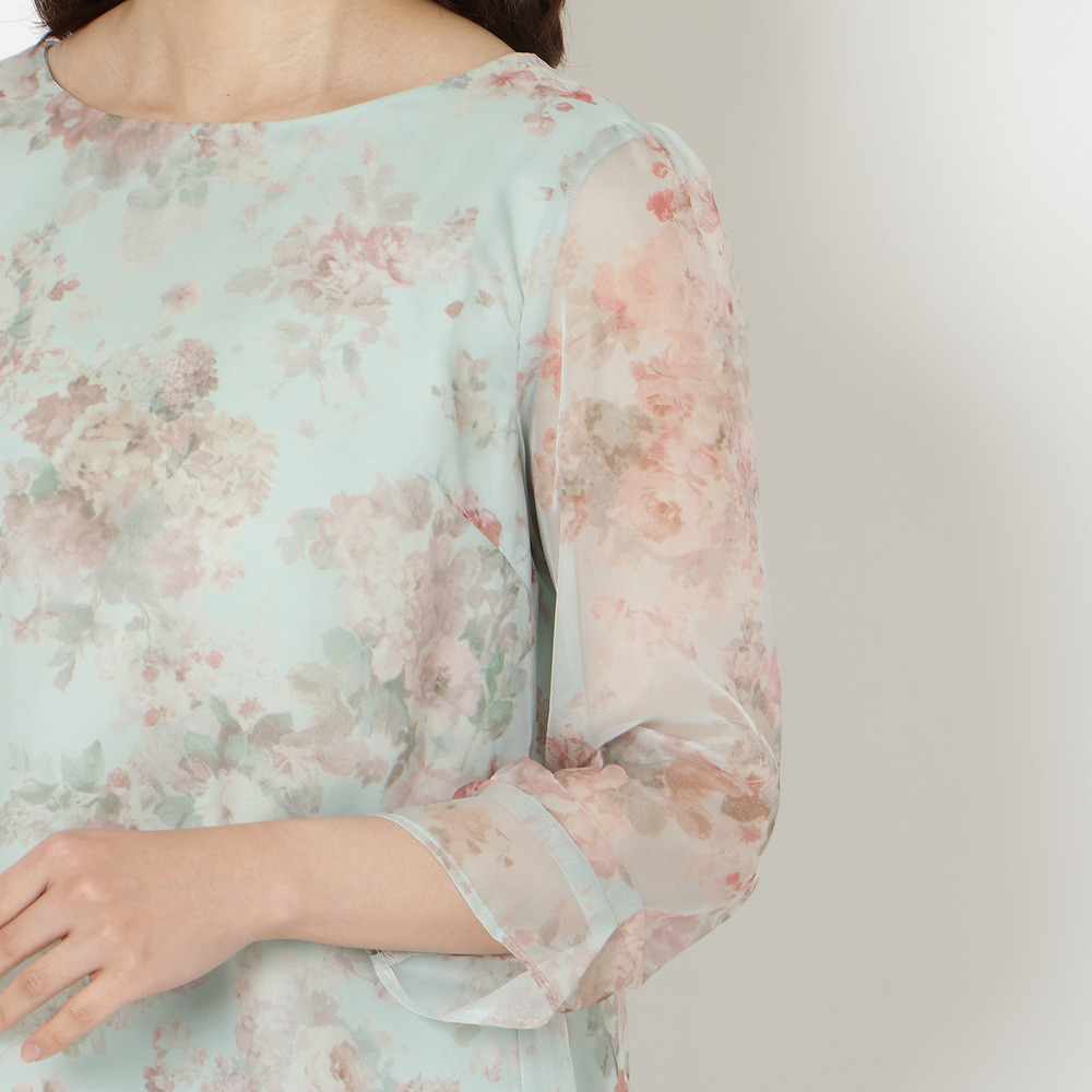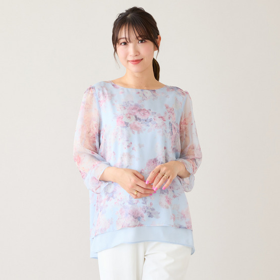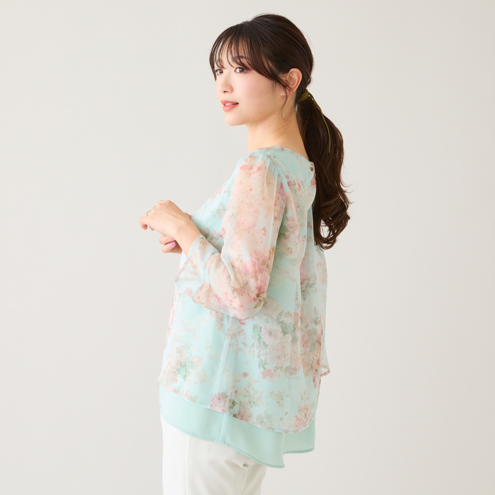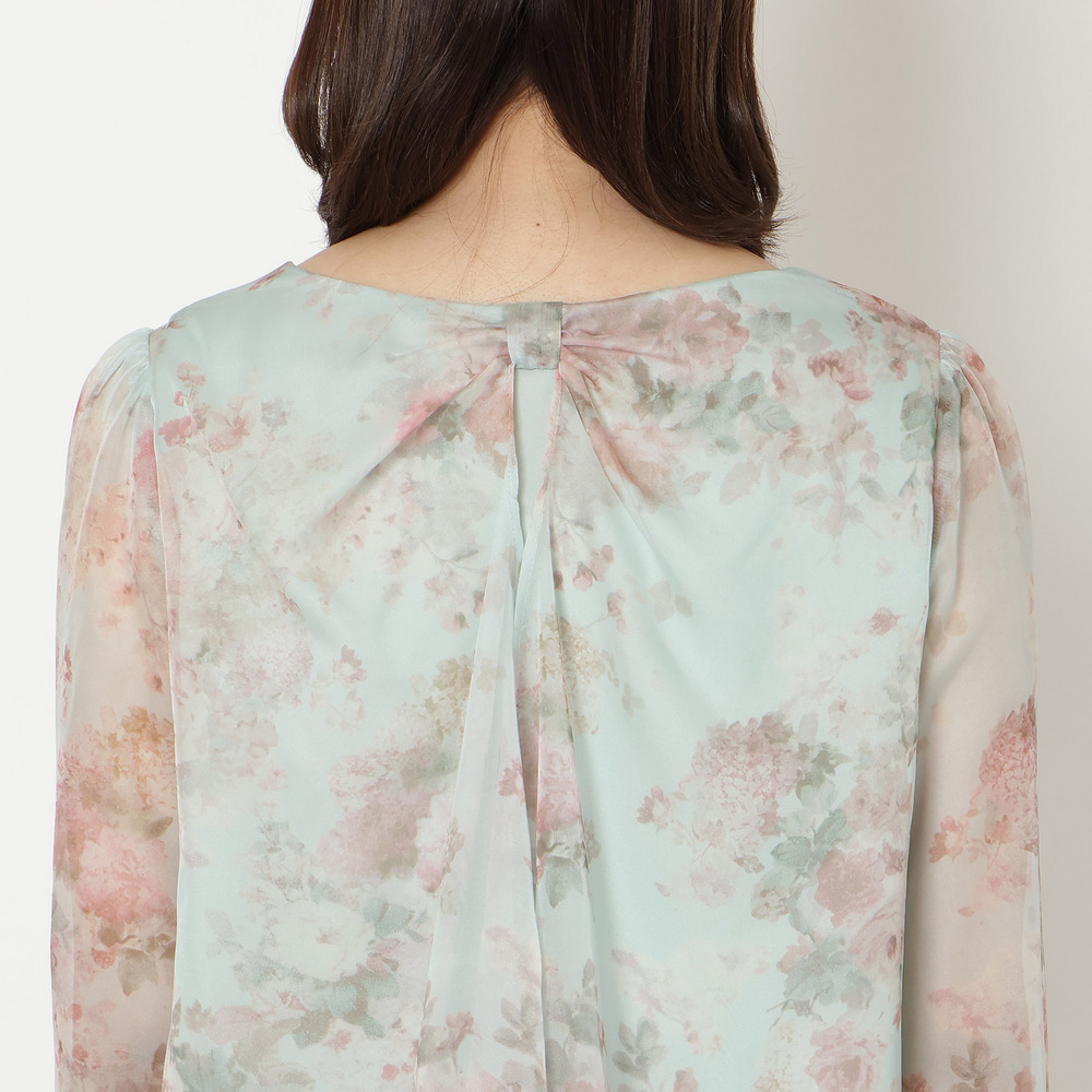 ・プリントにシフォンを重ねた軽やかな素材感が、動くたびにふんわりと優しい印象に