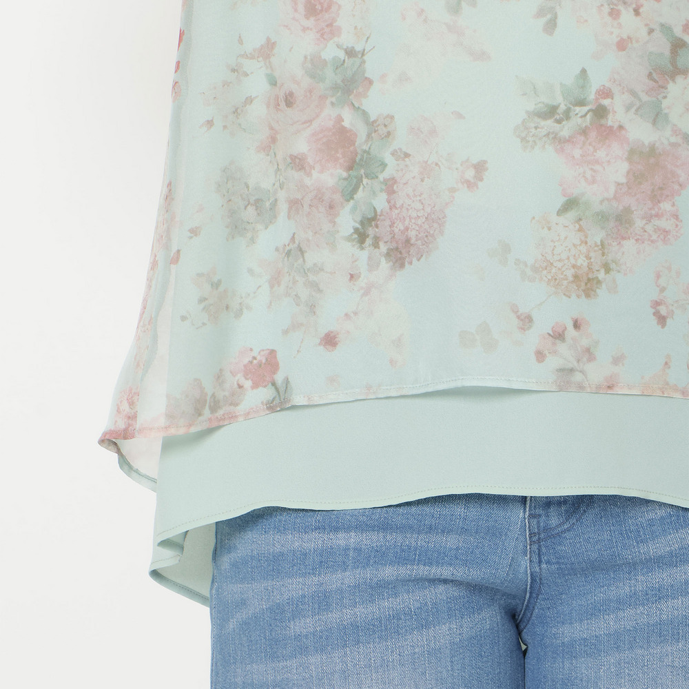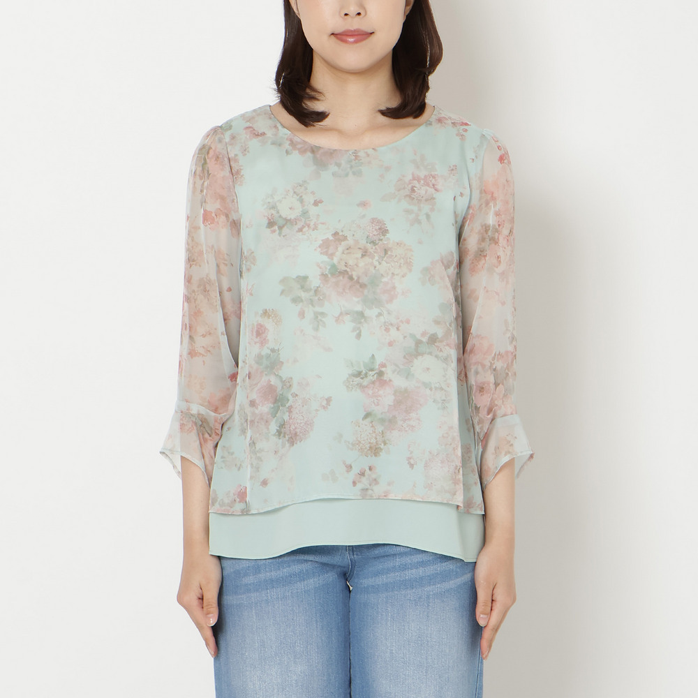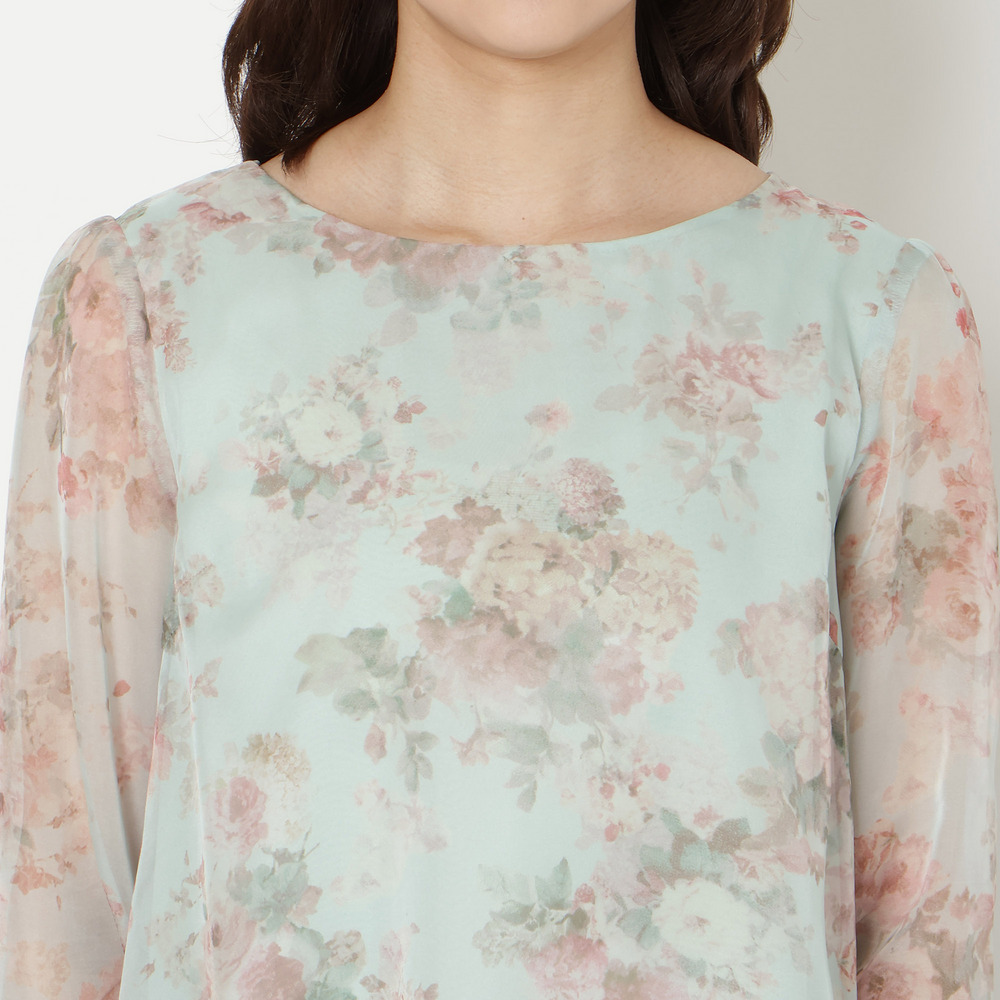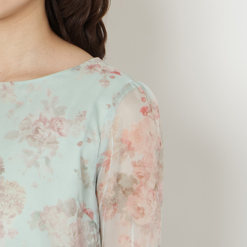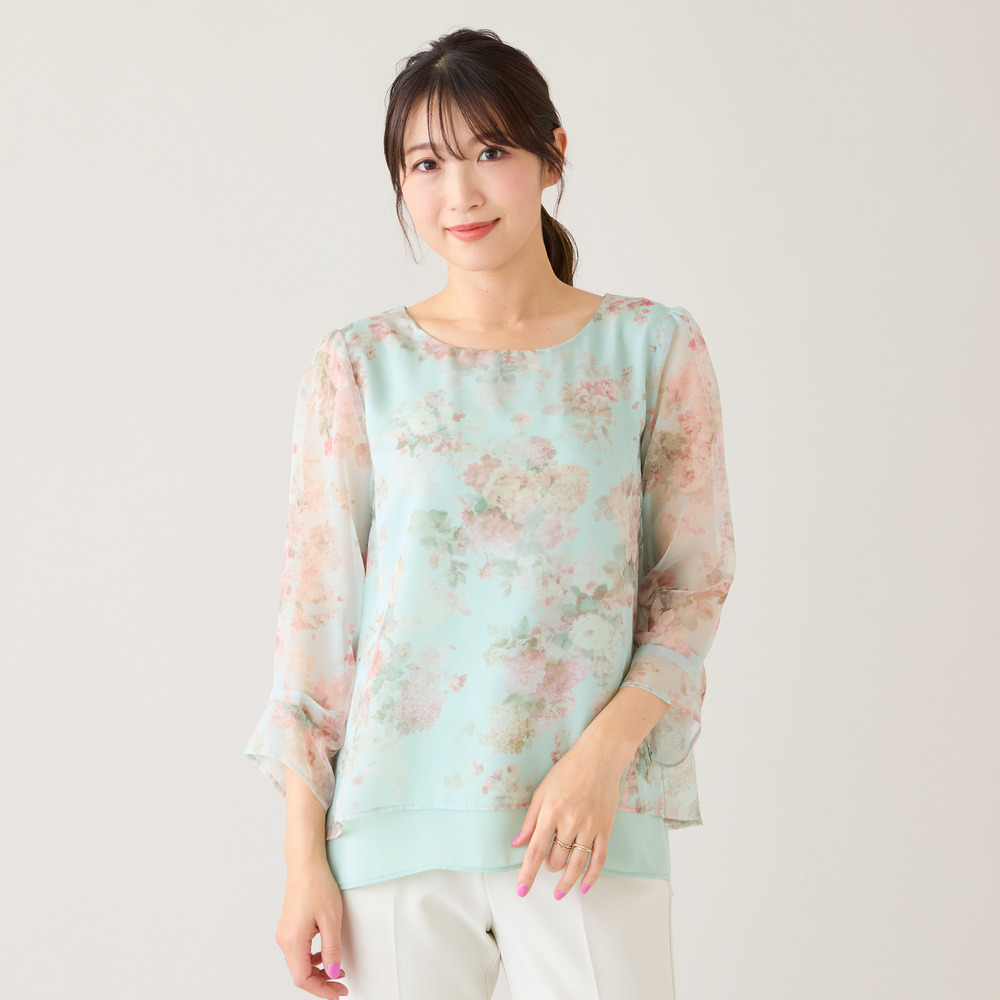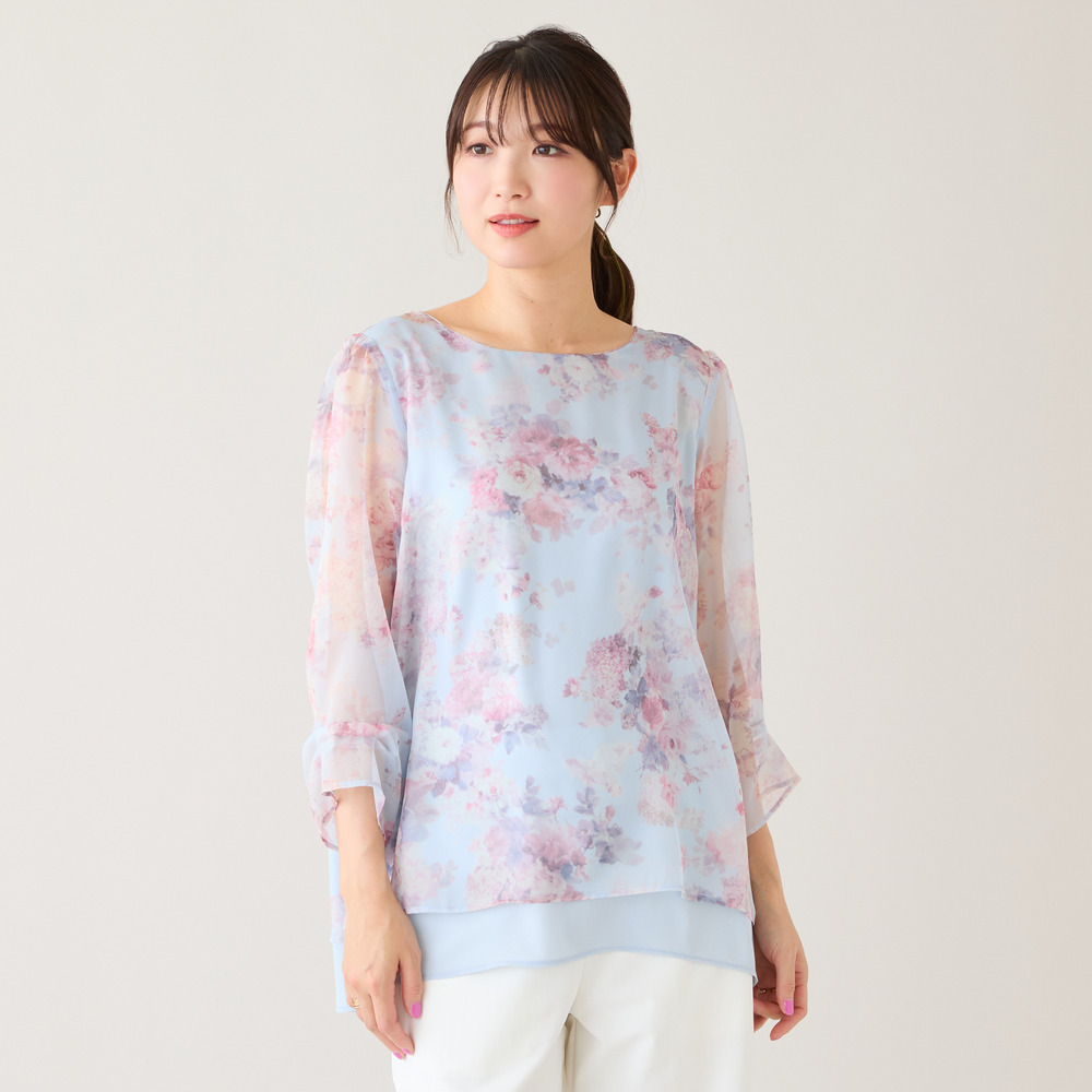 ・プリントにシフォンを重ねた軽やかな素材感が、動くたびにふんわりと優しい印象に