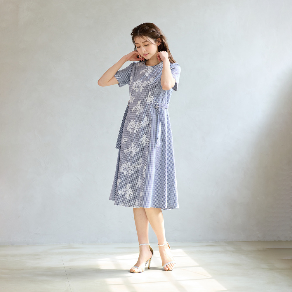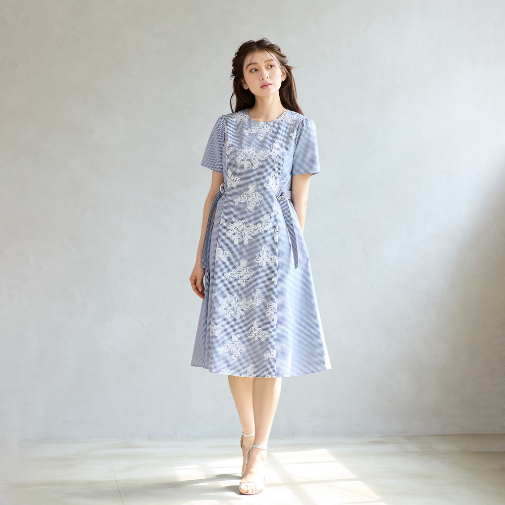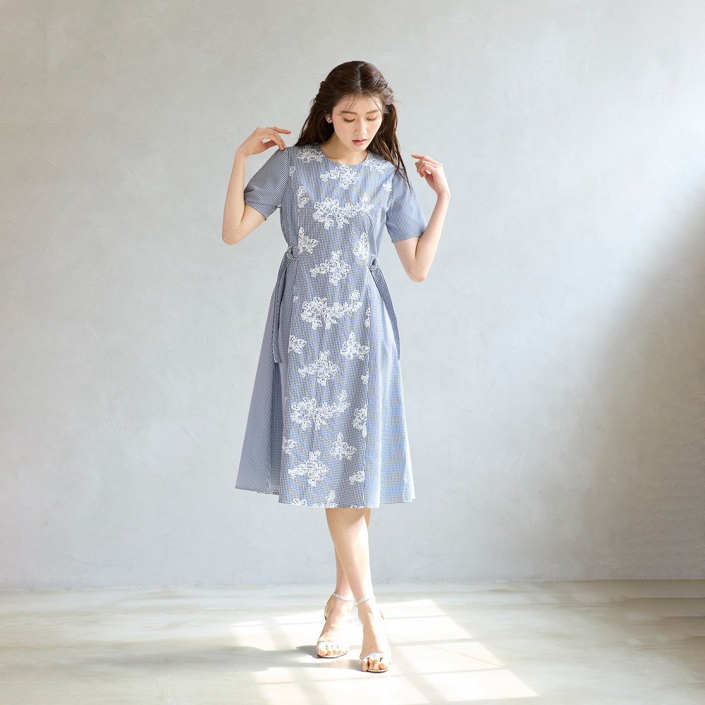 ・ウエストにはリボンベルトを配し、すっきりとしたシルエットを演出