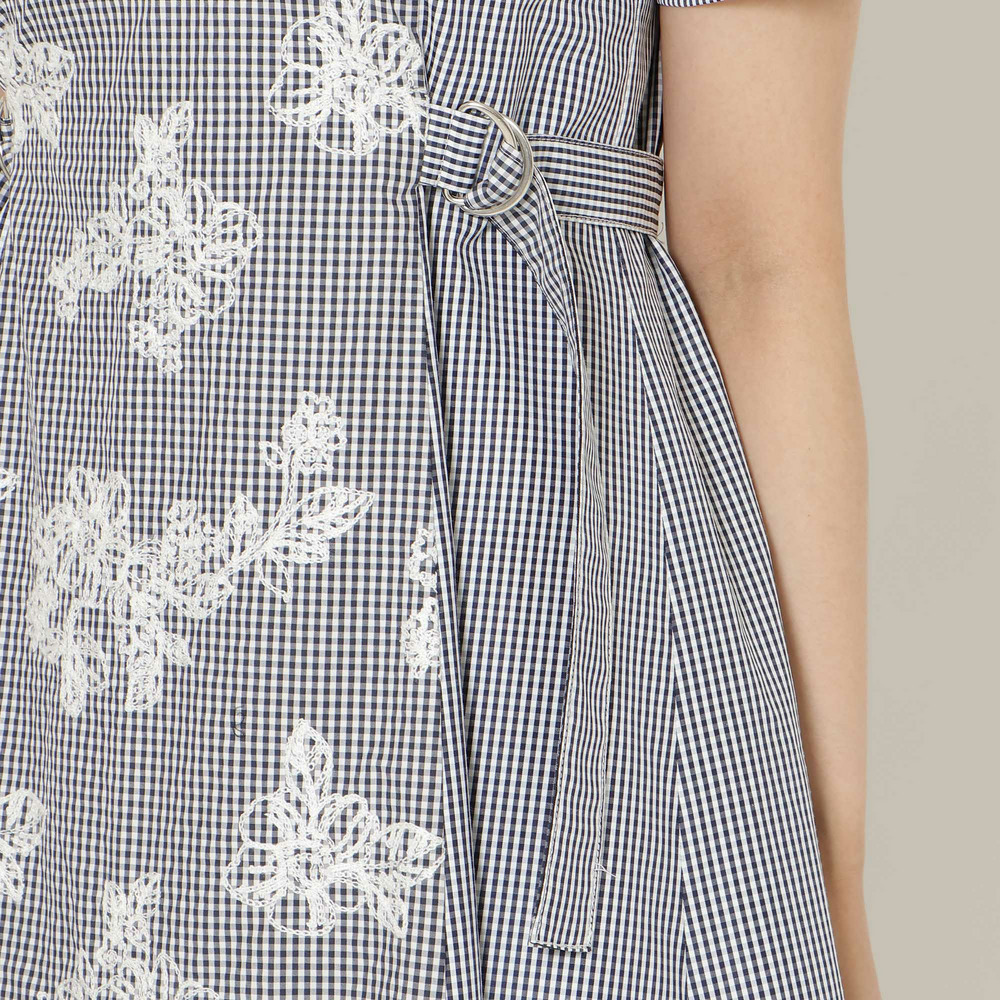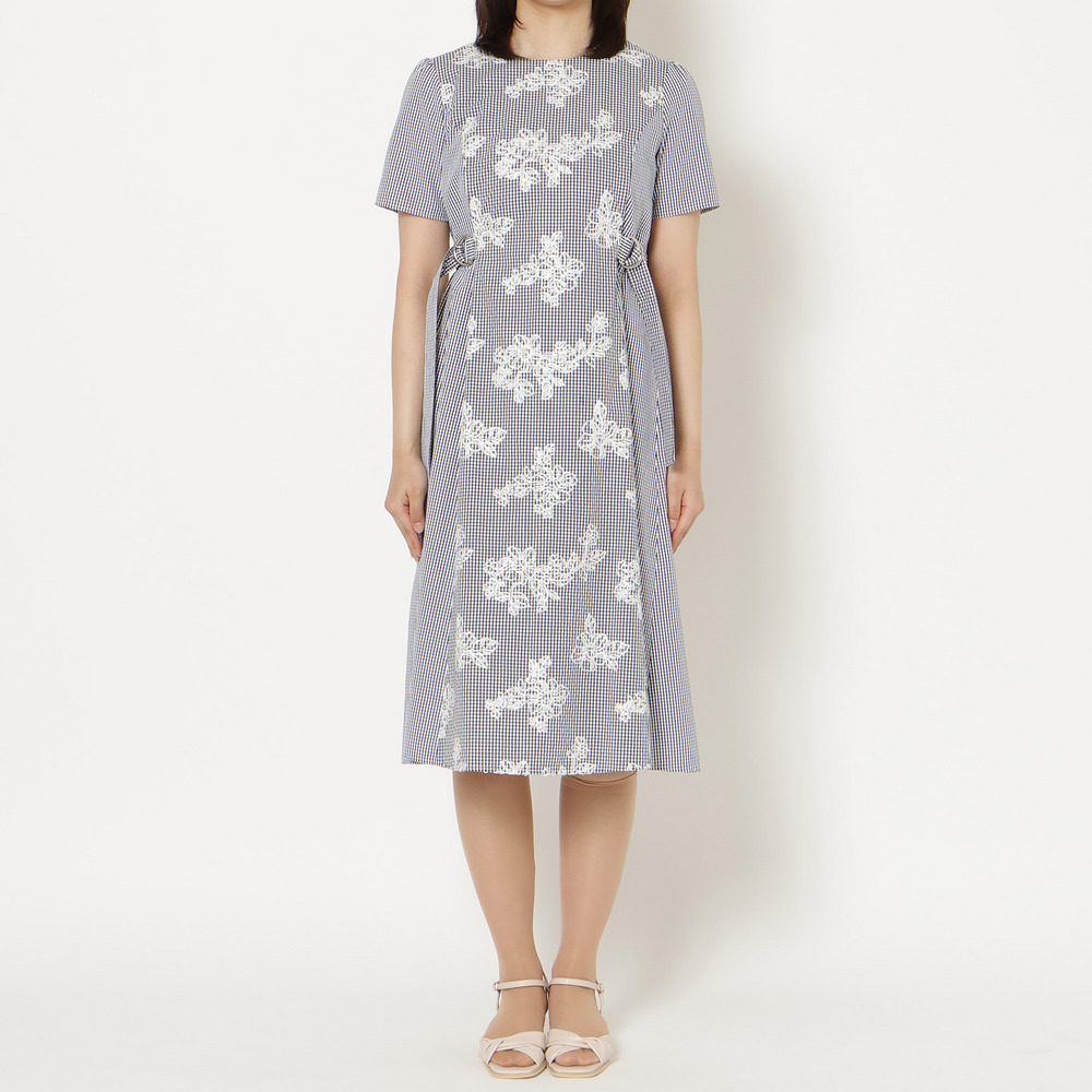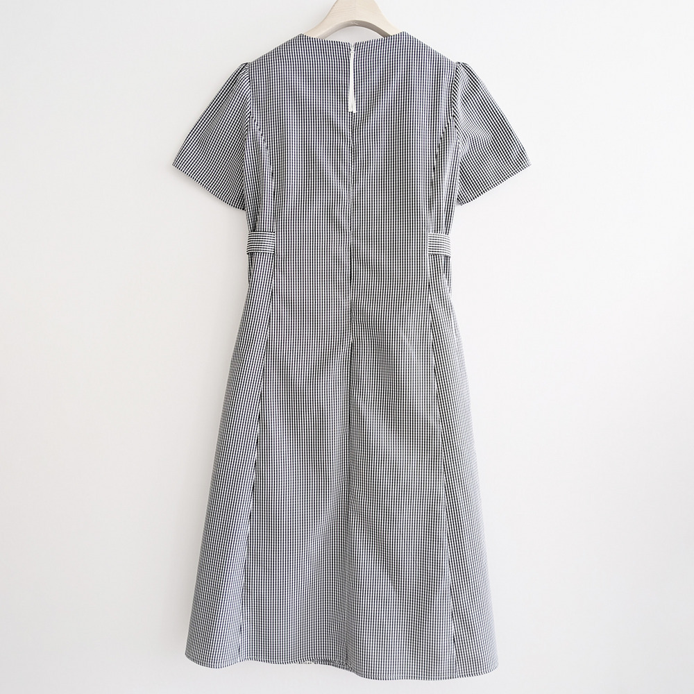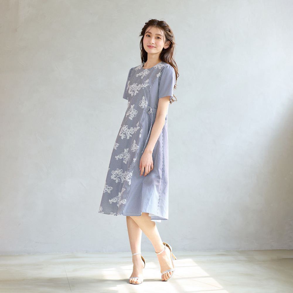 ・ウエストにはリボンベルトを配し、すっきりとしたシルエットを演出