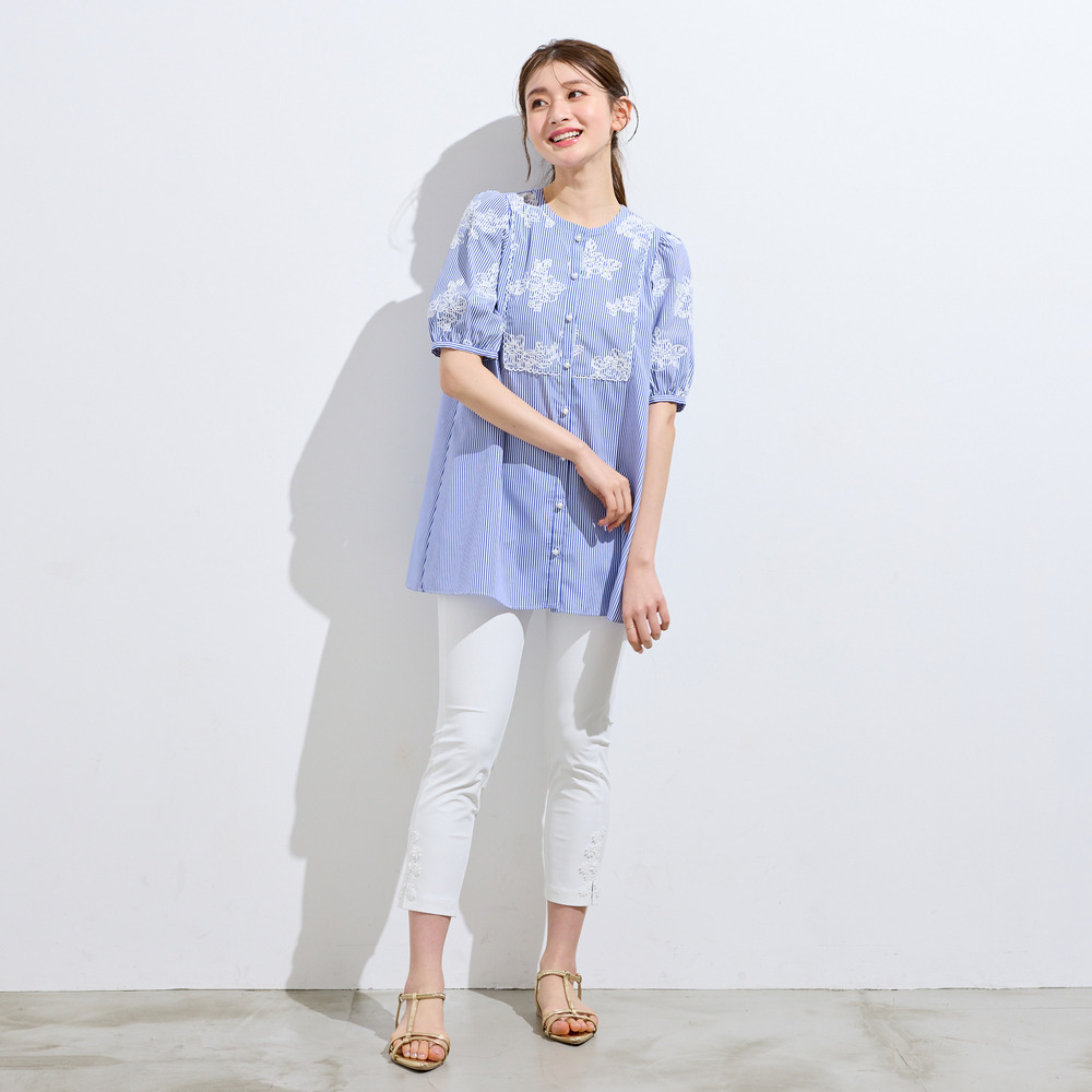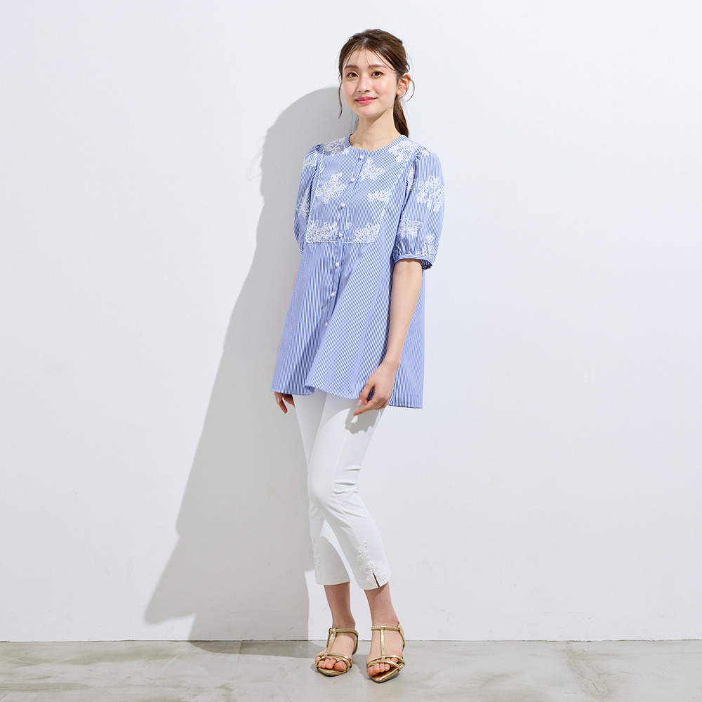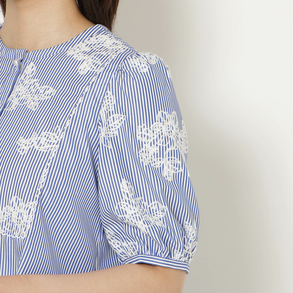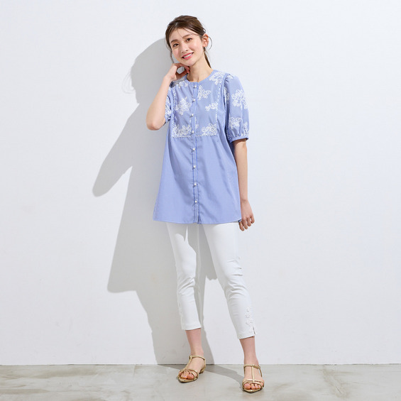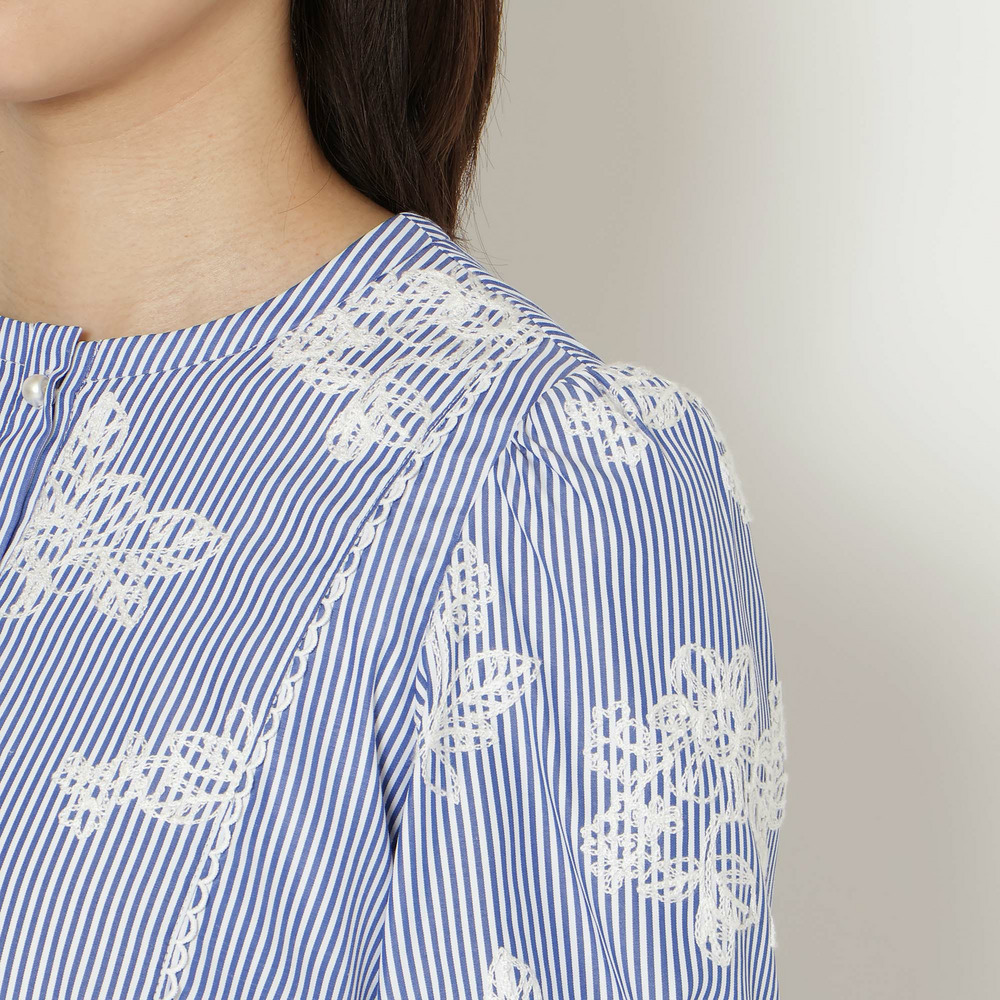 ・ヨーク切替部分と袖にフラワー刺繍を施し、上品なフェミニンさを引き立ててくれます