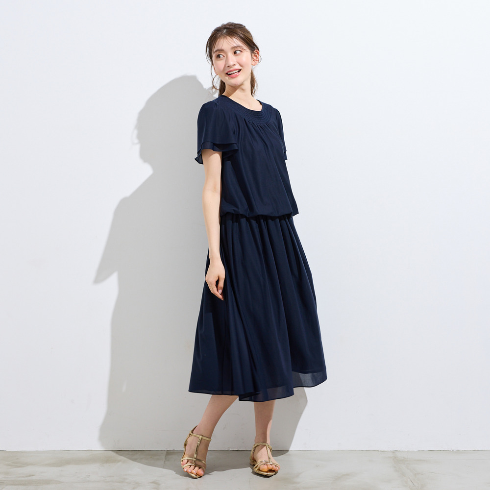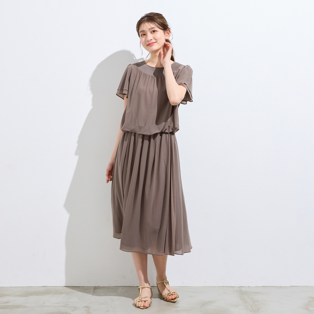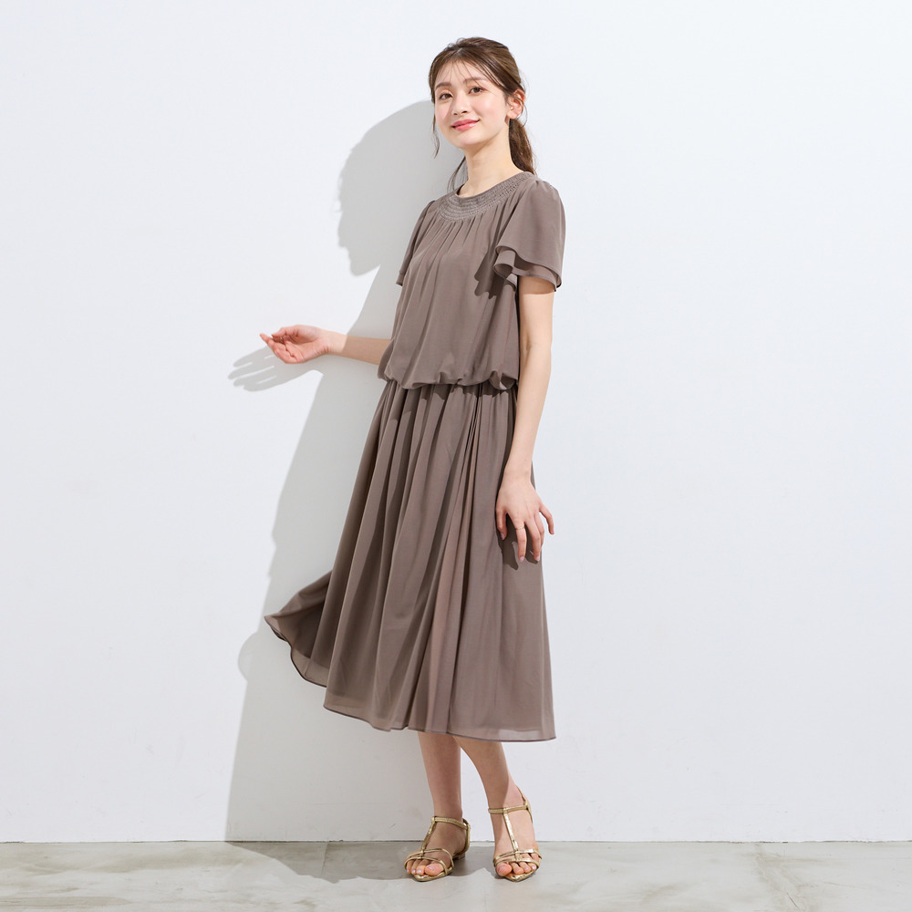 素材選びからデザイン、パターンまでを一貫して行い、タックの向きやギャザー分量、フリル位置などを36・38・40号と42・46・50号では調整し、パターンを分けることで美しいシルエットと着心地の良い服を提案します。