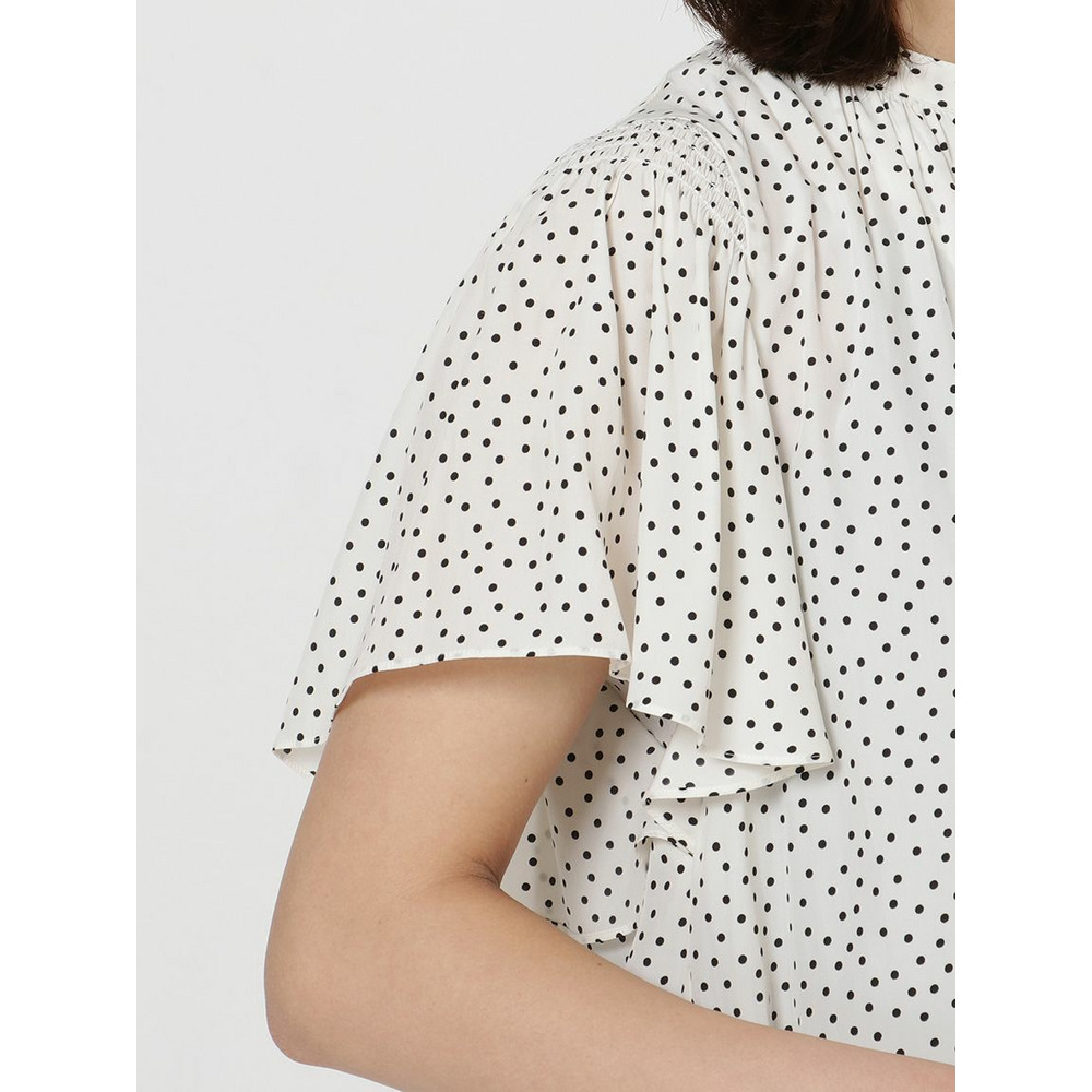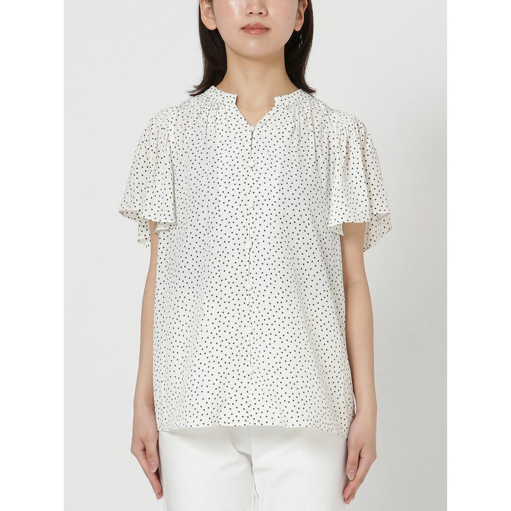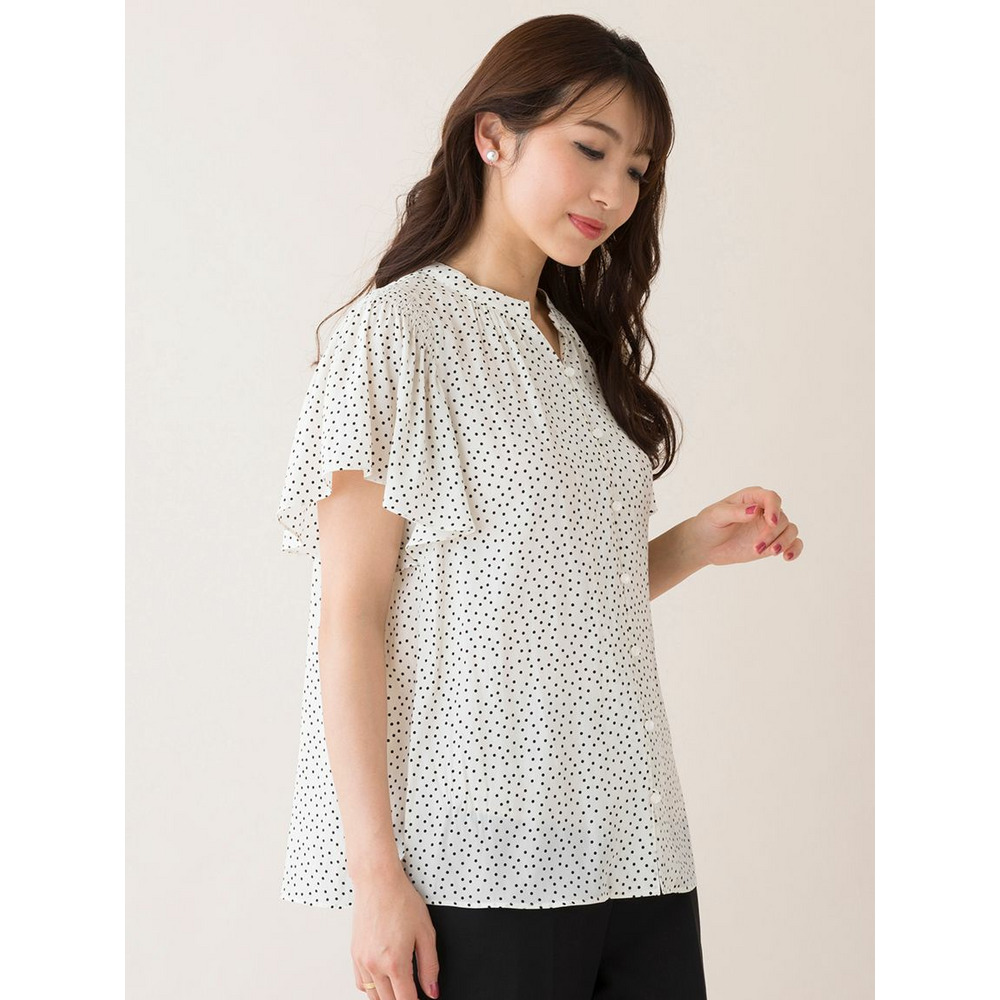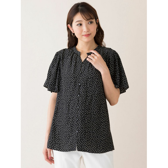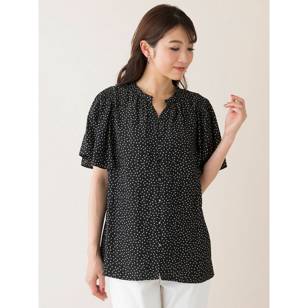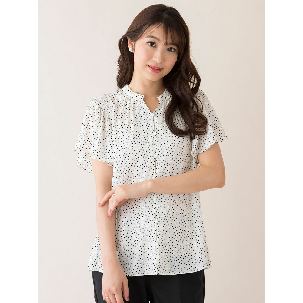 小さなランダムドット柄とフレア袖が女性らしいブラウス。