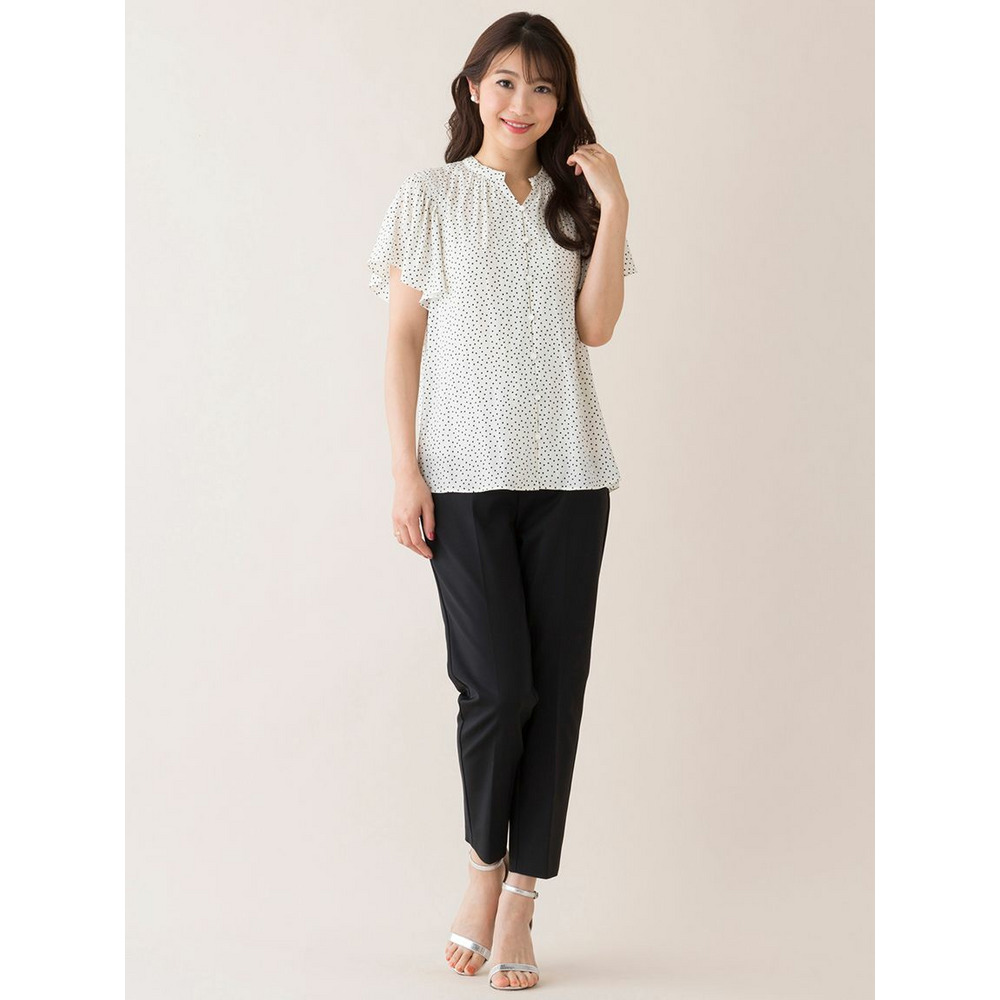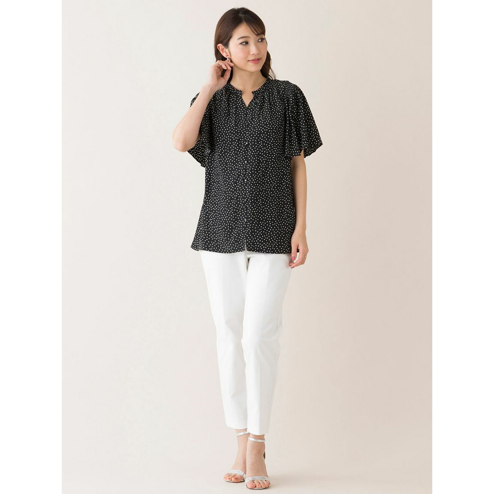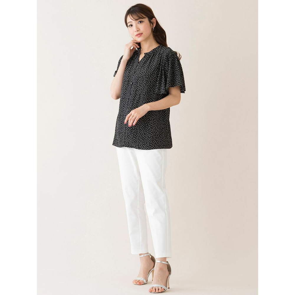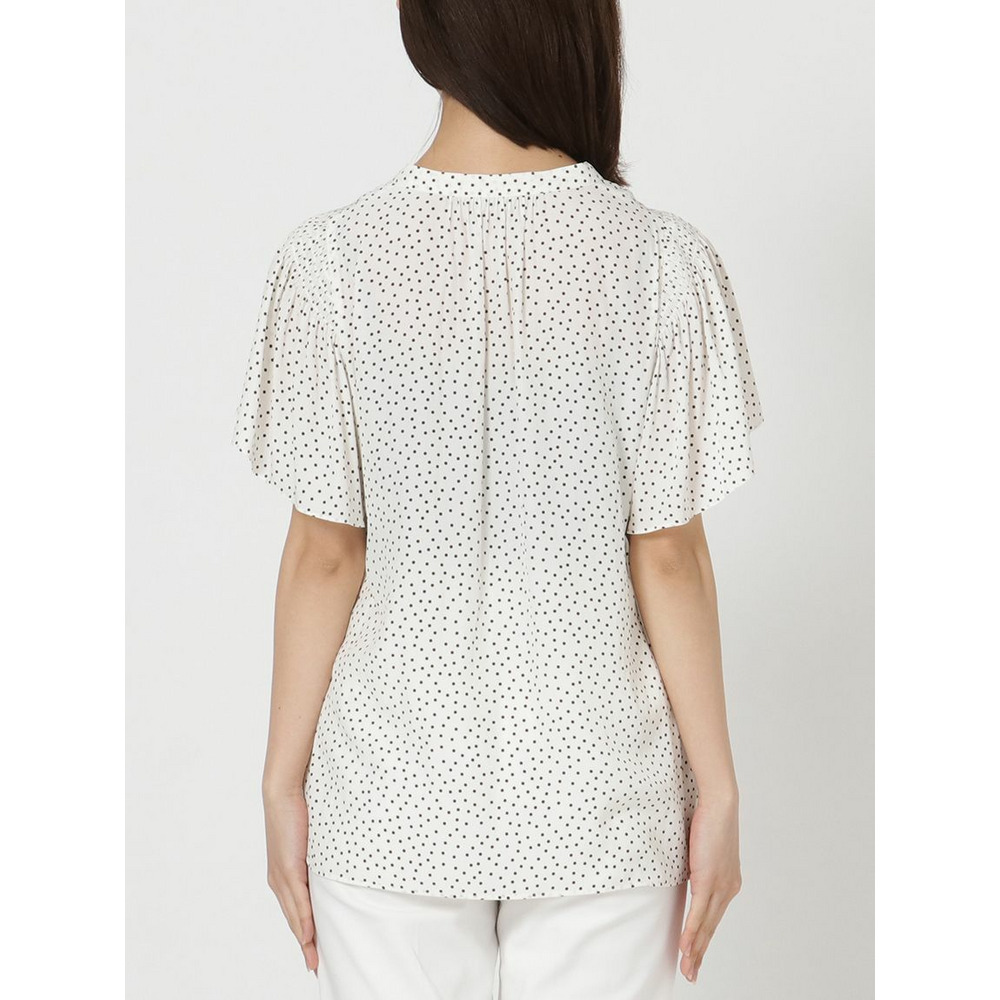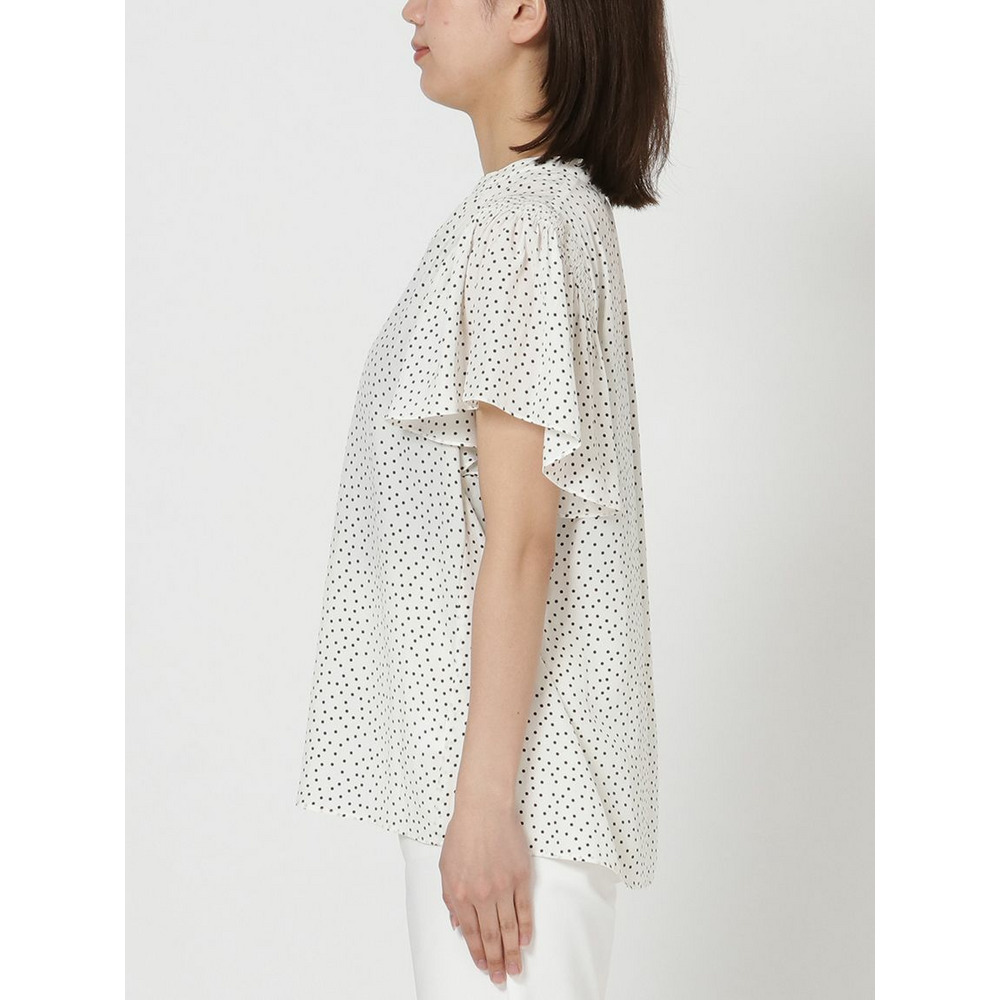 小さなランダムドット柄とフレア袖が女性らしいブラウス。