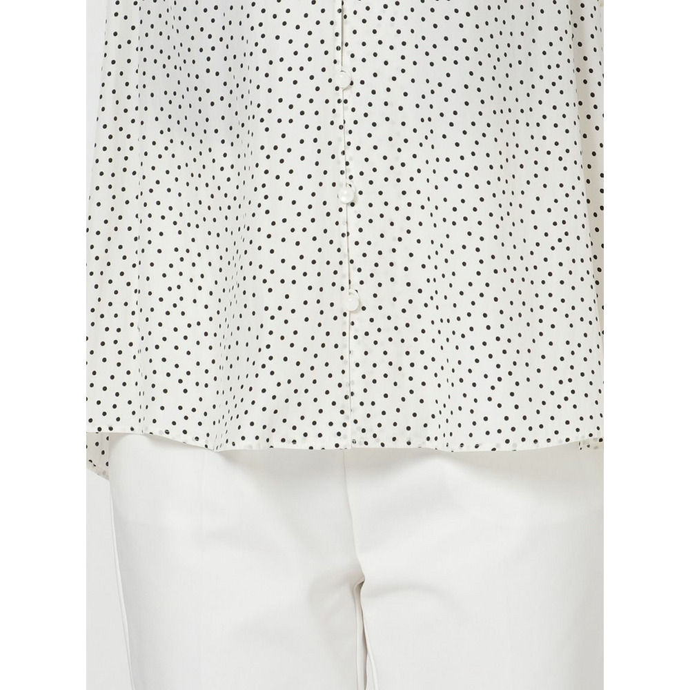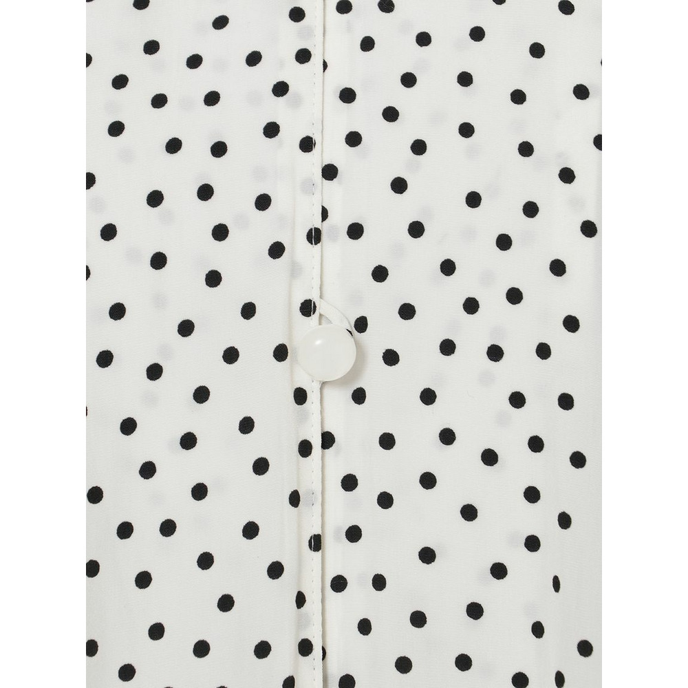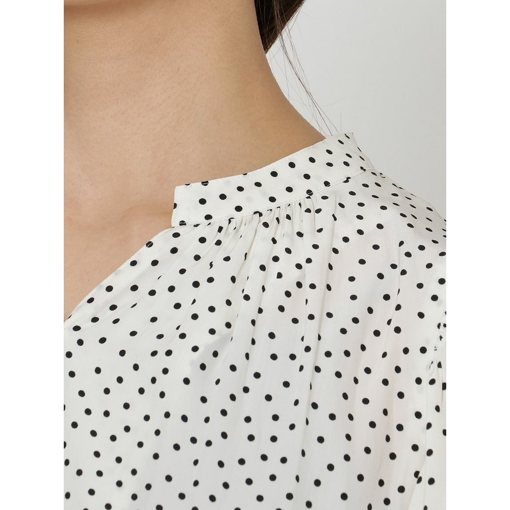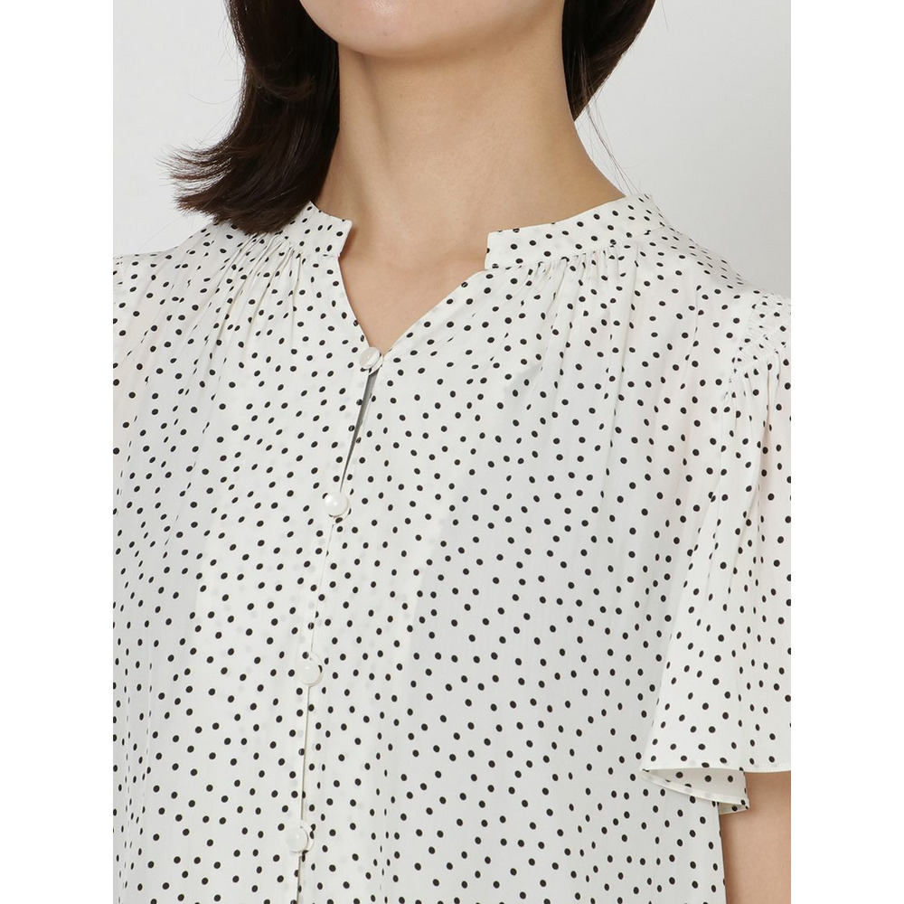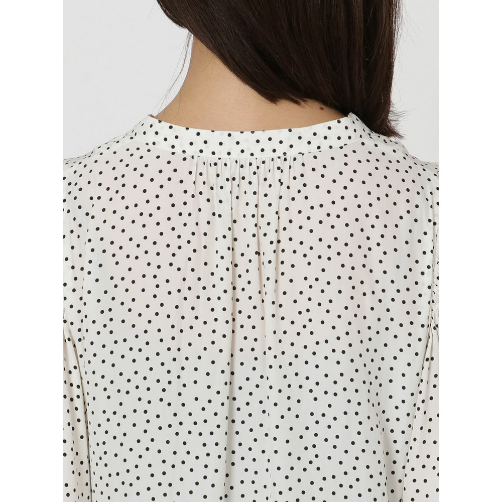 小さなランダムドット柄とフレア袖が女性らしいブラウス。