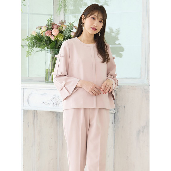 袖に立体的なリボンをあしらい、丸みのあるフォルムが愛らしいノーカラーデザイン。