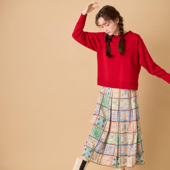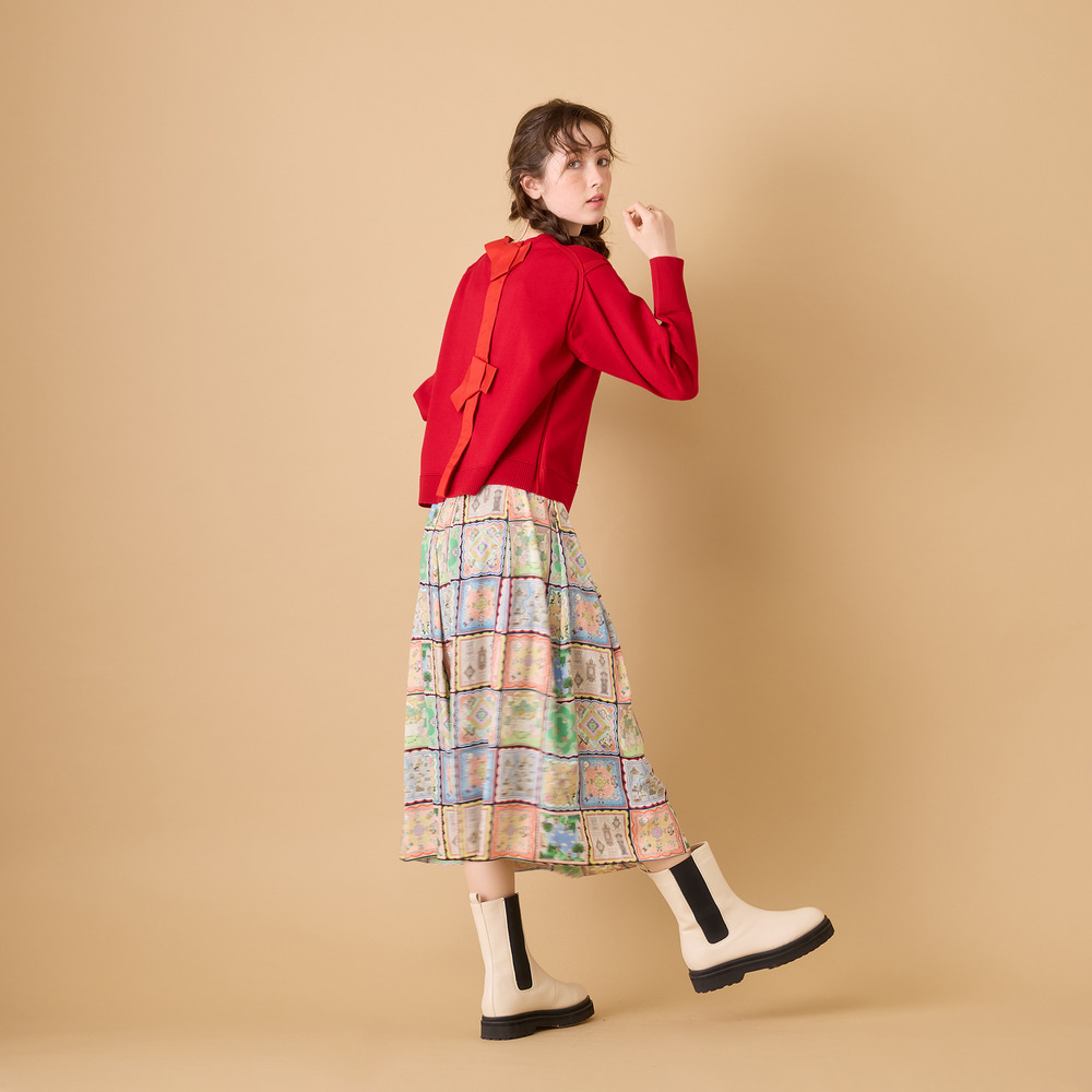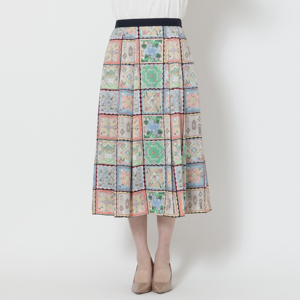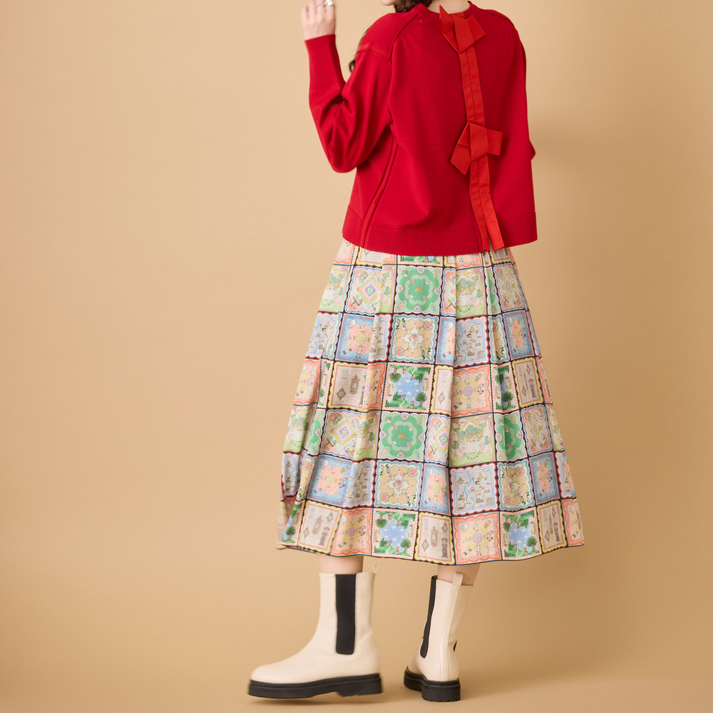いろんなテイストの22fabricらしいデザインが、パッチワークのように並んだフレアスカート。