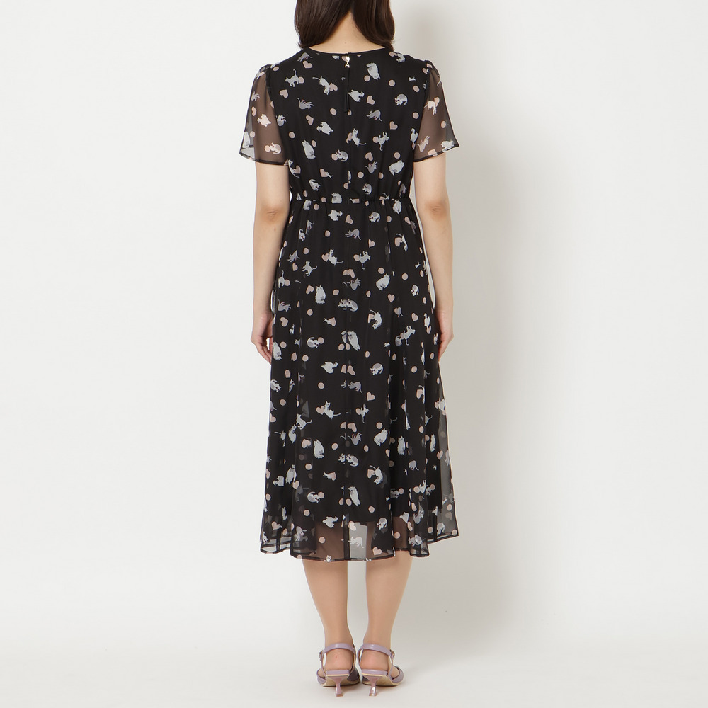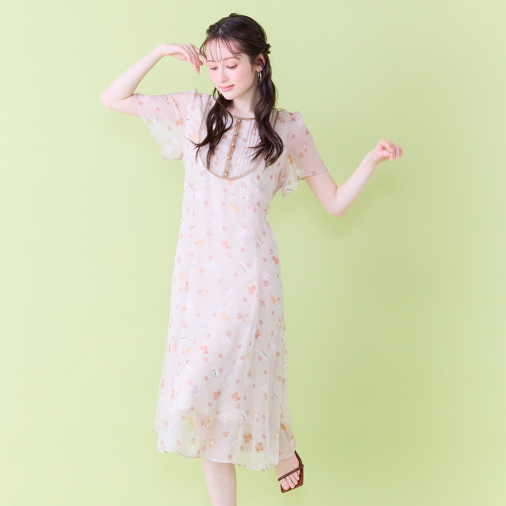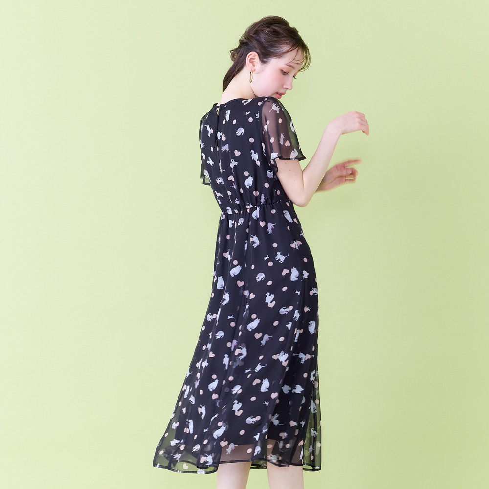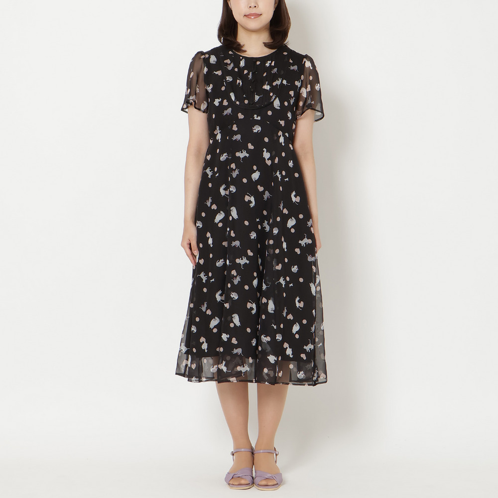 ・わんことにゃんこをバランスよく配置し、かわいらしさの中に大人な印象が醸し出されたプリントワンピース。