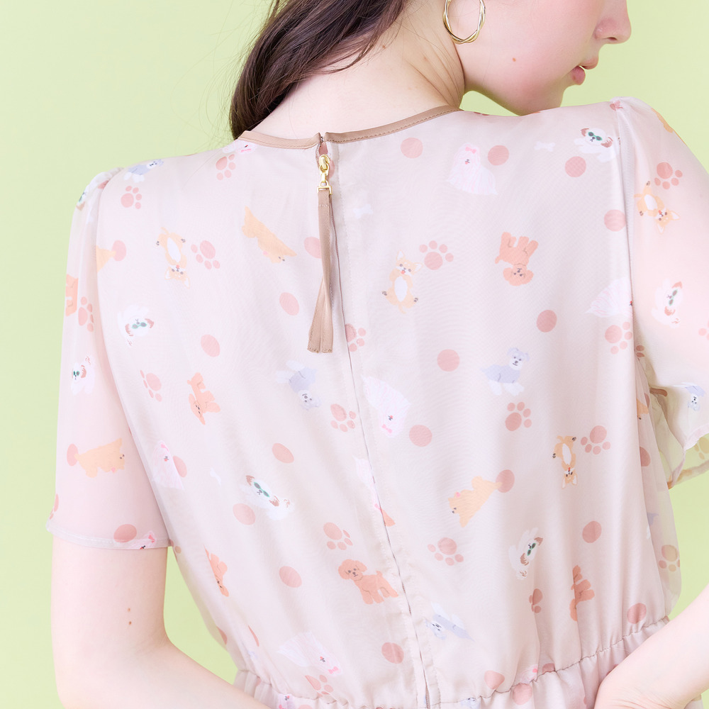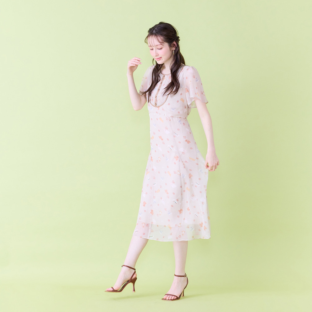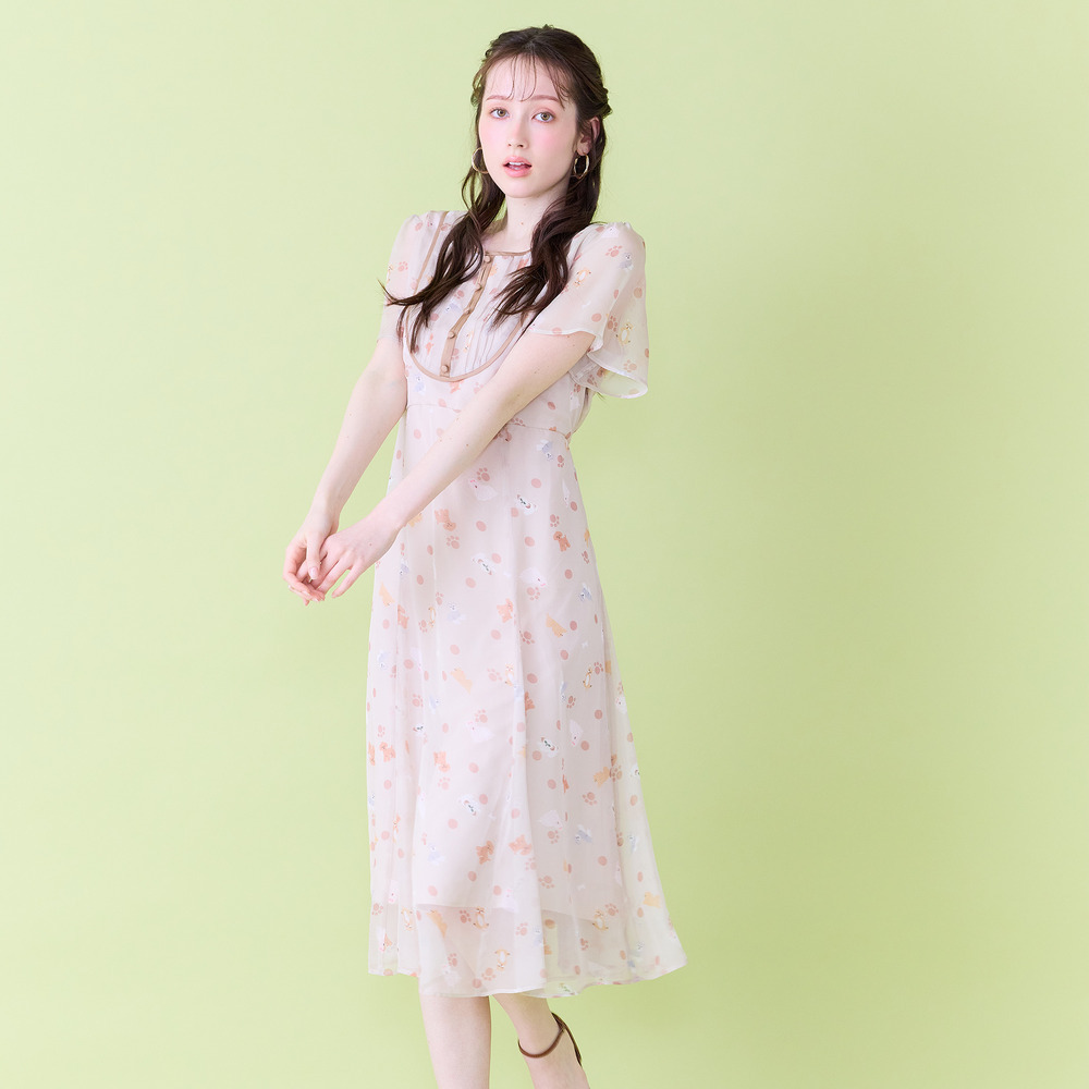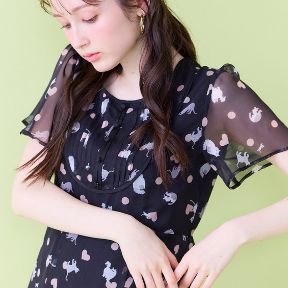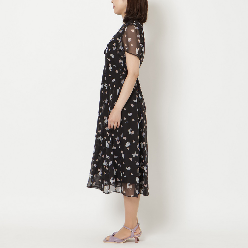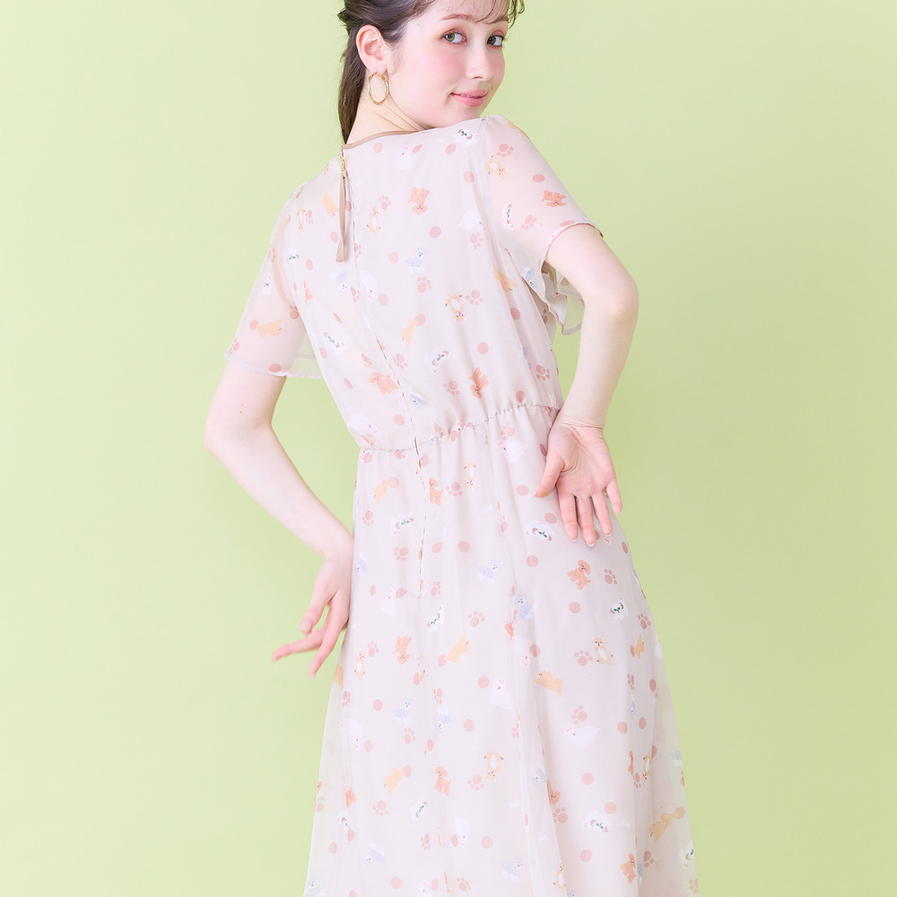 ・わんことにゃんこをバランスよく配置し、かわいらしさの中に大人な印象が醸し出されたプリントワンピース。