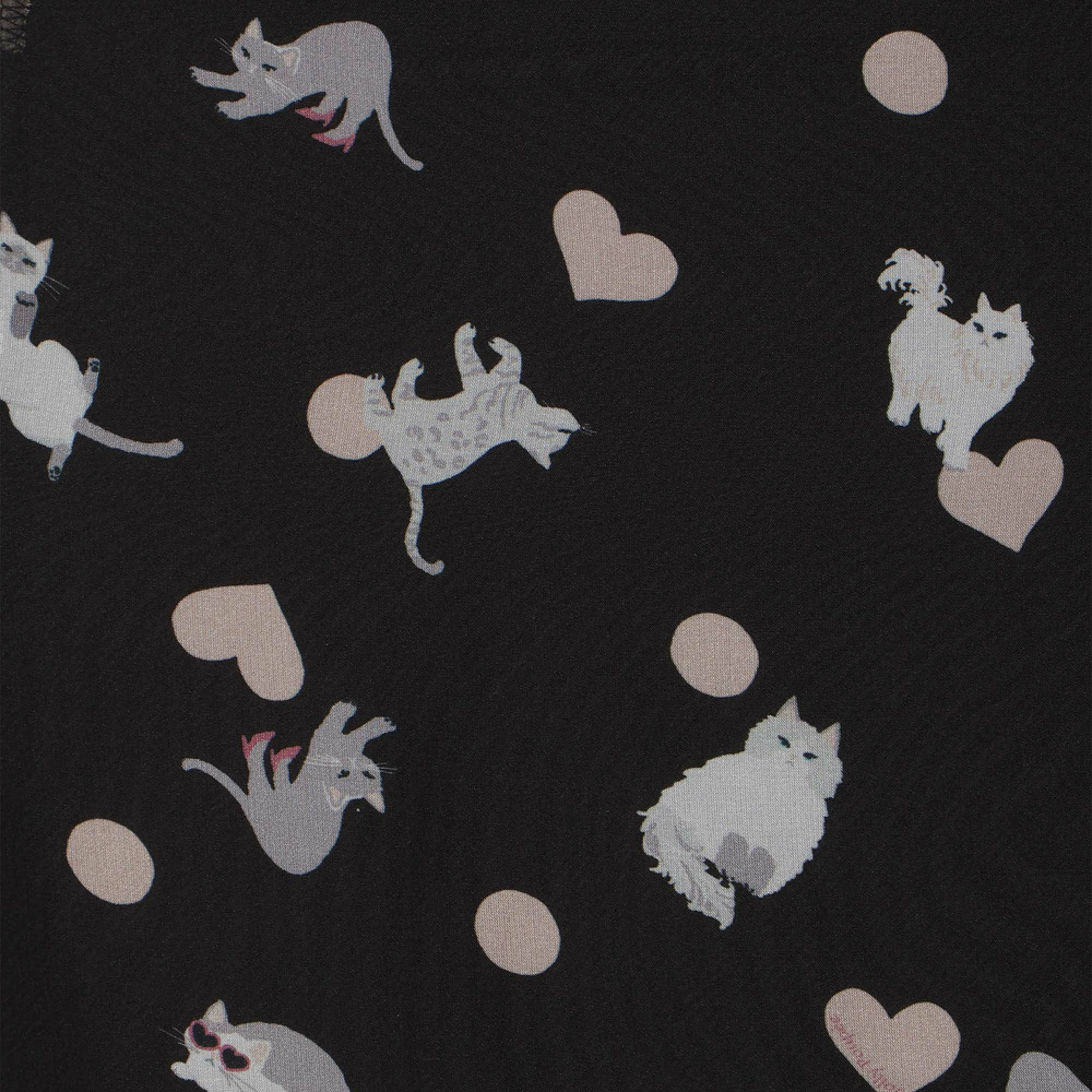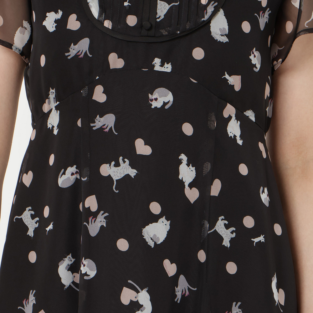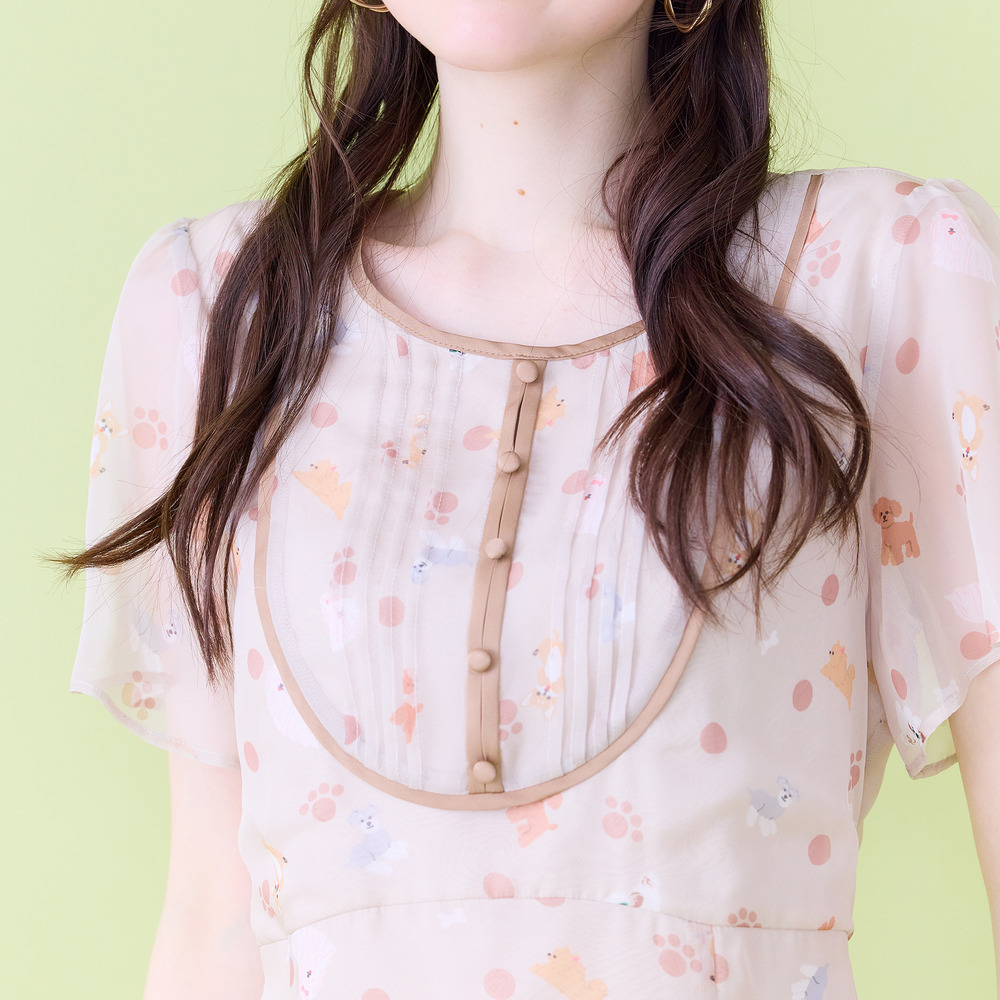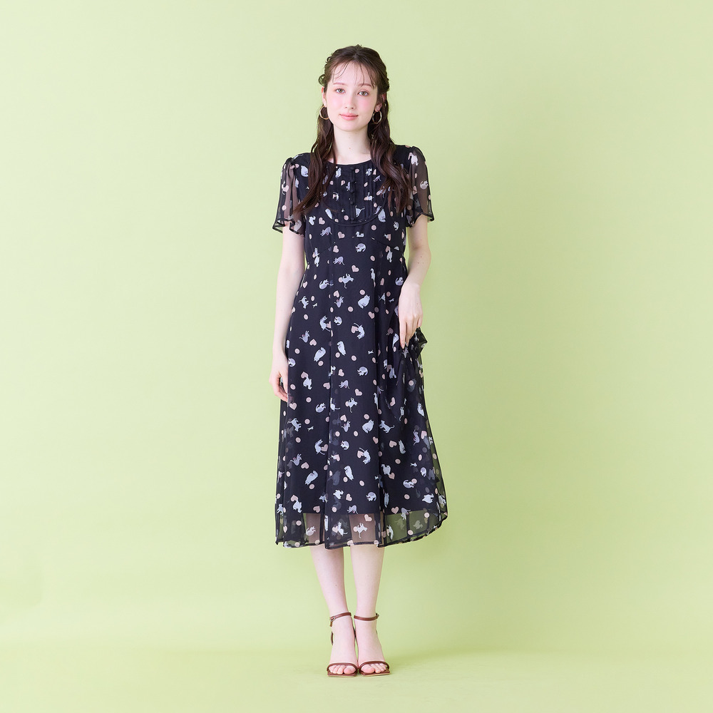 ・わんことにゃんこをバランスよく配置し、かわいらしさの中に大人な印象が醸し出されたプリントワンピース。