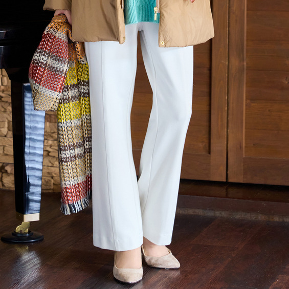 人肌から蒸発する水分で発熱、保湿してくれる機能付き素材で作ったパンツは、寒い時期でもあたたかい。前後センターに入った切り替えラインで、スラッと美脚効果のあるパンツです。