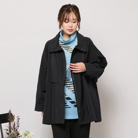 Aラインシルエットのゆったりリラックスできるゆとり感のトレンチブルゾンタイプ。