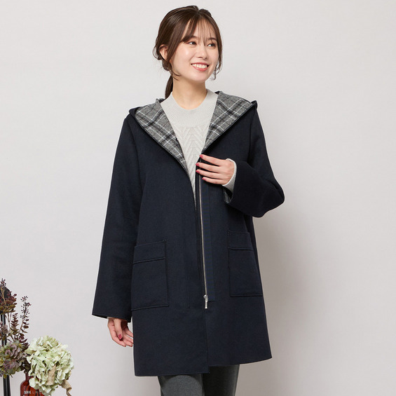 表面が起毛し、裏面はチェック柄の、見た目もあたたかいリバー素材で作ったコート。