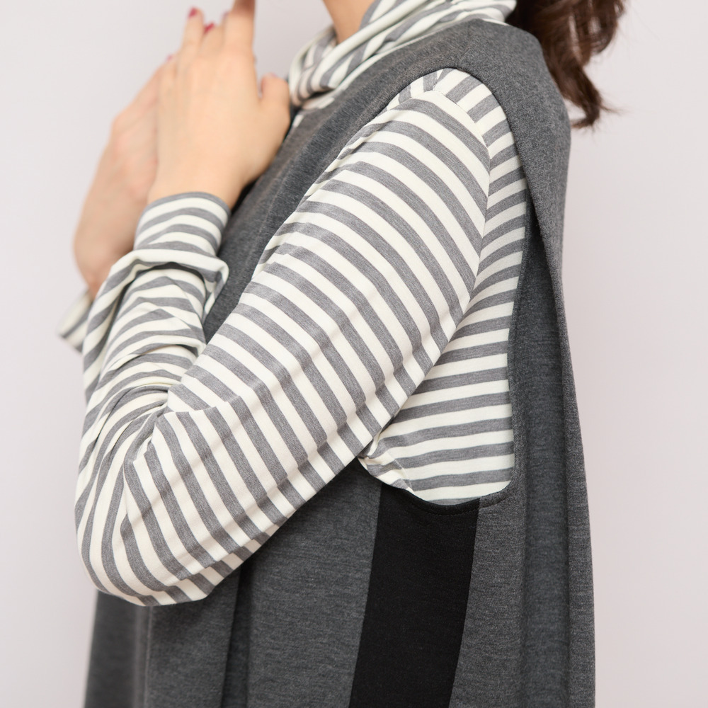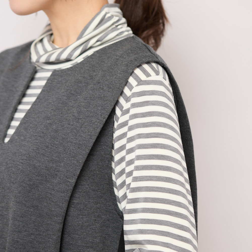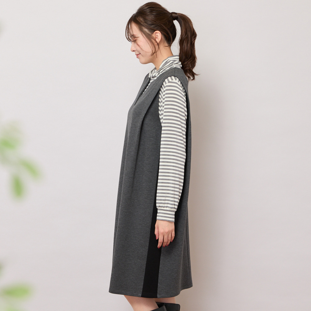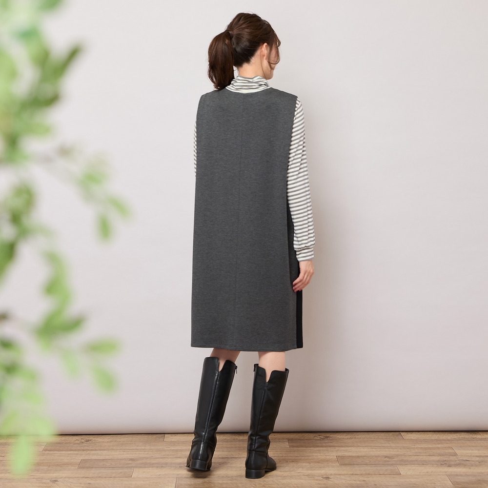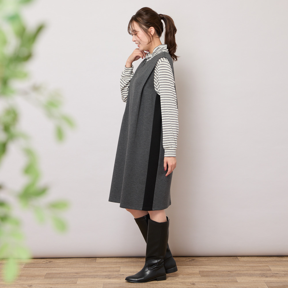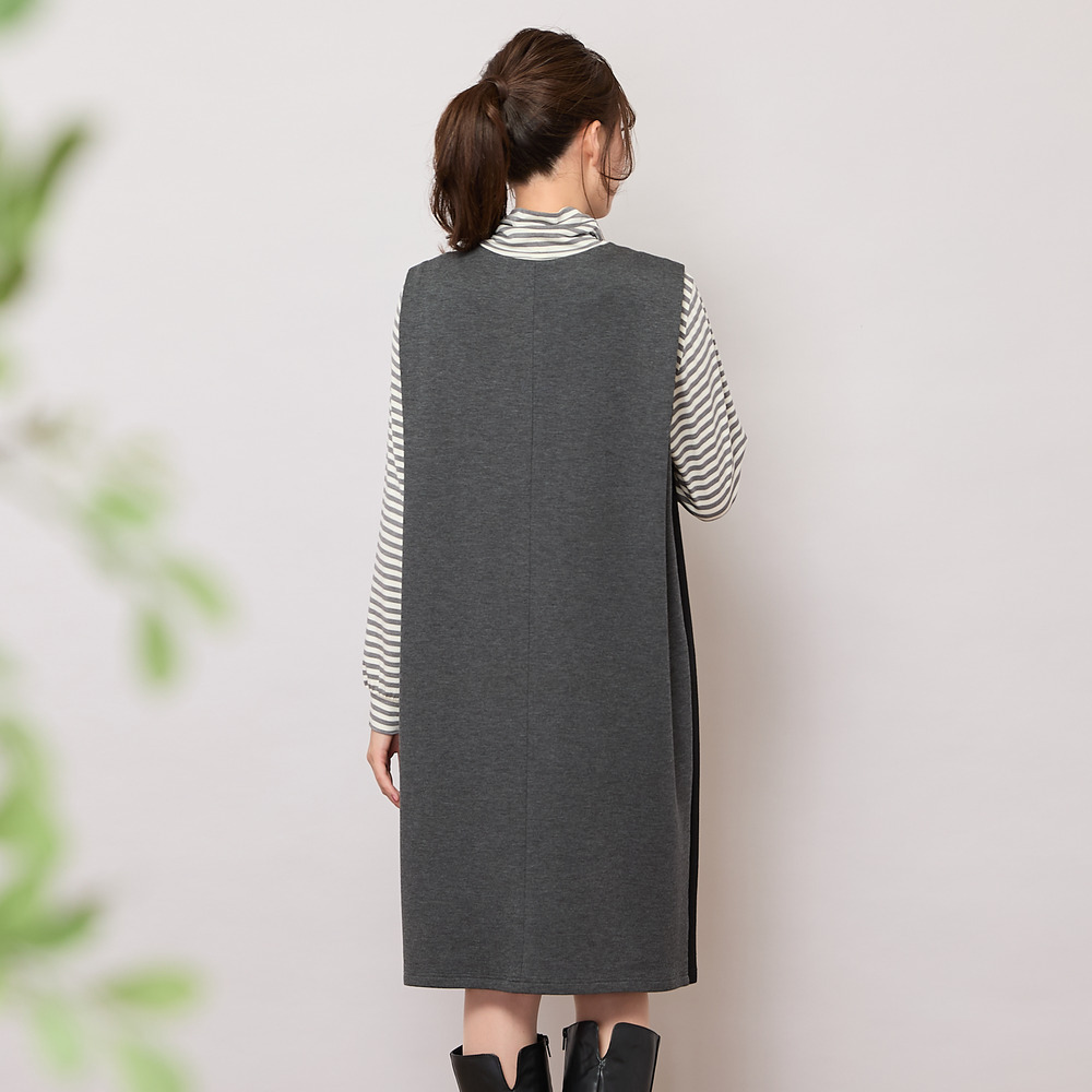 両サイドは生地裏面を使用したバイカラー配色で着やせ効果もあります。