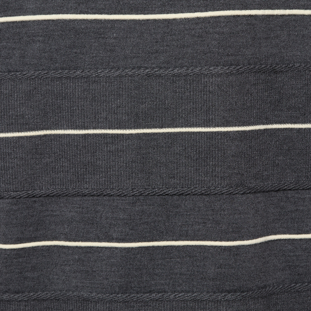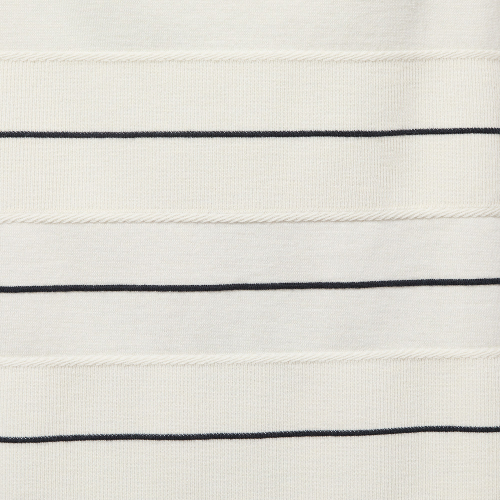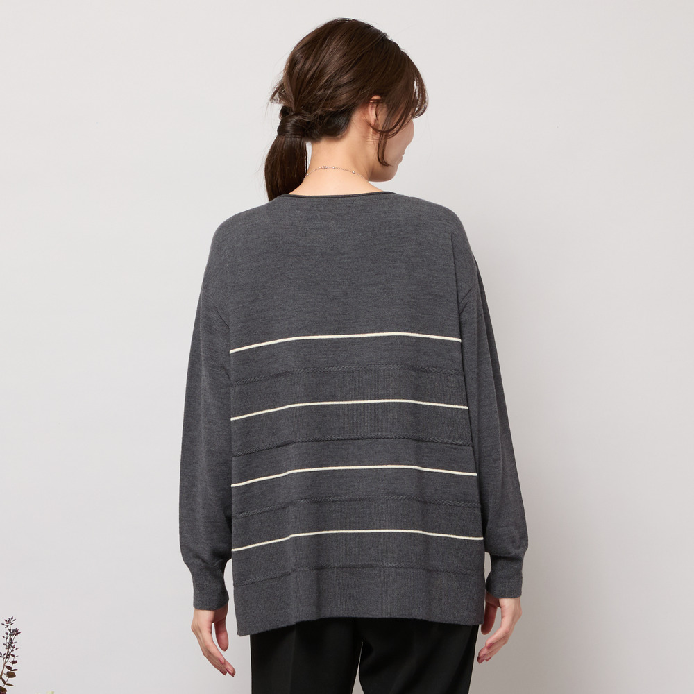 編地に変化を付け、襟端はくるんとカール、前後身頃表面に凹凸のあるバイカラー配色のボーダー柄を表現したデザインです。