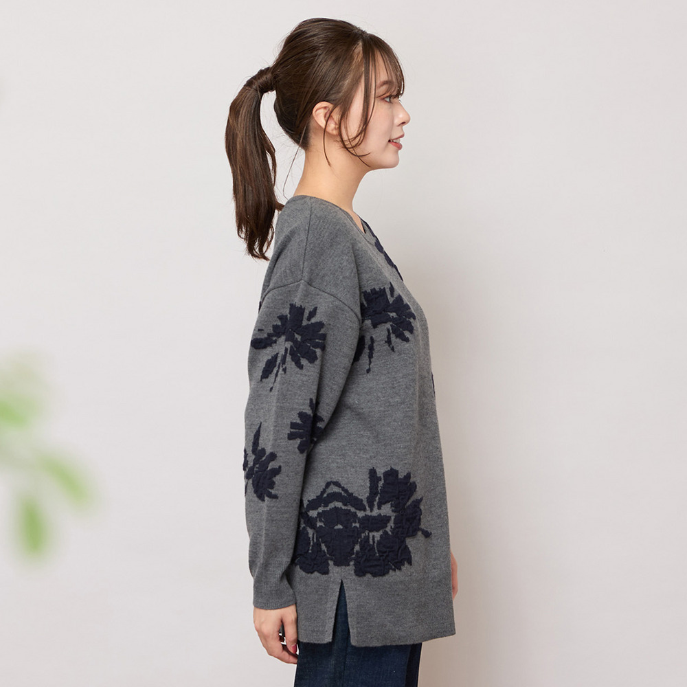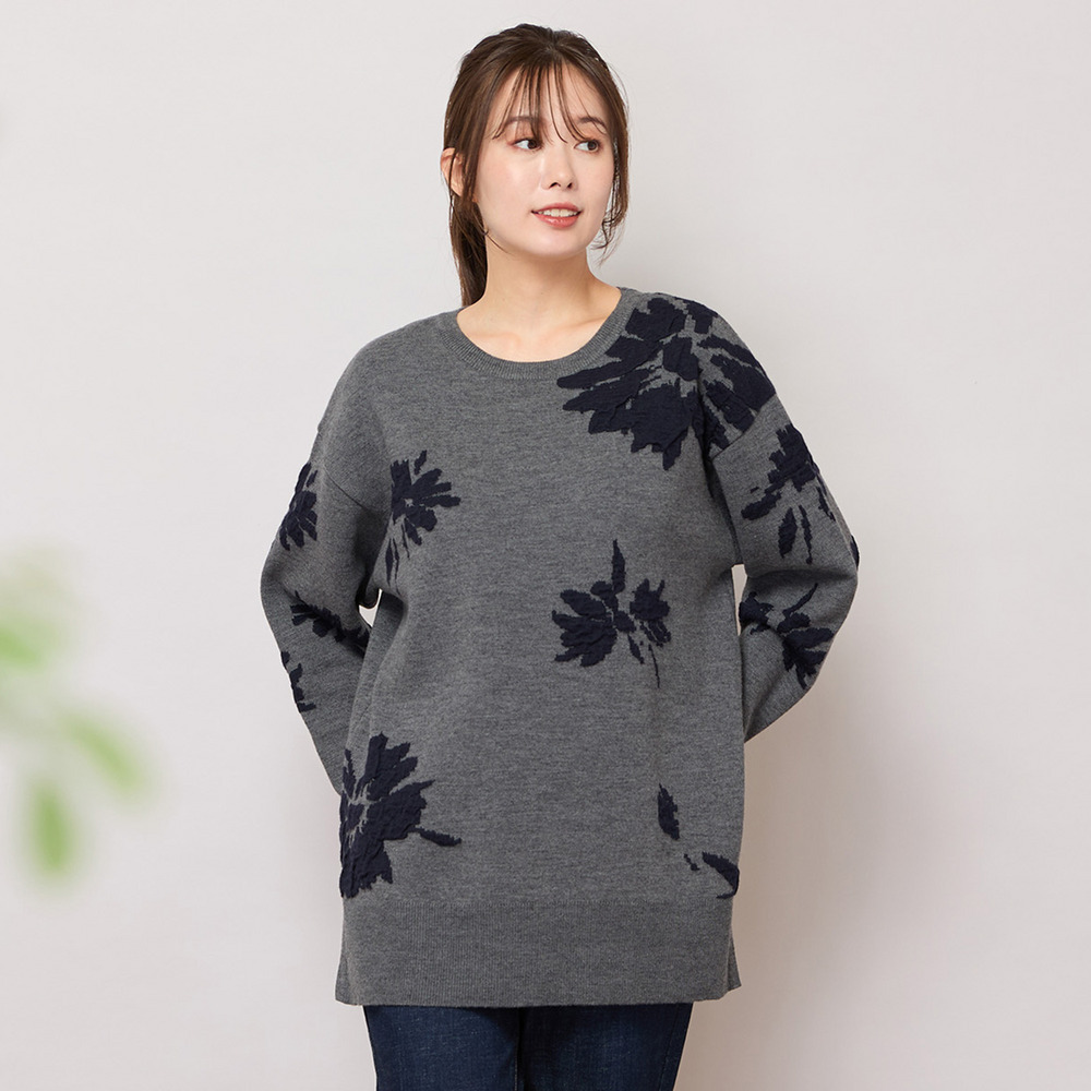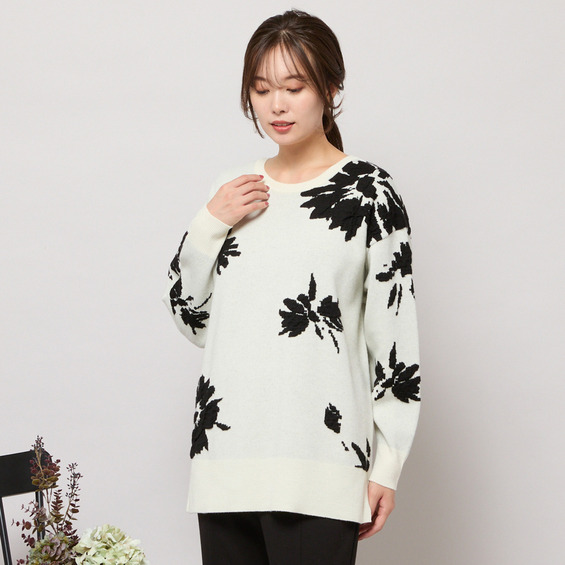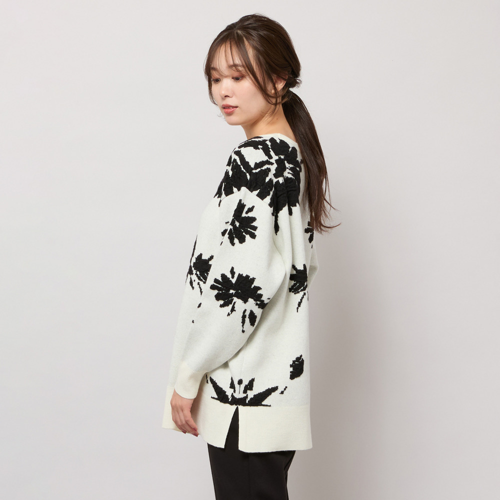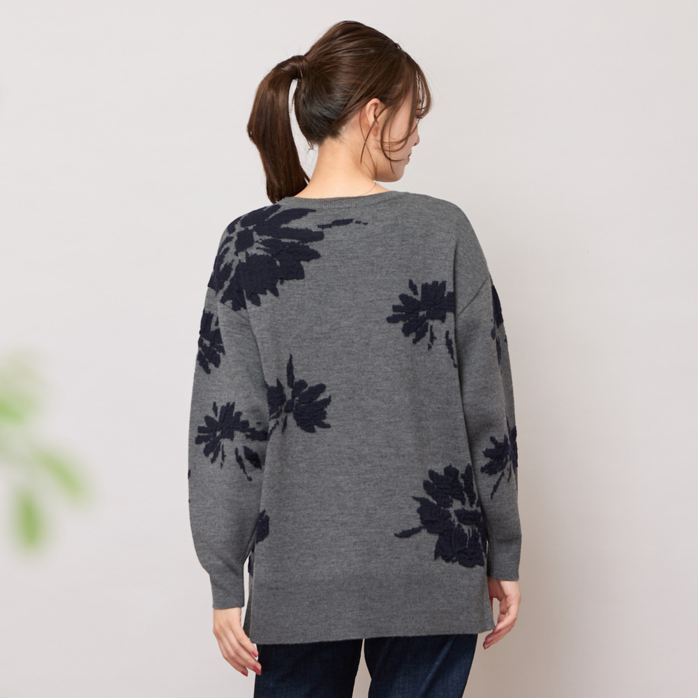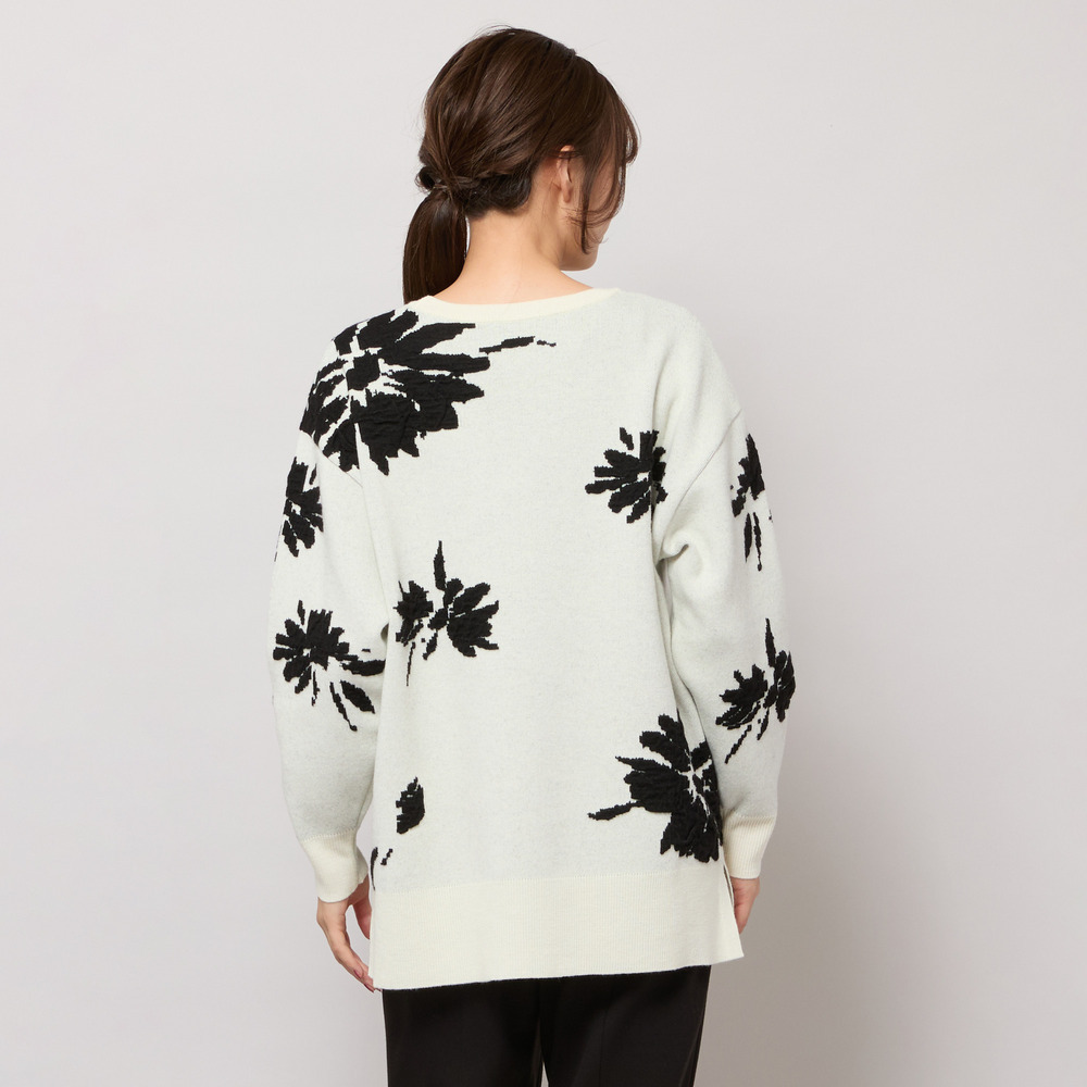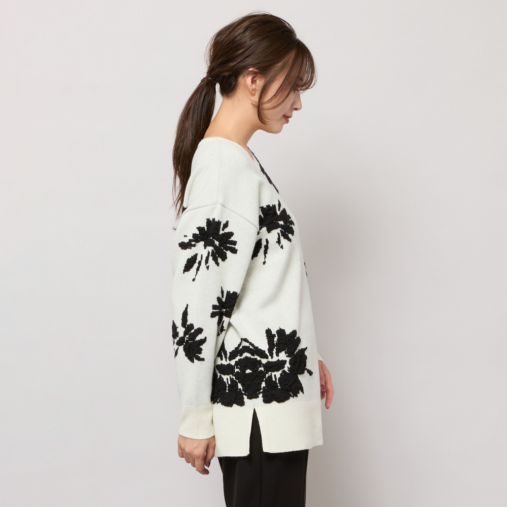 高級感のある、立体的なフラワーモチーフのジャカードが目を引くニット。