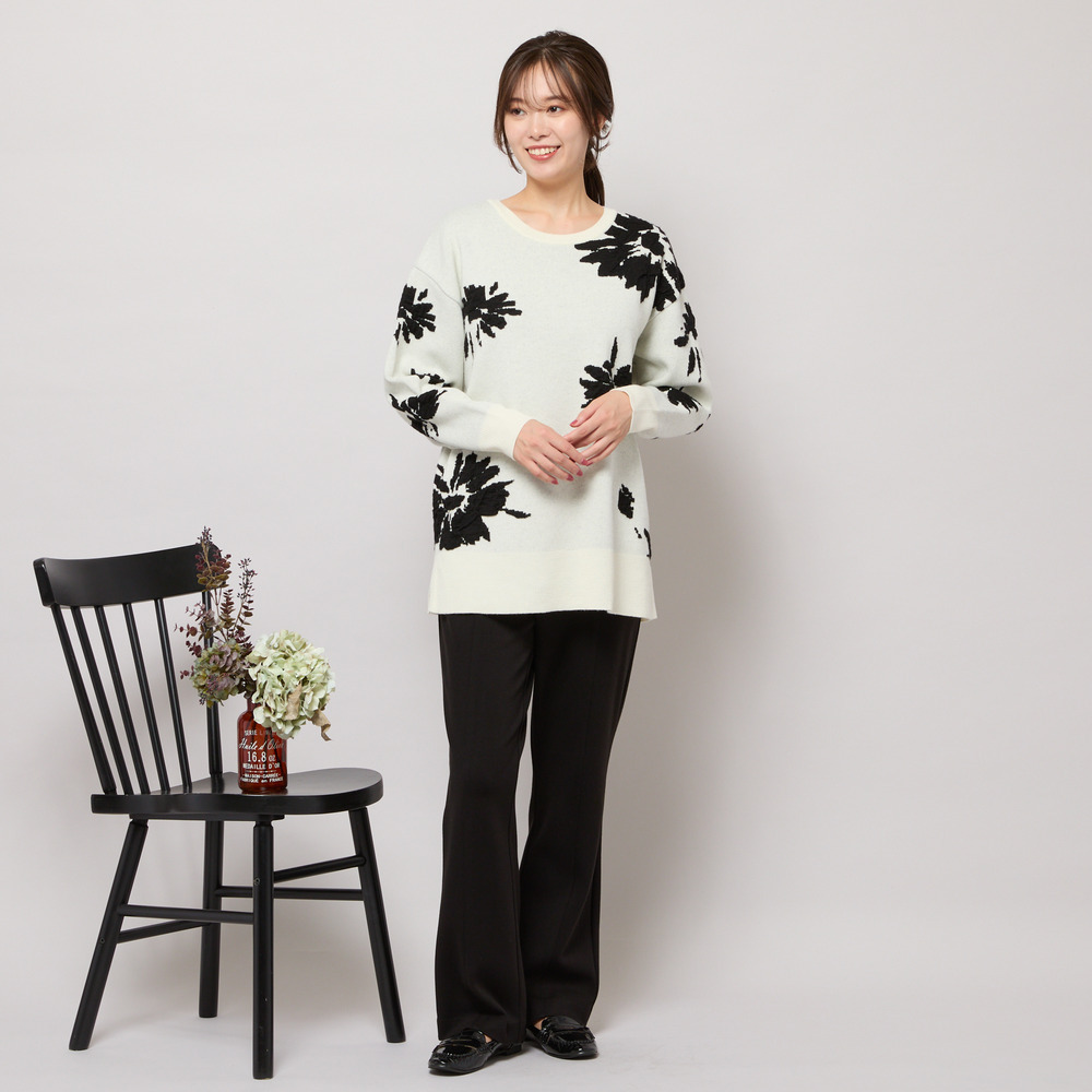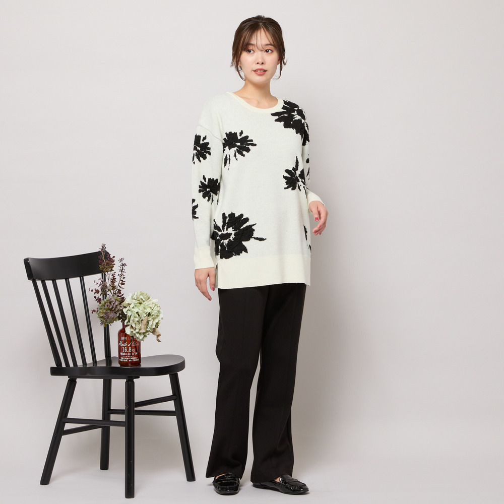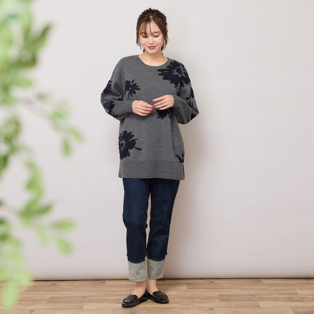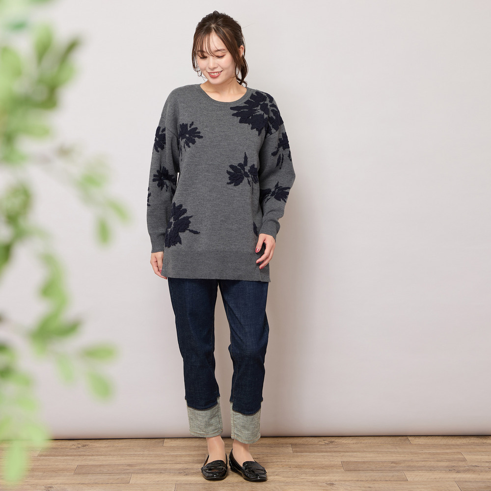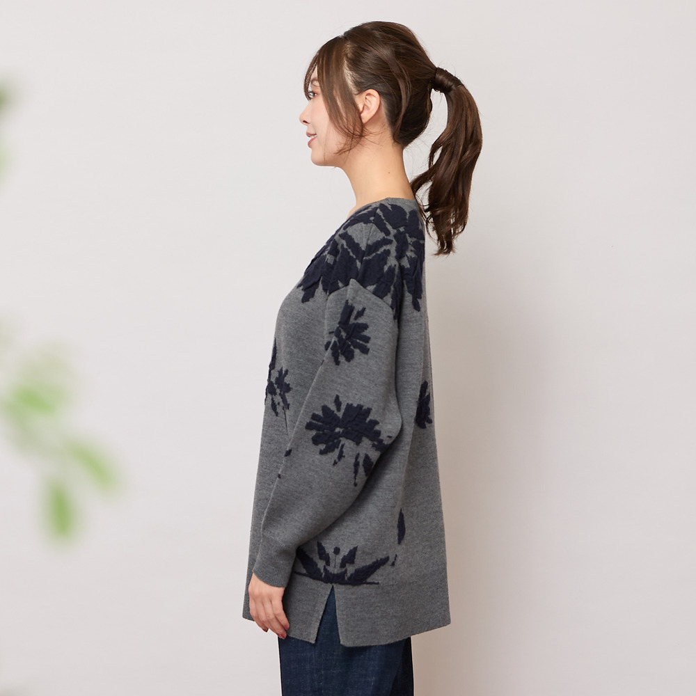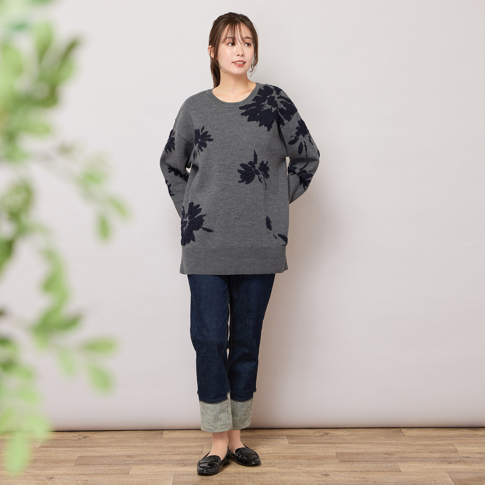 高級感のある、立体的なフラワーモチーフのジャカードが目を引くニット。