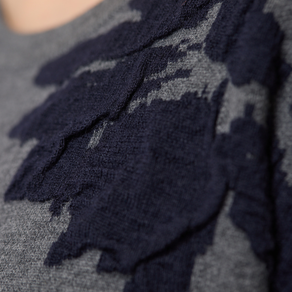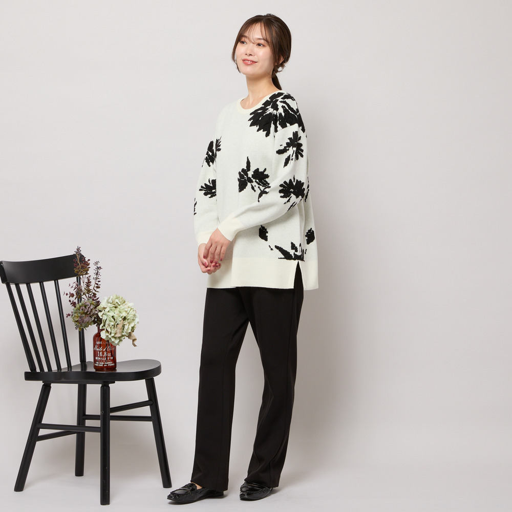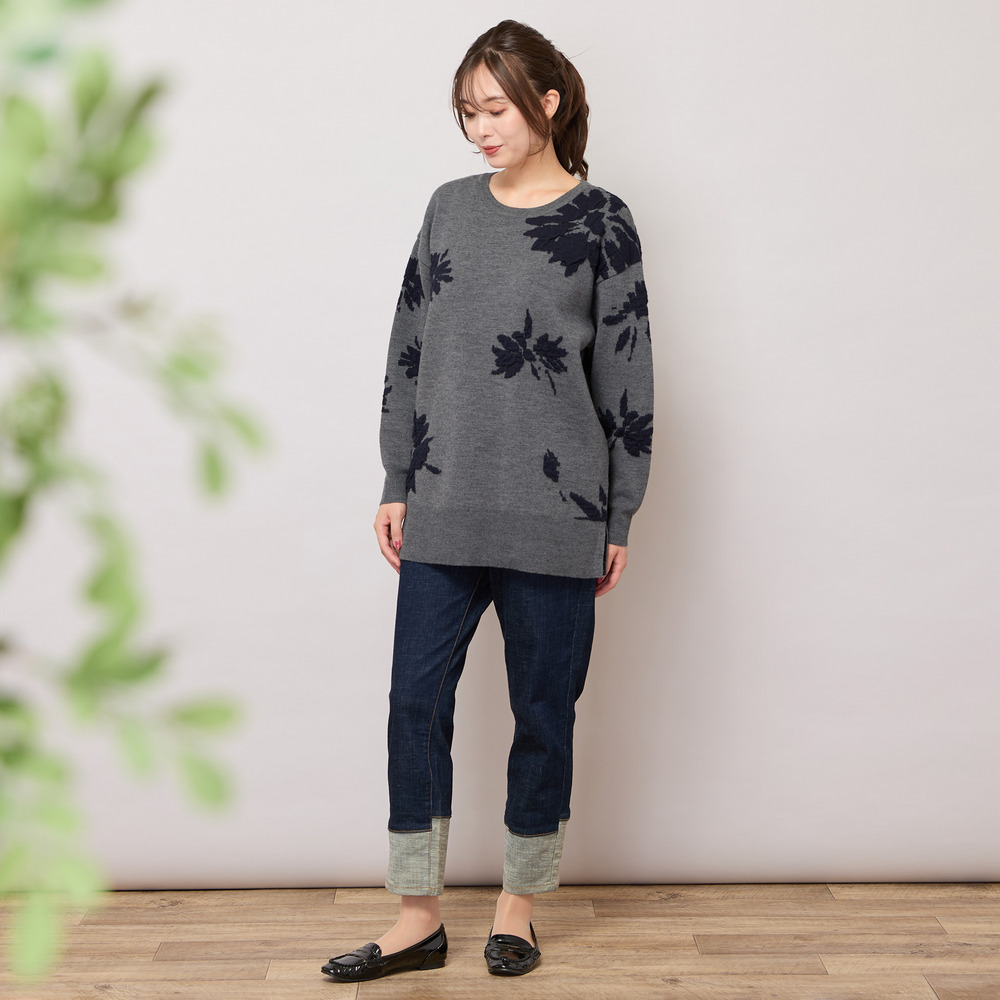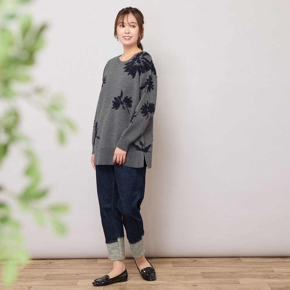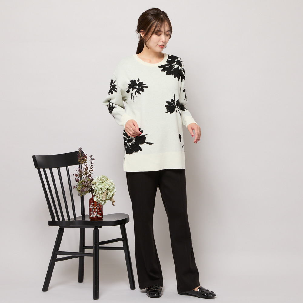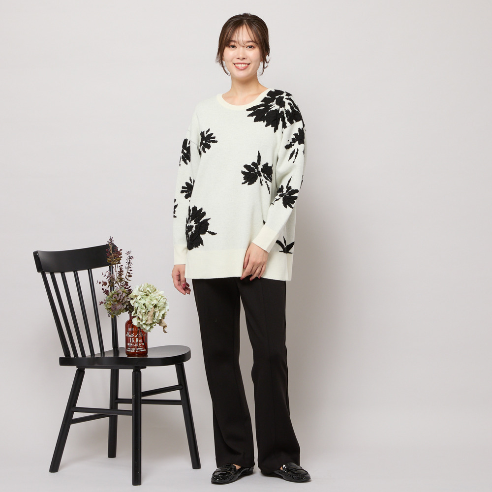 高級感のある、立体的なフラワーモチーフのジャカードが目を引くニット。