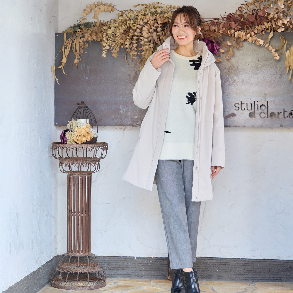 華やかさはありつつも、オフ、グレーの落ち着いたカラーリングで、コーディネートに取り入れやすく、オフィス等でも活躍してくれる1枚です。
