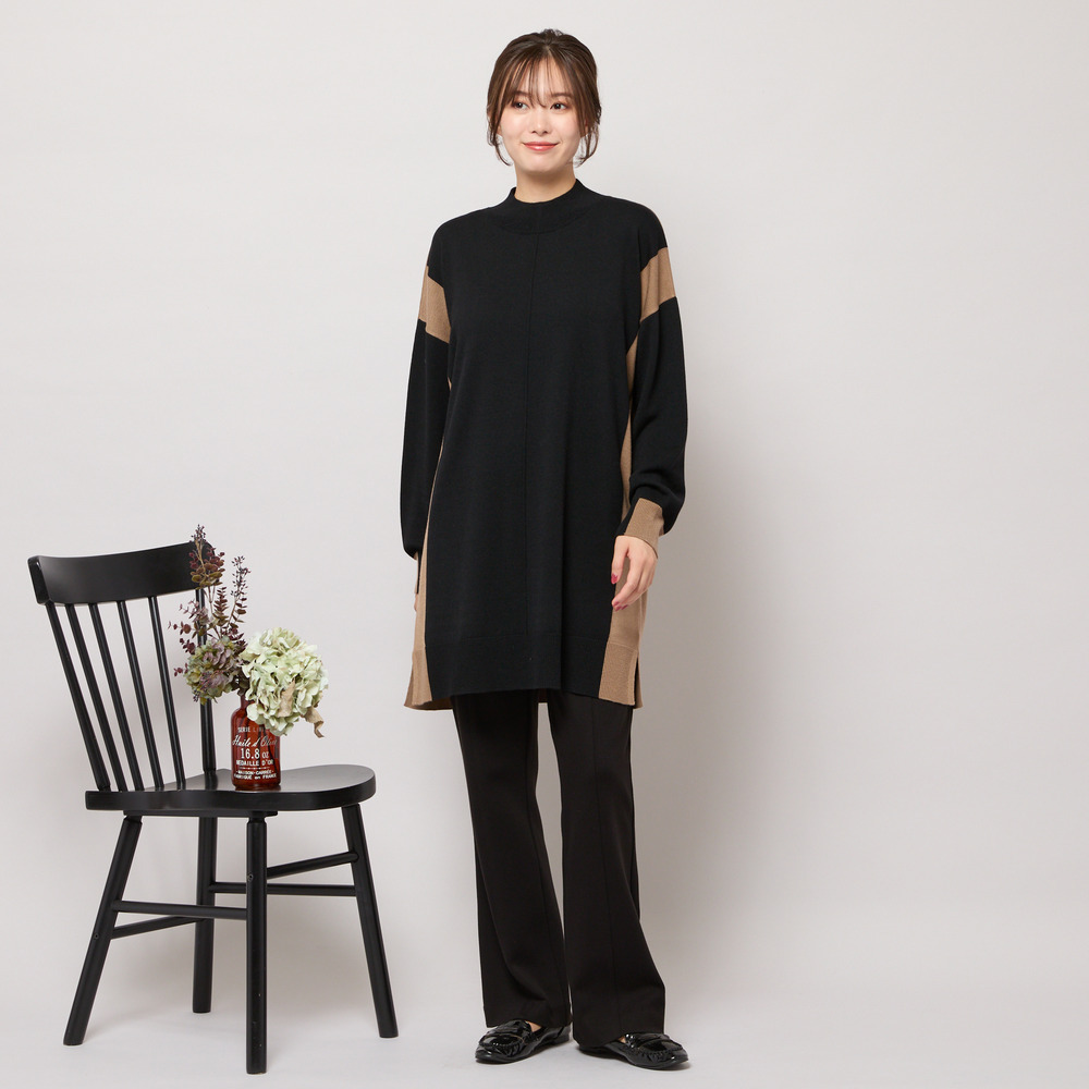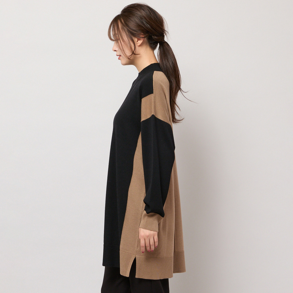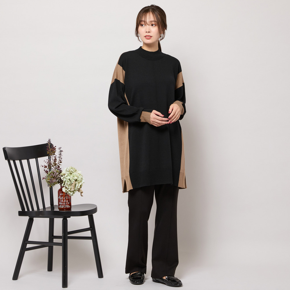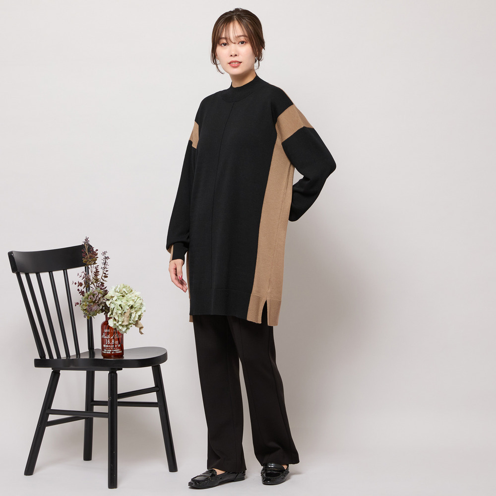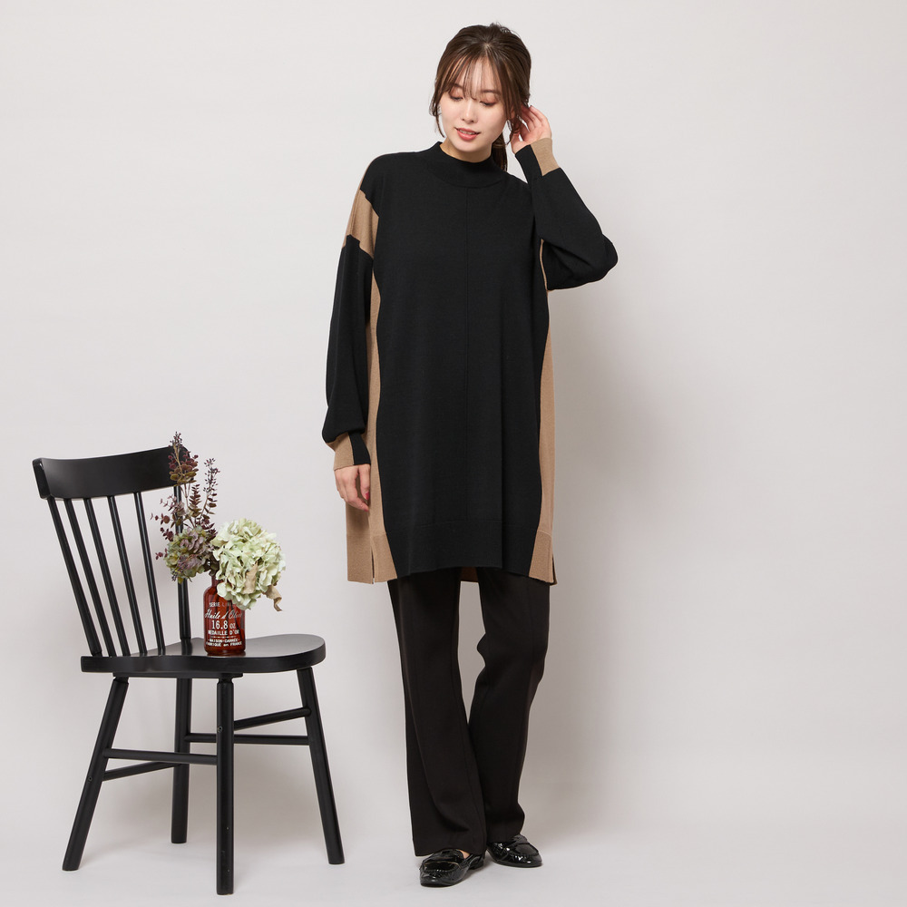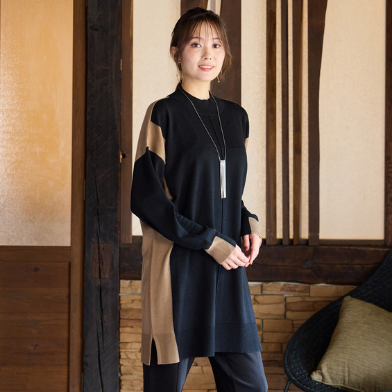バイカラー配色・チュニック丈ハイネックニット