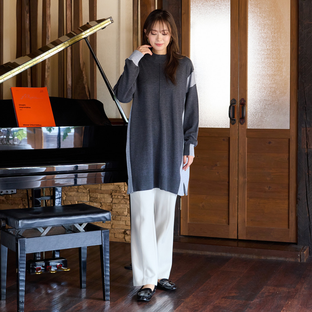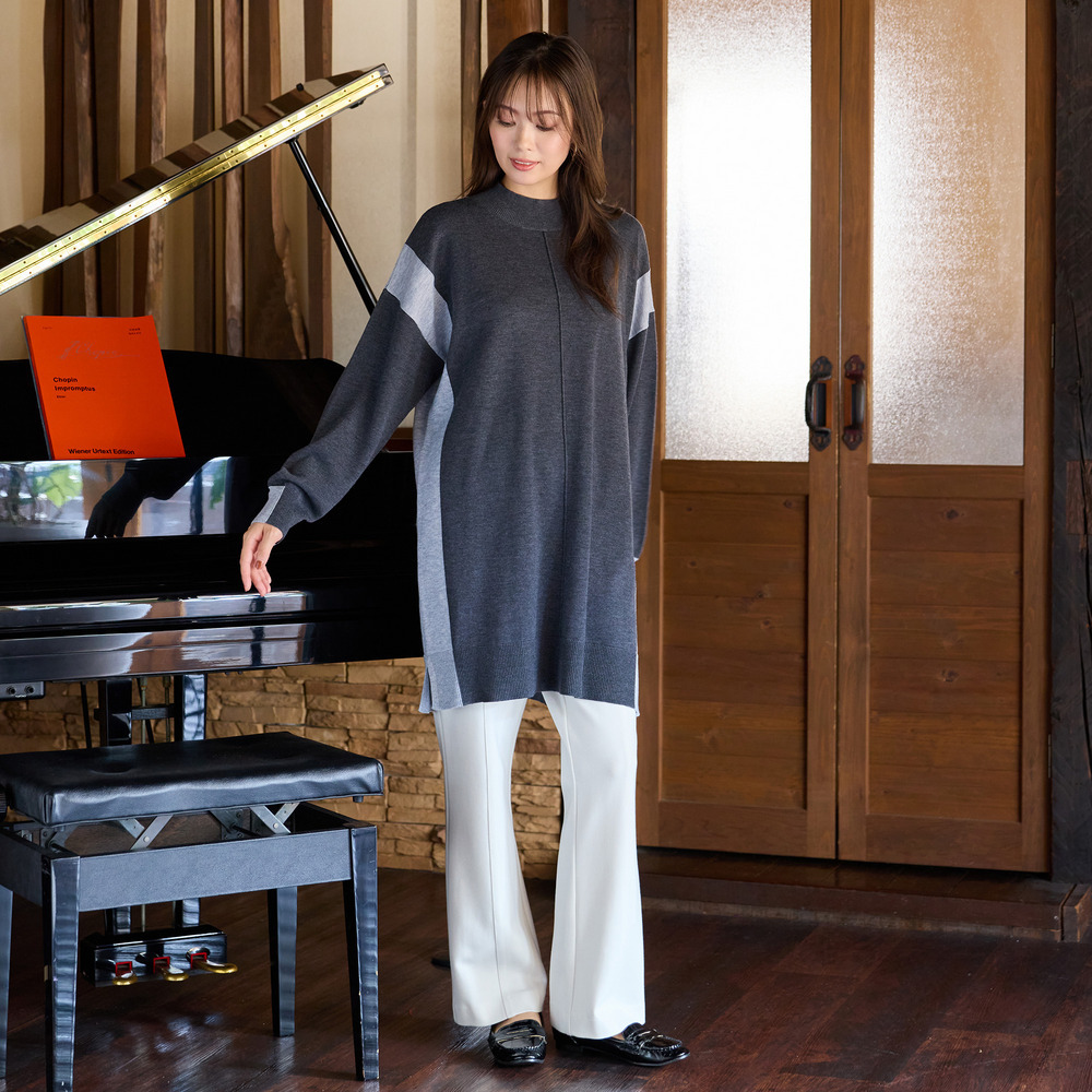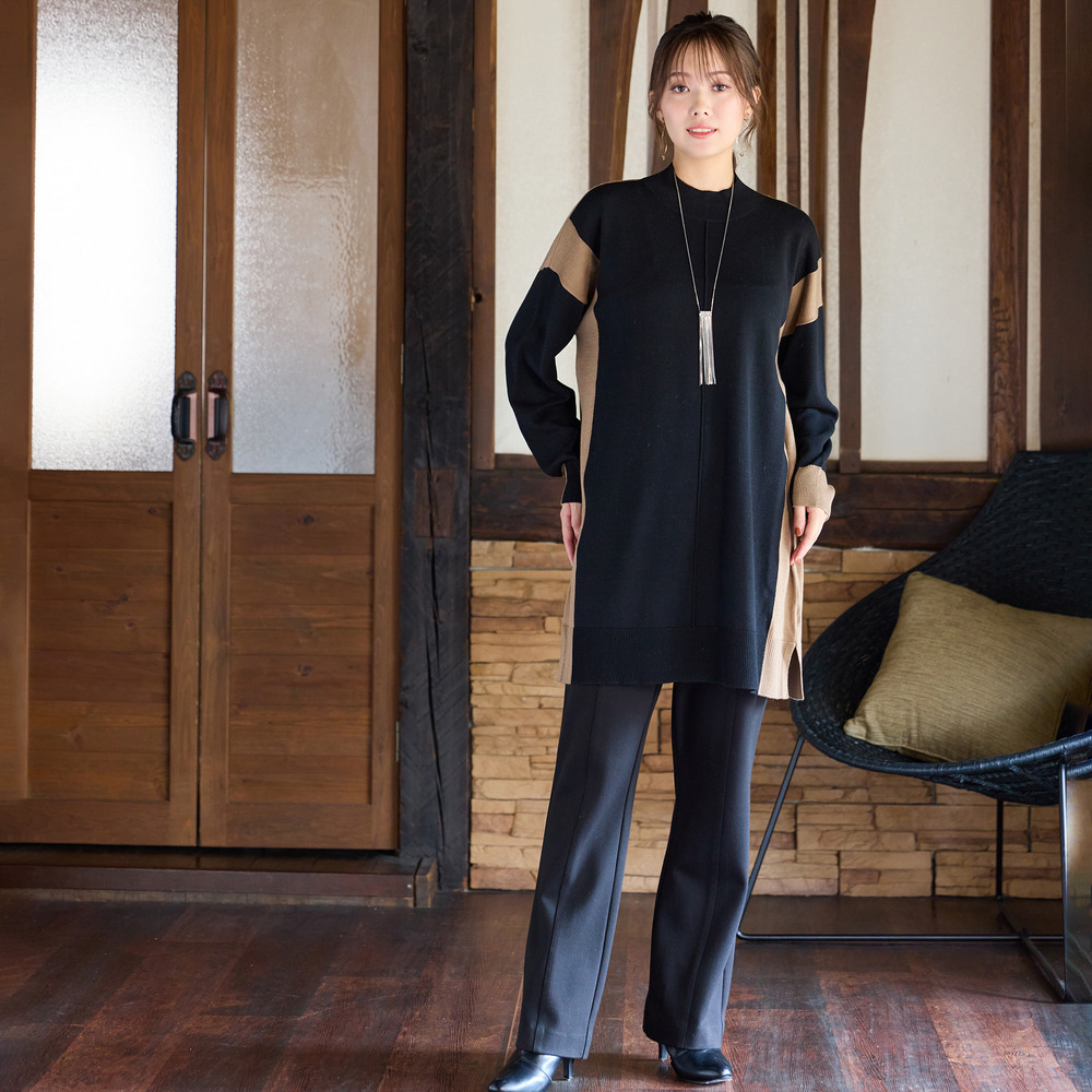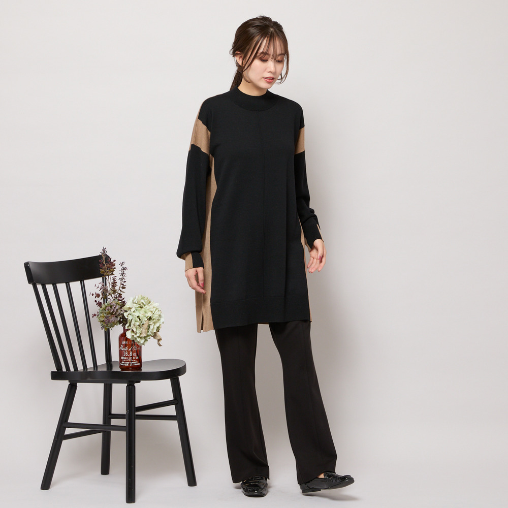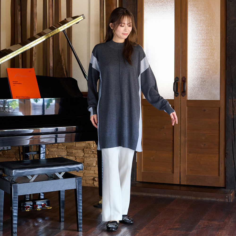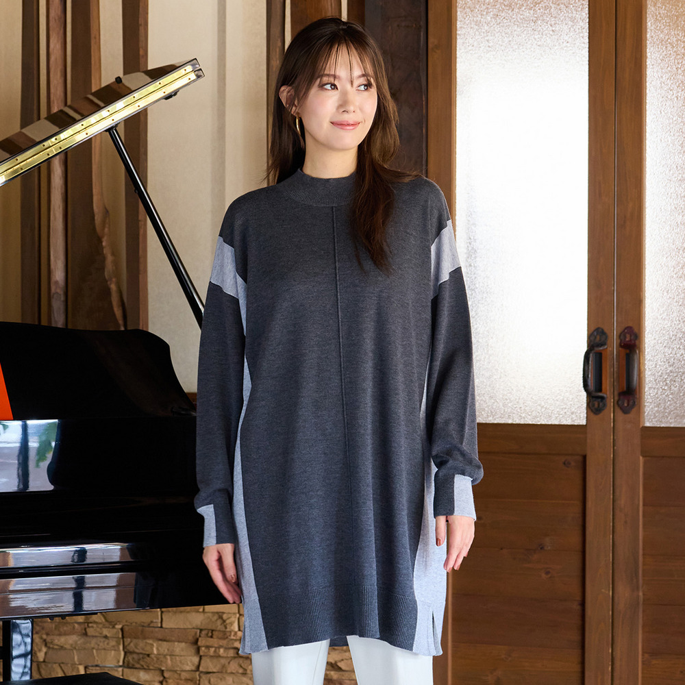 バイカラー配色・チュニック丈ハイネックニット