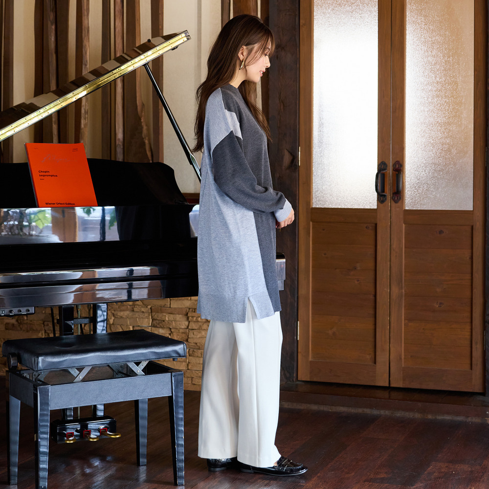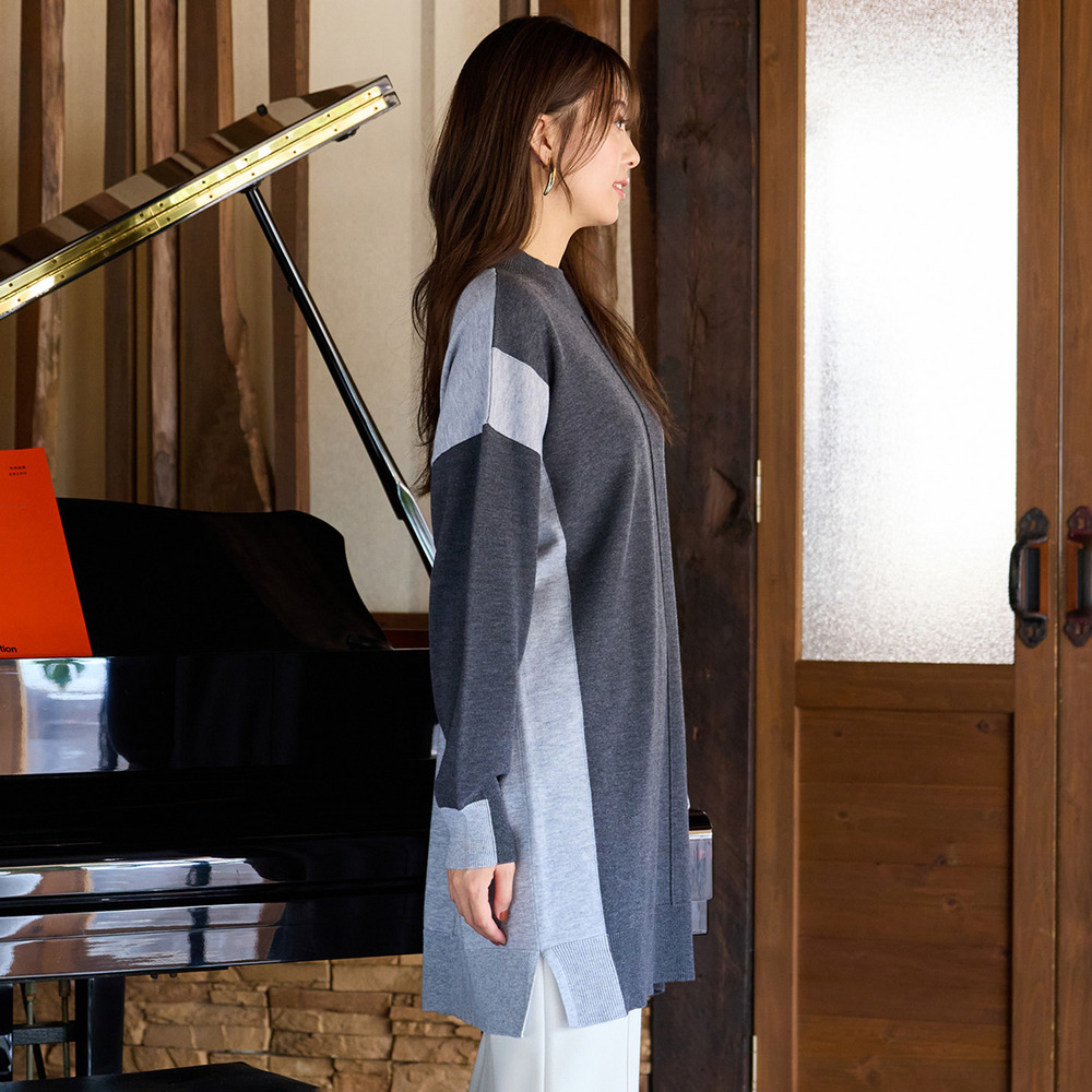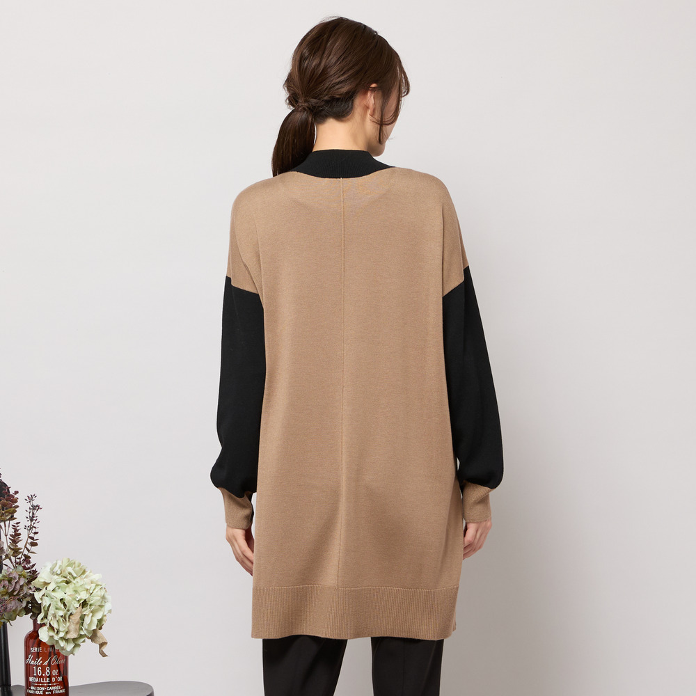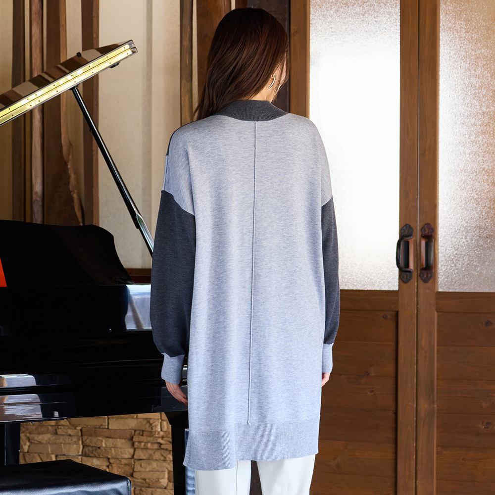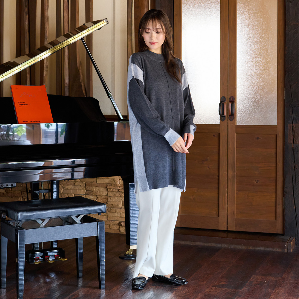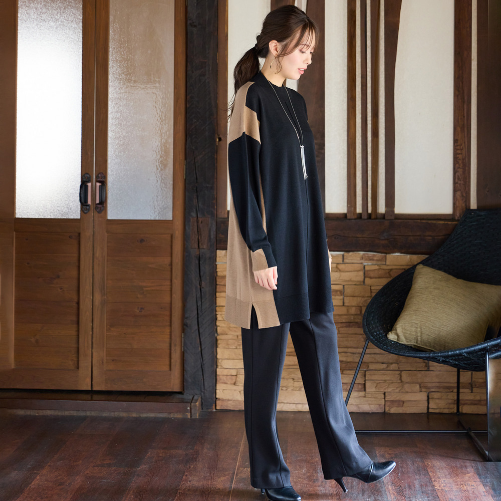 バイカラー配色・チュニック丈ハイネックニット